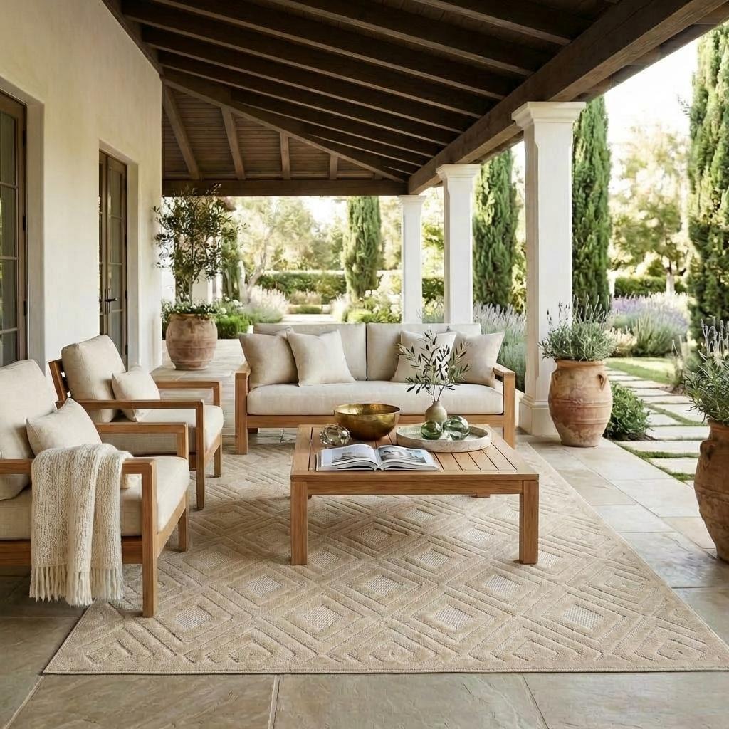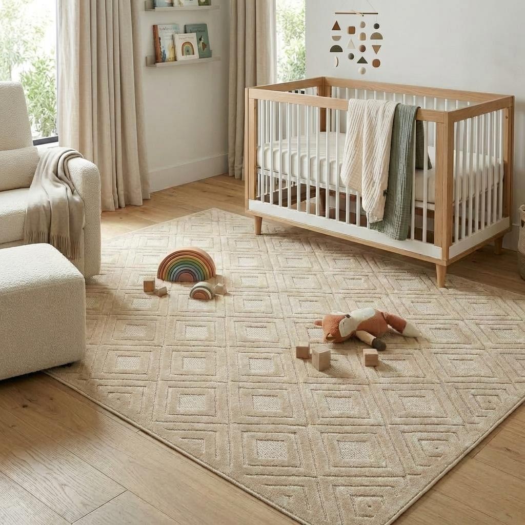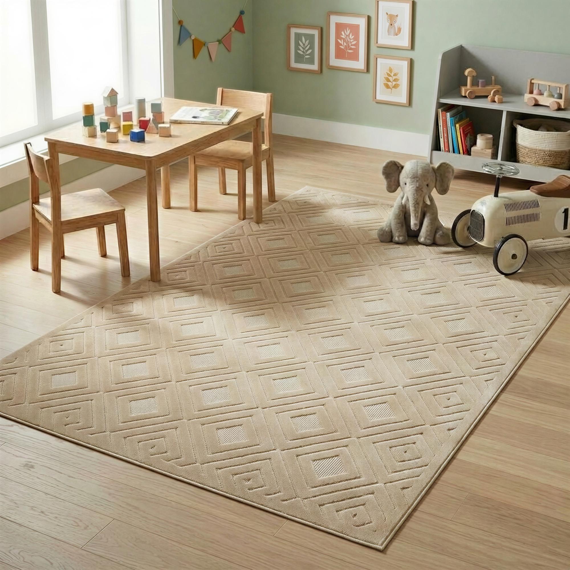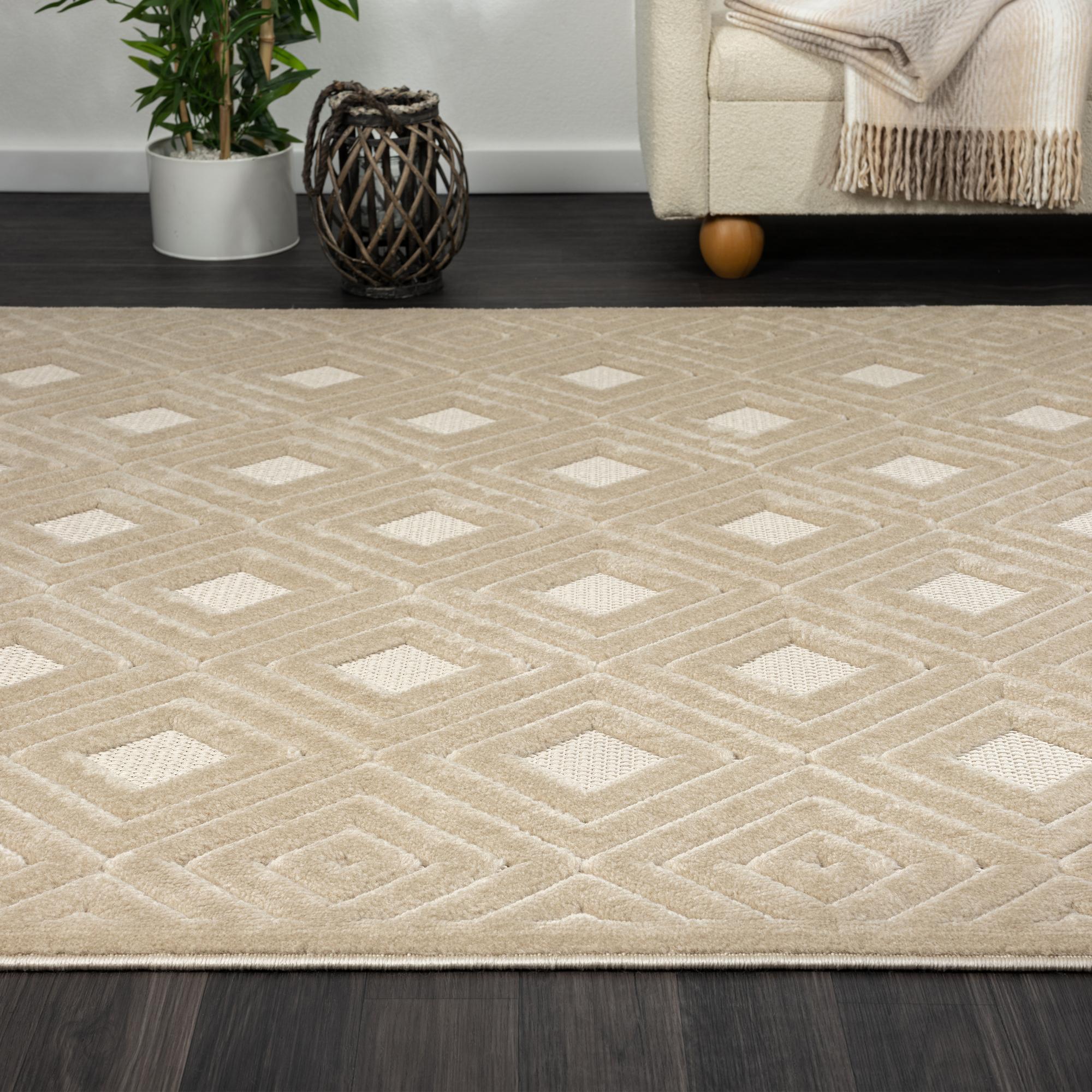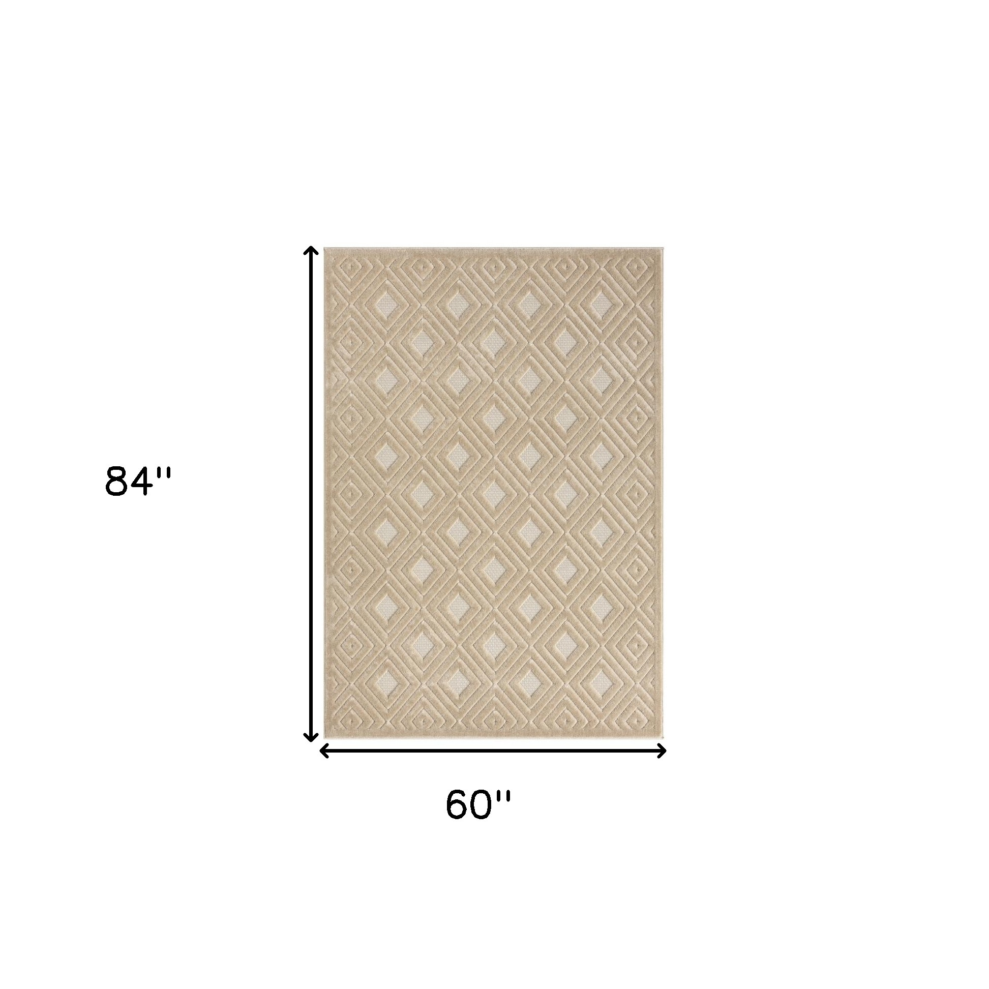 Add great coloration and comfortable texture to your space with this 5-foot x 7-foot beige geometric area rug. This rectangle shaped rug features a geometric design in beige to give it visual interest. A classic shape marries with good looking design for your space Ideal for spaces with kids and pets, this rug is stain resistant to help repel stains and spilled liquids. Place this area rug against a hardwood or tile floor and it will enliven your living space with style and sophistication. 0.39-inch H x 84-inch W x 60-inch D