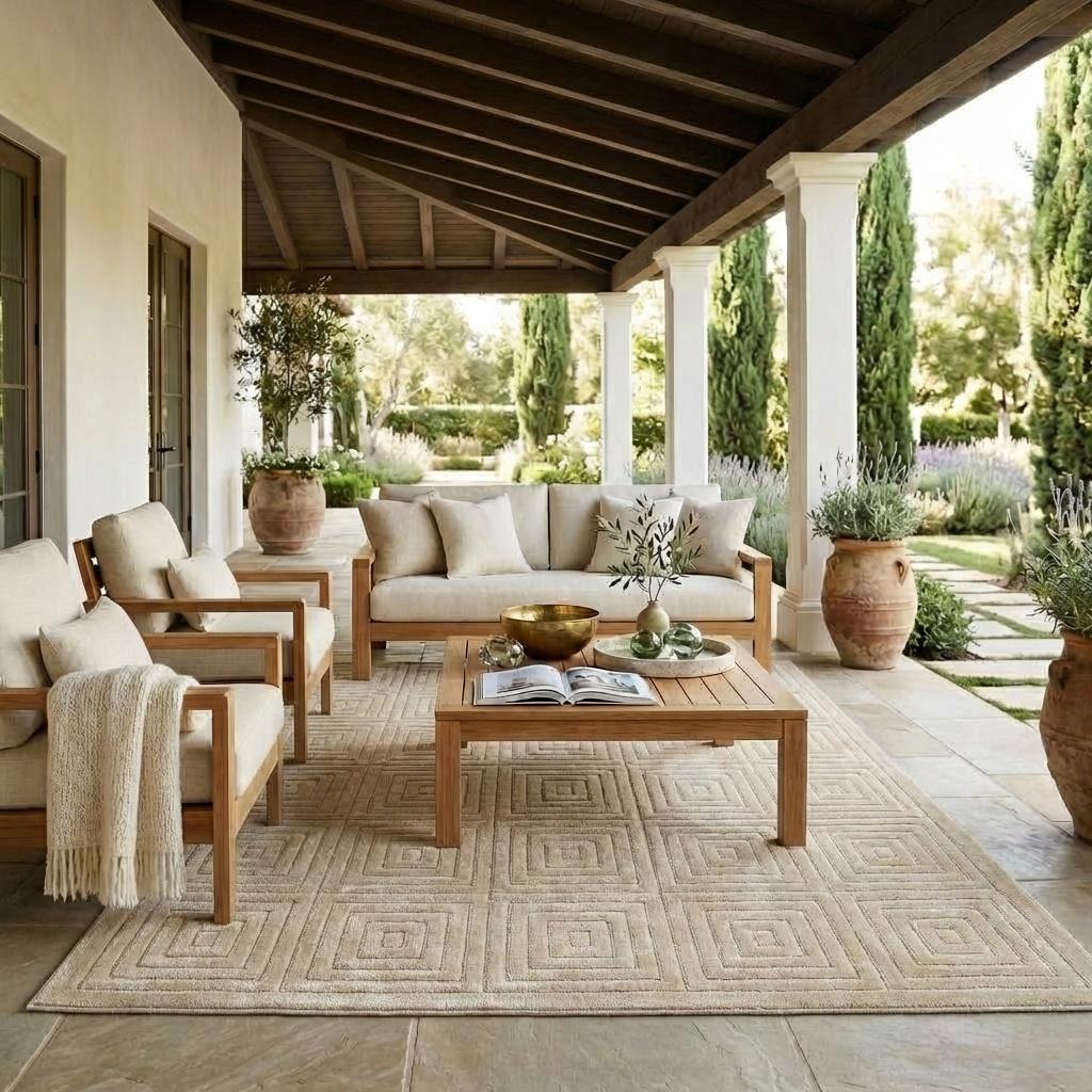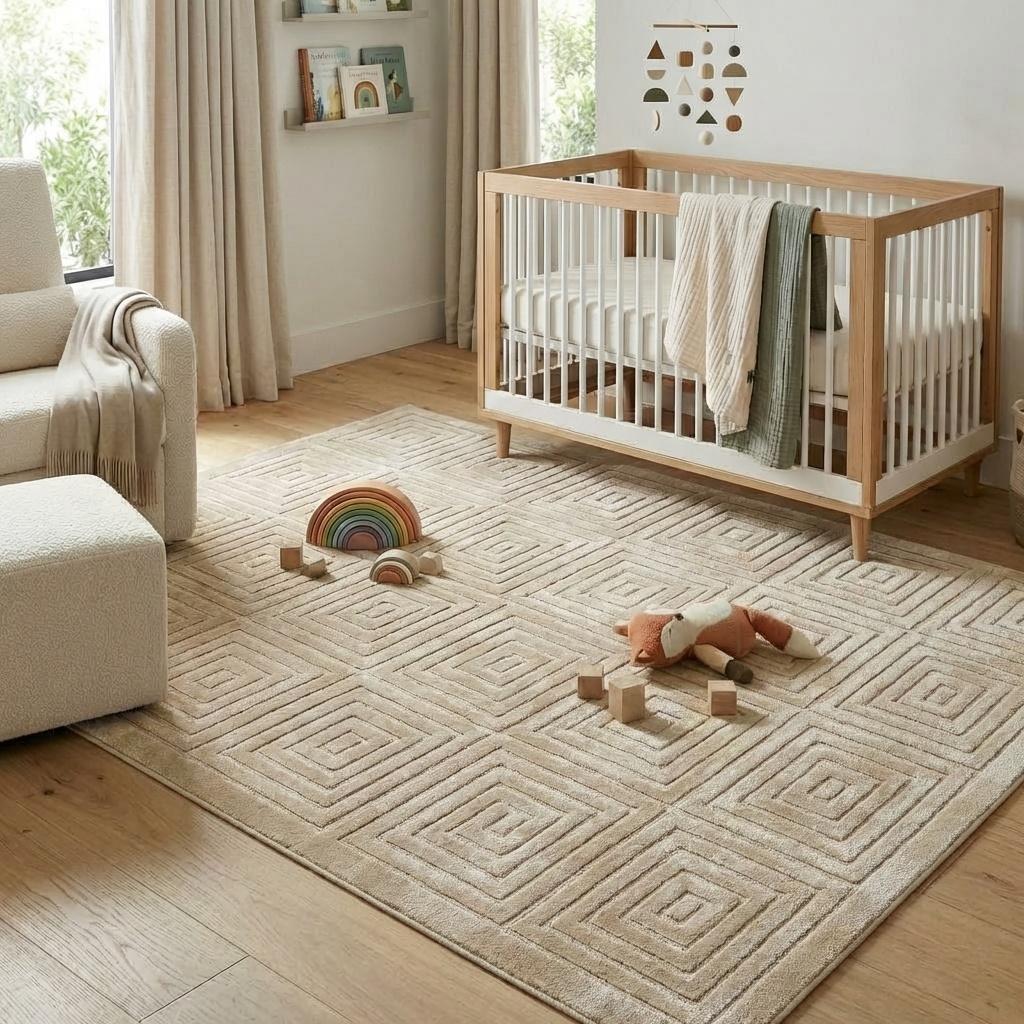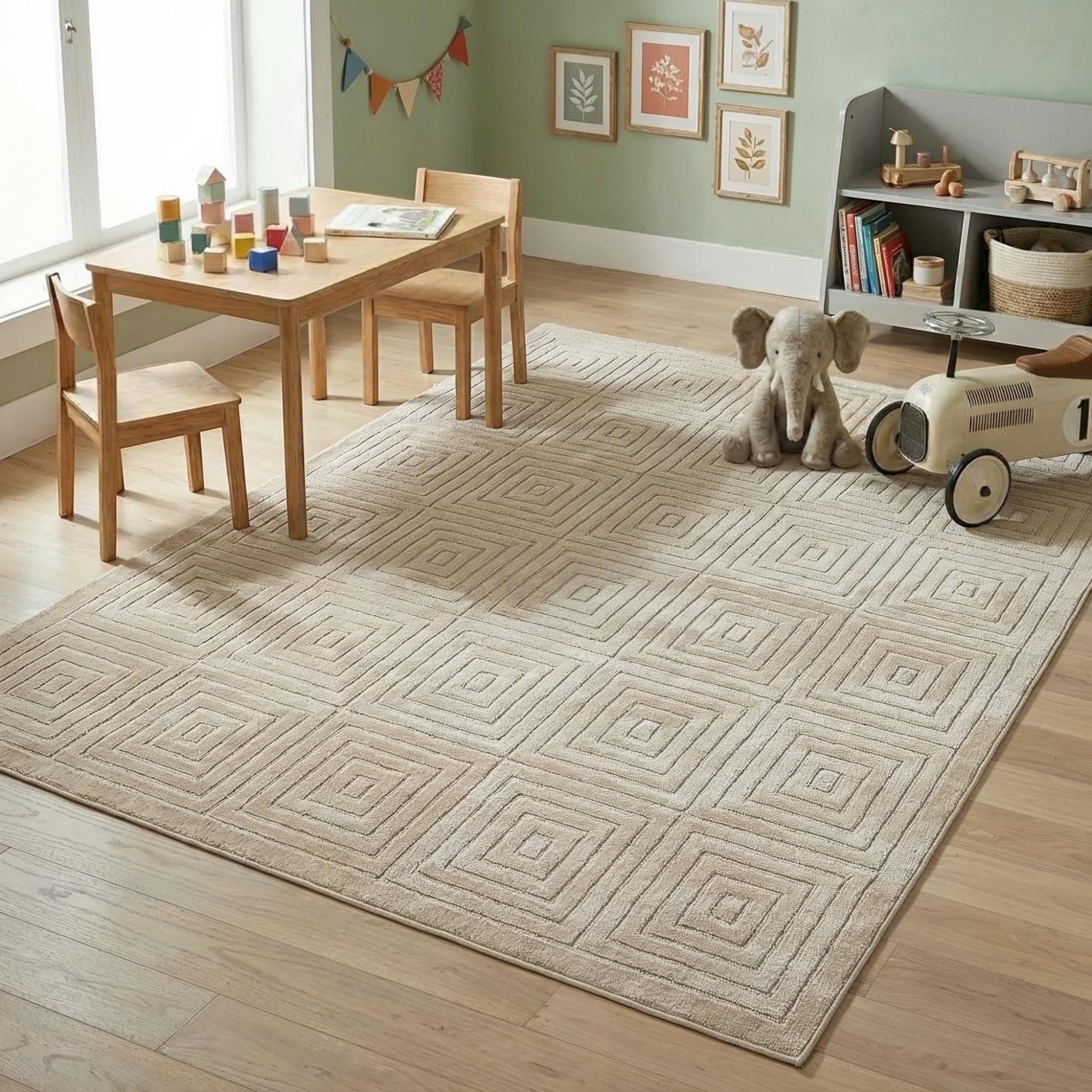 Add great coloration and comfortable texture to your space with this 5-foot x 7-foot beige geometric area rug. This rectangle shaped rug features a geometric design in beige to give it visual interest. A classic shape marries with good looking design for your space Ideal for spaces with kids and pets, this rug is stain resistant to help repel stains and spilled liquids. Area Rugs help to give warmth and sense of home to your space. 0.39-inch H x 84-inch W x 60-inch D