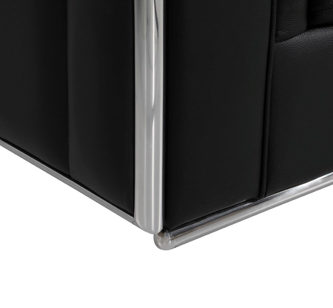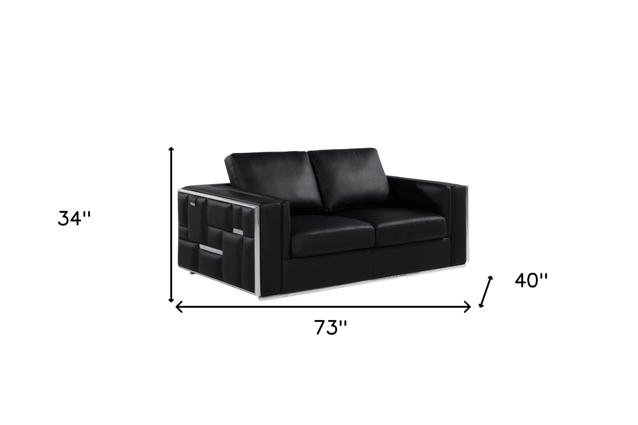 Made of top quality, supple leather, this 73-inch black and silver metallic leather loveseat will be the star of your space. The high grade premium leather used makes your lounging luxuriously comfortable and adds an elegant appeal to your space. Square arms offer a comfy place to rest and give this piece some interest and shape. Silver metallic steel legs effortlessly elevate the room and add a touch of contemporary design. A great showpiece for your room, this sofa is a must have. 34-inch H x 73-inch W x 40-inch D