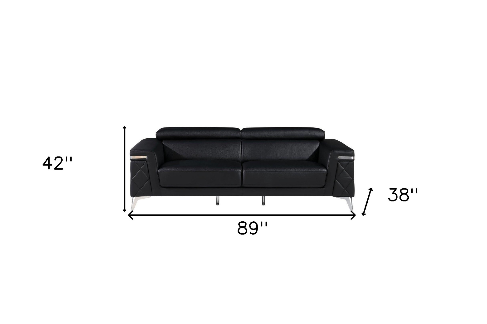 Superior construction from fabulously soft and high grade leather gives this 89-inch black italian leather sofa with silver legs a leg up on the competition. The premium leather used makes your lounging luxuriously comfortable and adds an elegant appeal to your space. Solid colors give you lots of decorative options and are easy to work into your decor scheme. Sinuous springs construction gives this piece strong support and makes it comfortable to sit even for long periods of time. Square arms offer a comfy place to rest. Silver stainless steel legs effortlessly elevate the room and add a touch of contemporary design. Built to last, this sofa will be a great centerpiece for your room. 42-inch H x 89-inch W x 38-inch D