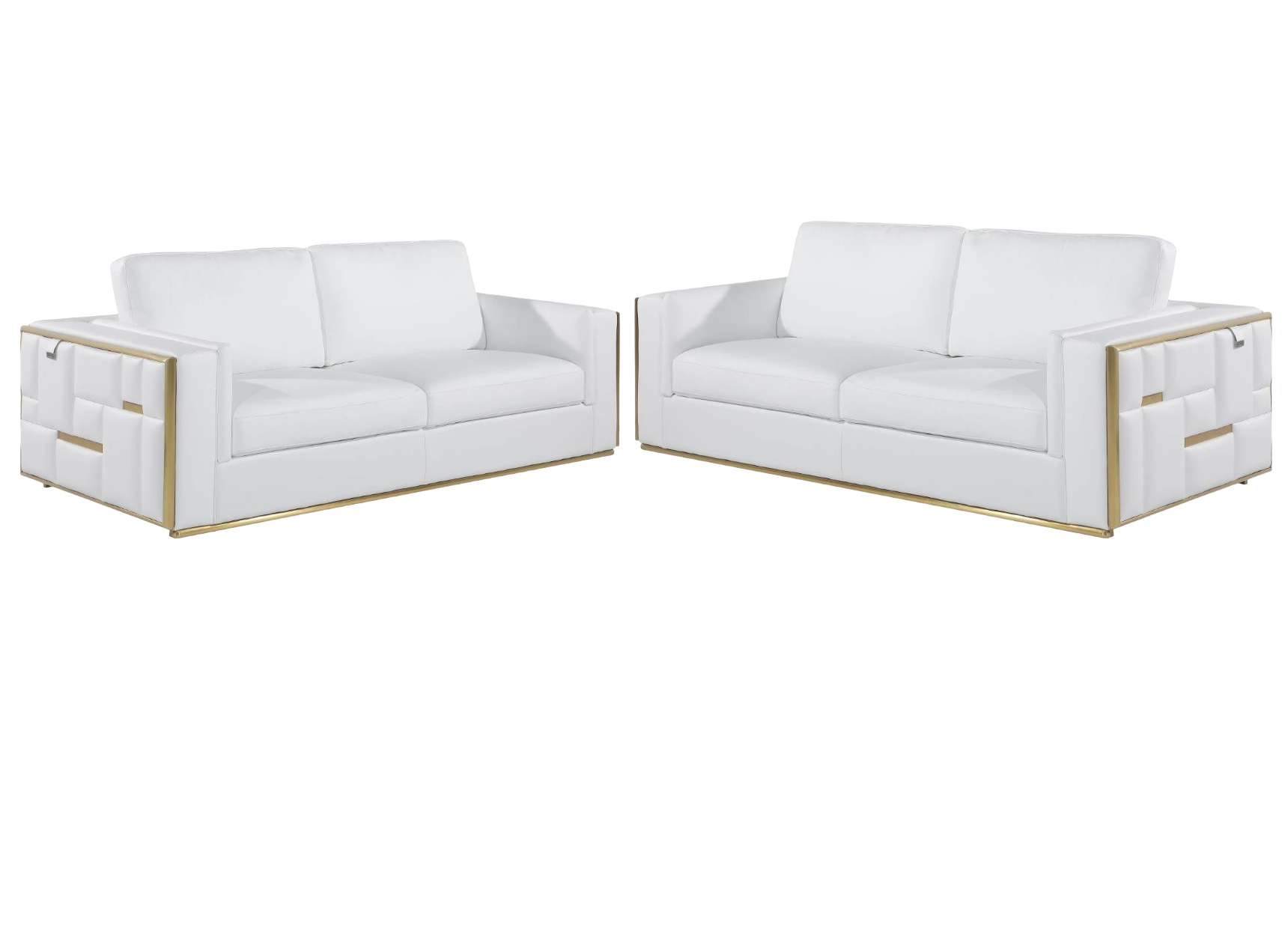 Step into a world of unparalleled seating comfort with our remarkable two piece white italian leather five person seating set. Upholstered in supple and luxurious italian leather, this set has a rich and warm appeal. The presence of coil spring seat construction helps distribute weight evenly, reducing pressure points. The inclusion of a loveseat into your mix allows a fashionable seating option in a compact design. 40-inch H x 89-inch W x 34-inch D