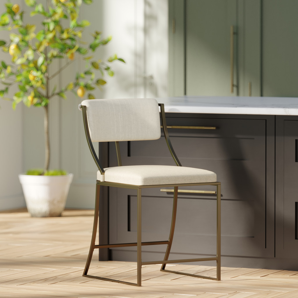 Comfort and design come together nicely in this 25-inch beige and antiqued brass steel low back counter height bar chair. The base of this stool is made from steel in a antiqued brass color that is a nice contrast to the beige upholstered seat. A low back mixed with a rectangle shaped seat design makes this chair both comfortable and fashionable. Designed with a footrest for comfort and convenience. 37-inch H x 21-inch W x 23.5-inch D