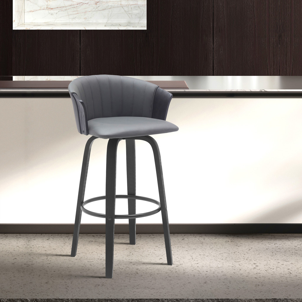 Bring a trendy bar vibe to your space, with this 26-inch gray and black faux leather counter height swivel bar chair. The base of this stool is made from manufactured wood in a black color that is a nice contrast to the gray faux leather seat. The bucket shape of the seat combines with a full_back to give this chair a comfortable and fashionable look. Designed with armrests for your comfort, this chair also features a footrest for comfort and convenience. 34-inch h x 20-inch w x 21-inch d.