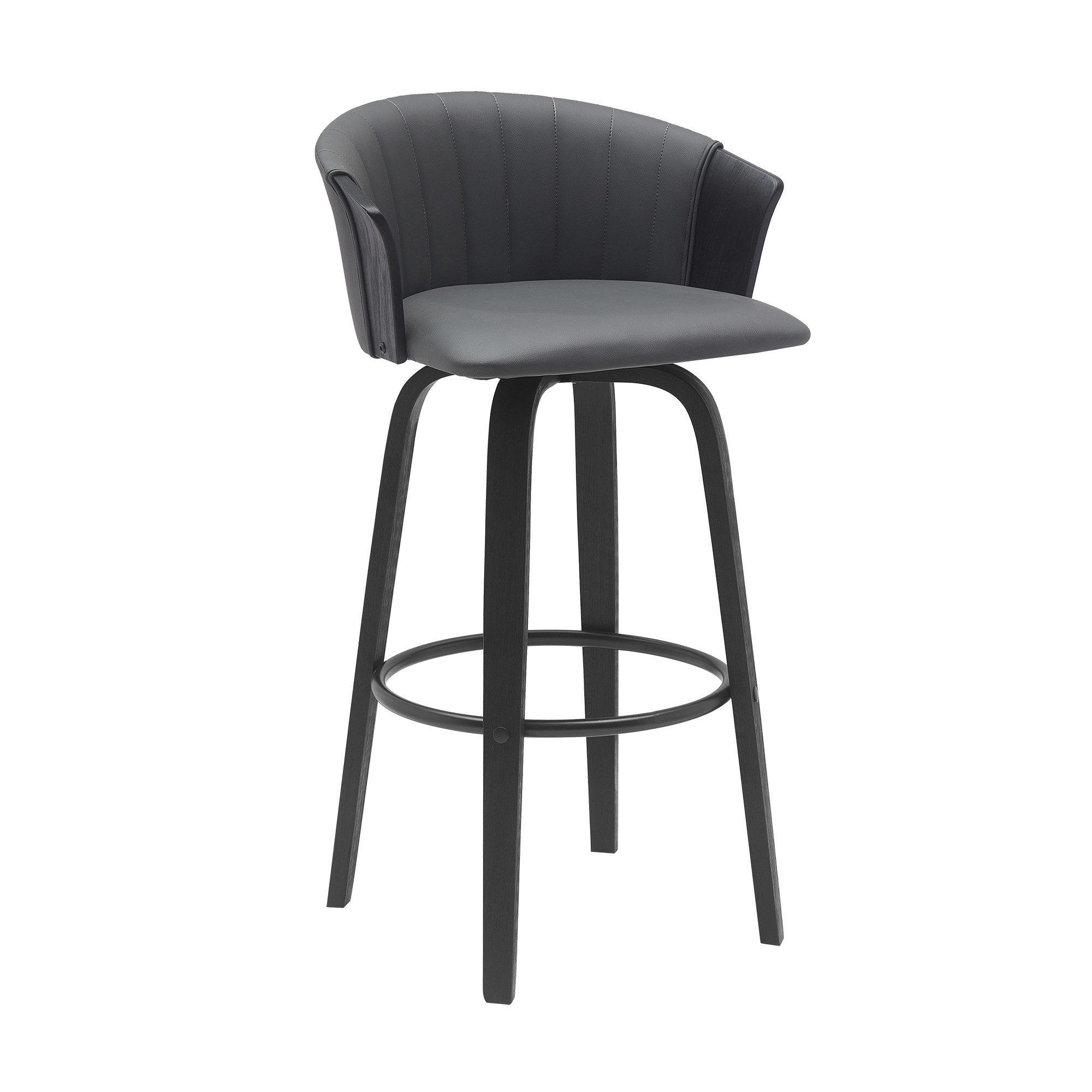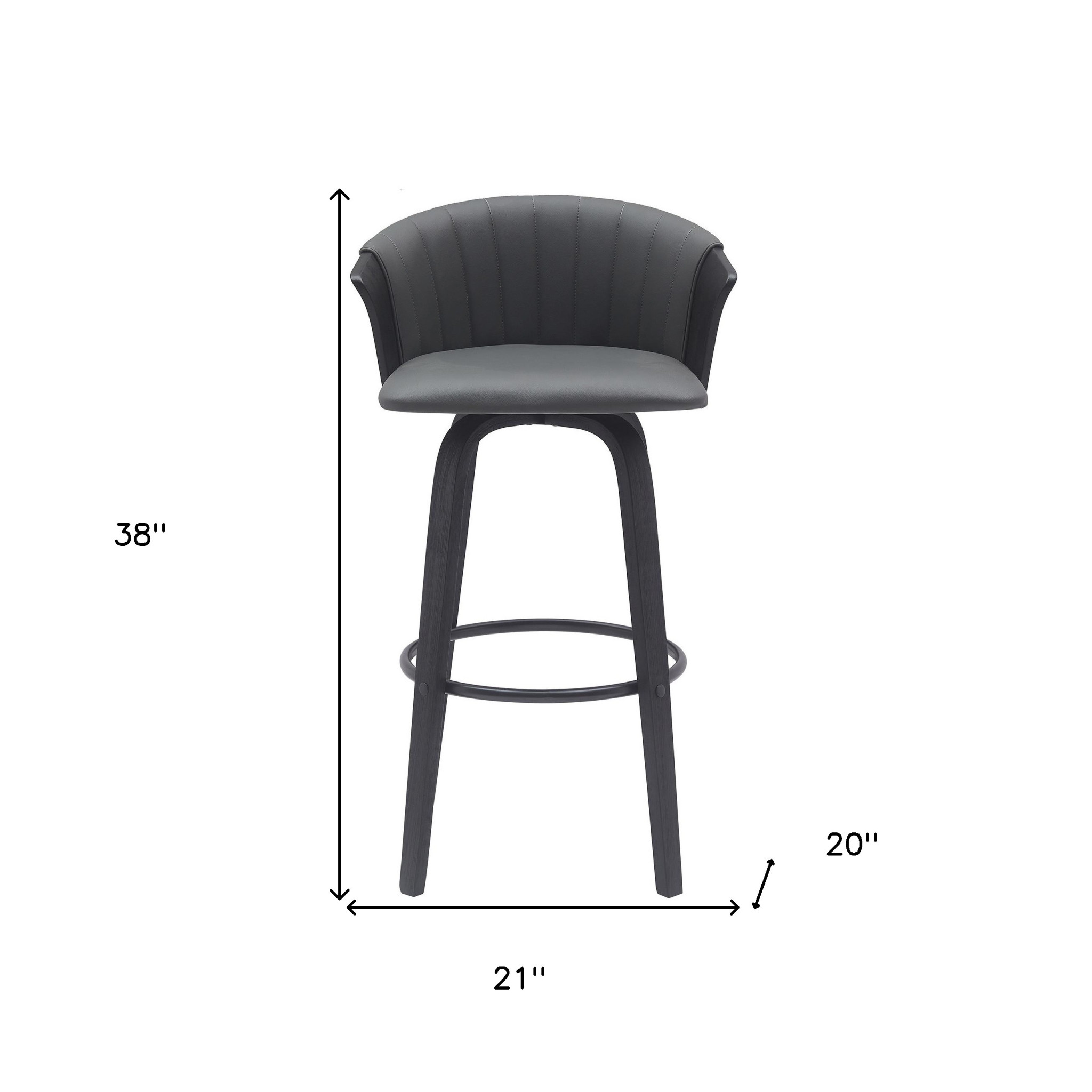 This 30-inch gray and black faux leather swivel bar height bar chair will be the perfect way to add some cool design and utility to your space similar to what you find in your favorite cafes or pubs. Quality construction from black manufactured wood combines with gray faux leather to give this stool a fresh and updated look. A full back mixed with a bucket shaped seat design makes this chair both comfortable and fashionable. Designed with armrests for your comfort, this chair also features a footrest for comfort and convenience. 38-inch H x 20-inch W x 21-inch D