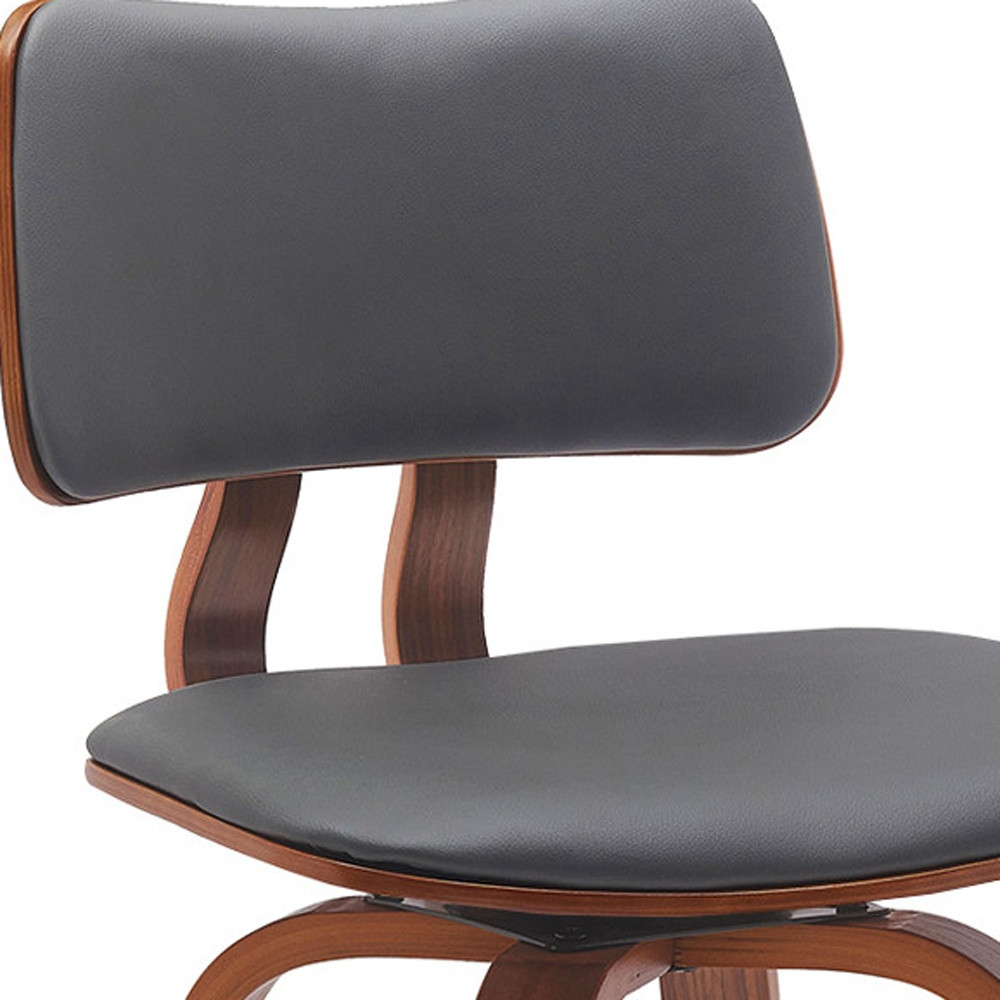 Bring a trendy bar vibe to your space, with this 26-inch gray and wood brown faux leather swivel low back counter height bar chair. A wood brown manufactured wood frame is finished off with a gray faux leather seat that is the epitome of quality construction and design. A low back mixed with a square shaped seat design makes this chair both comfortable and fashionable. Designed with a footrest for comfort and convenience. 36.5-inch H x 18.5-inch W x 18-inch D