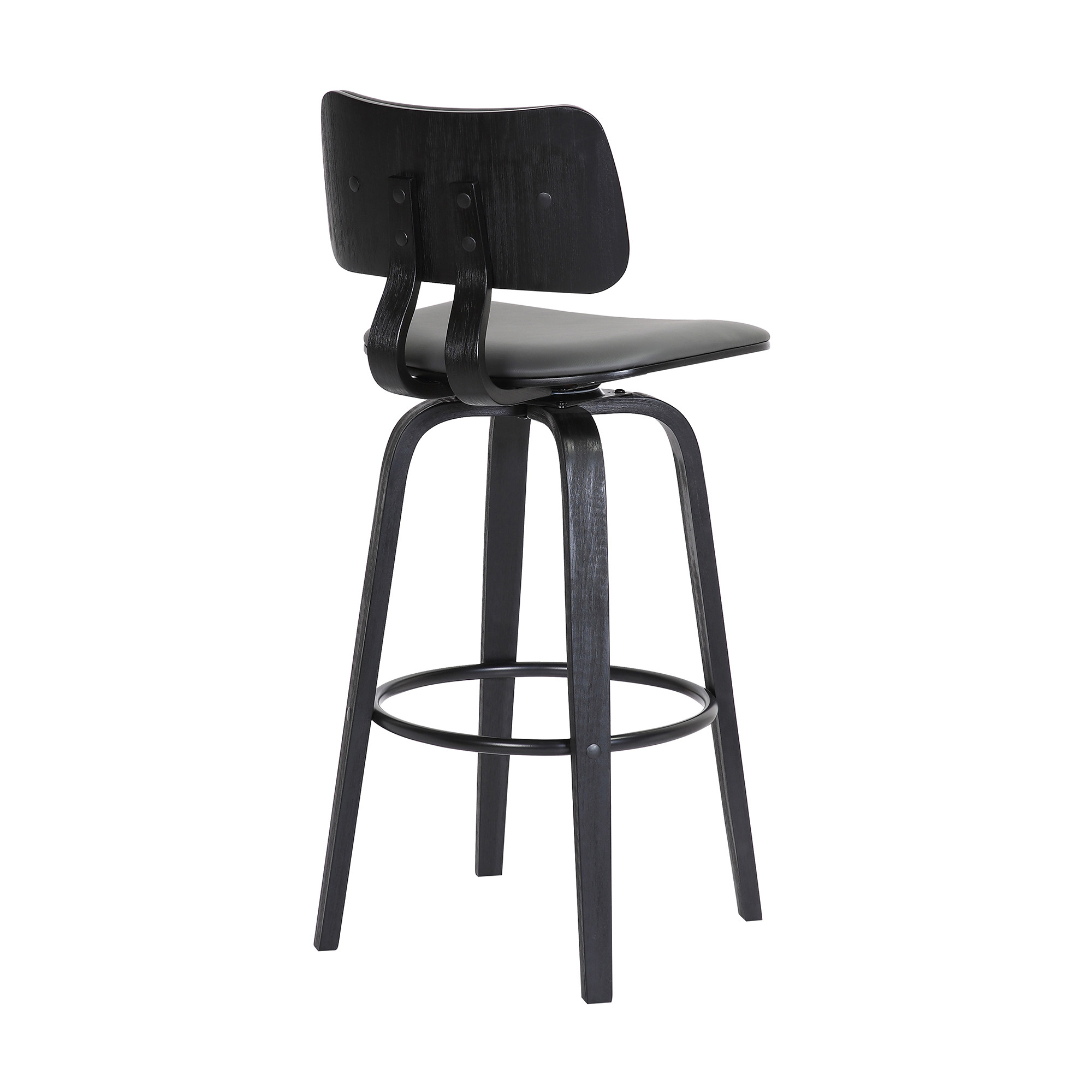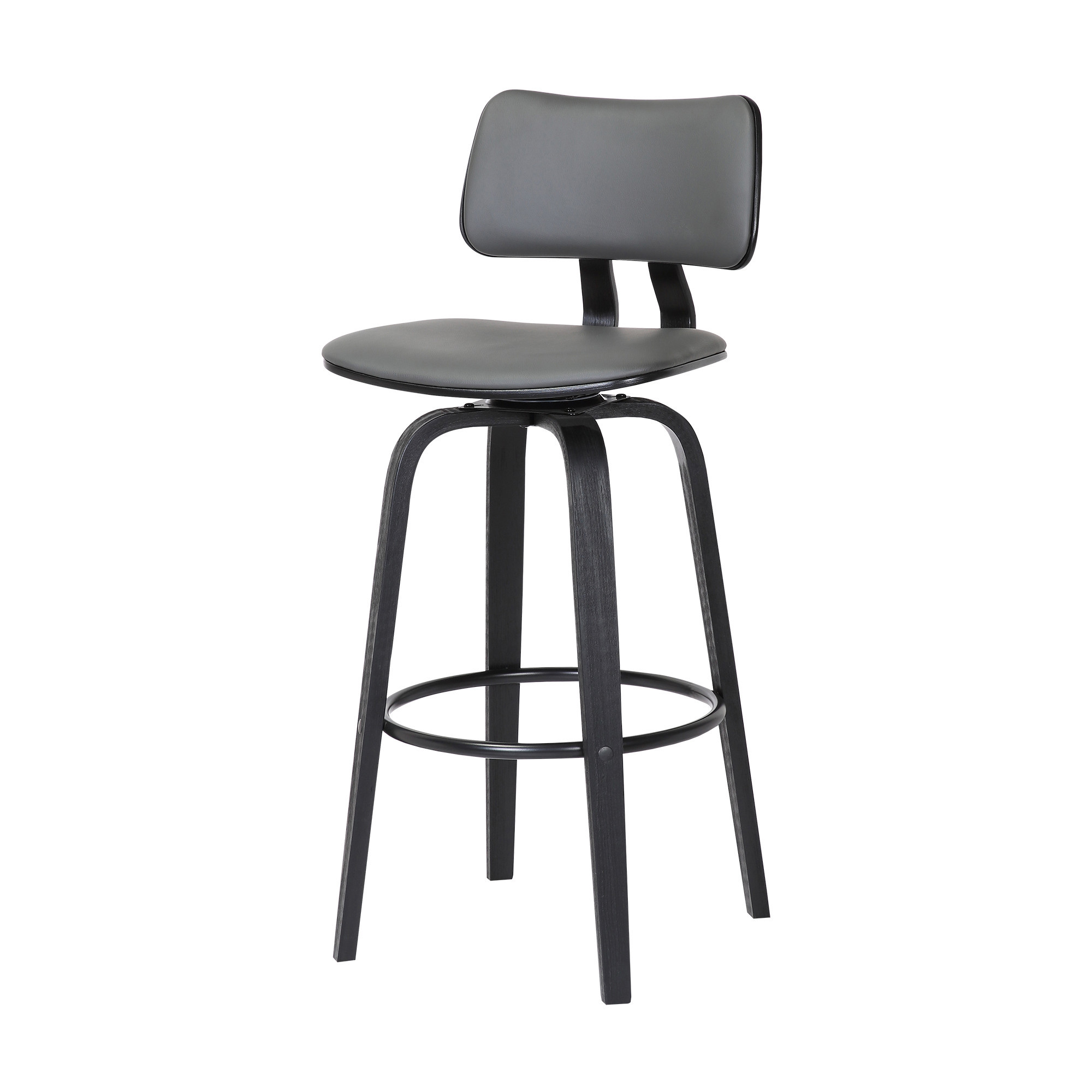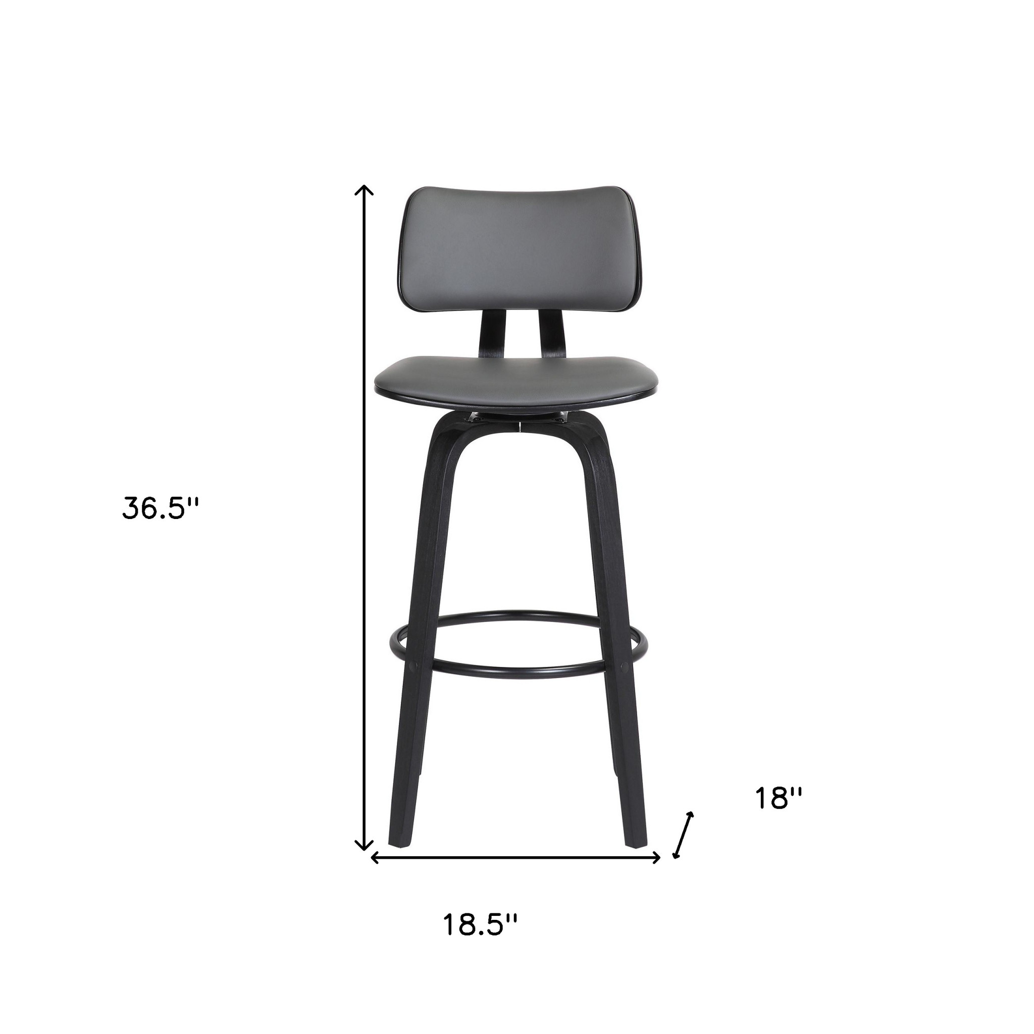 The perfect way to add some extra seating in your home, this 26-inch gray and black faux leather swivel low back counter height bar chair will elevate the look and vibe of your room. A black manufactured wood frame is finished off with a gray faux leather seat that is the epitome of quality construction and design. The square shape of the seat combines with a low back to give this chair a comfortable and fashionable look. Designed with a footrest for comfort and convenience. 36.5-inch H x 18.5-inch W x 18-inch D