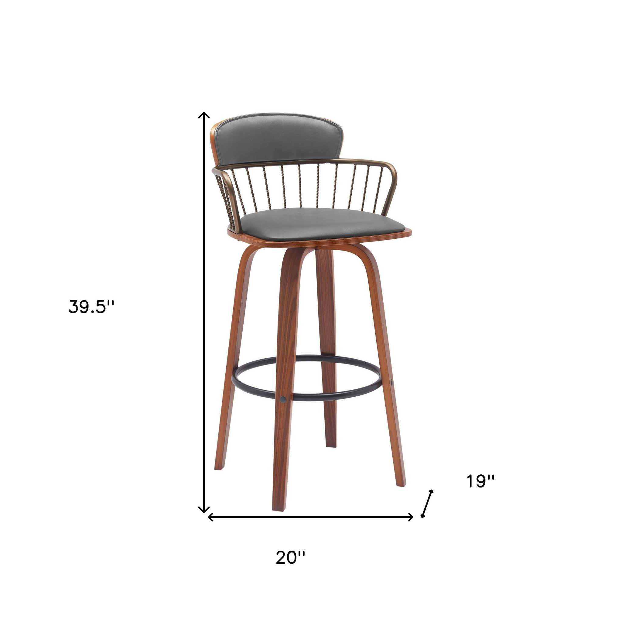 This 30-inch gray and wood brown faux leather swivel low back bar height bar chair will be the perfect way to add some cool design and utility to your space similar to what you find in your favorite cafes or pubs. The gray faux leather seat of this stool is a nice contrast to the high quality, wood brown manufactured wood of the base. The square shape of the seat combines with a low back to give this chair a comfortable and fashionable look. Designed with armrests for your comfort, this chair also features a footrest for comfort and convenience. 39.5-inch H x 19-inch W x 20-inch D