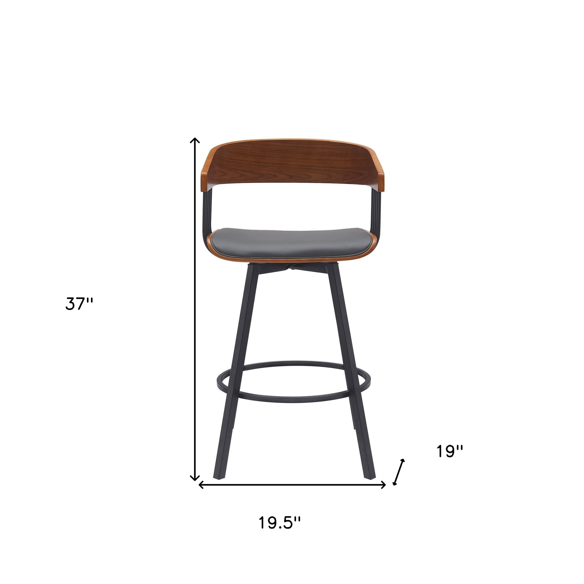 Comfortable enough to sit in for awhile, this 27-inch gray and black faux leather and metal swivel counter height bar chair will transcend the look of your room. A black metal frame is finished off with a gray faux leather seat that is the epitome of quality construction and design. Not only good looking and stylish, this chair features a bucket shaped seat and a full back for the ultimate in comfort and enjoyment. Designed with armrests for your comfort, this chair also features a footrest for comfort and convenience. 37-inch H x 19-inch W x 19.5-inch D