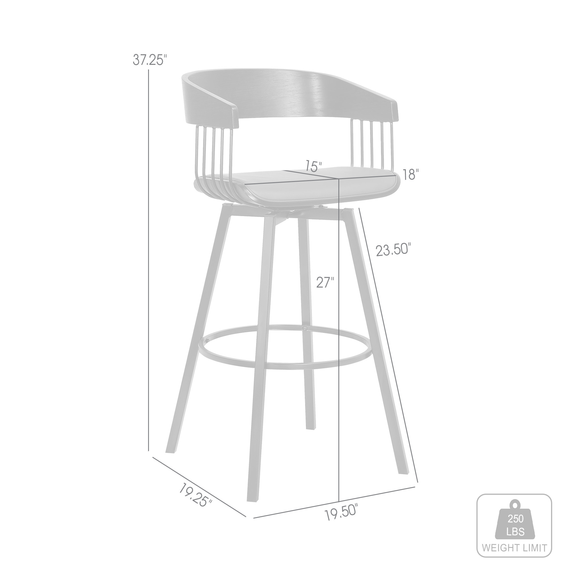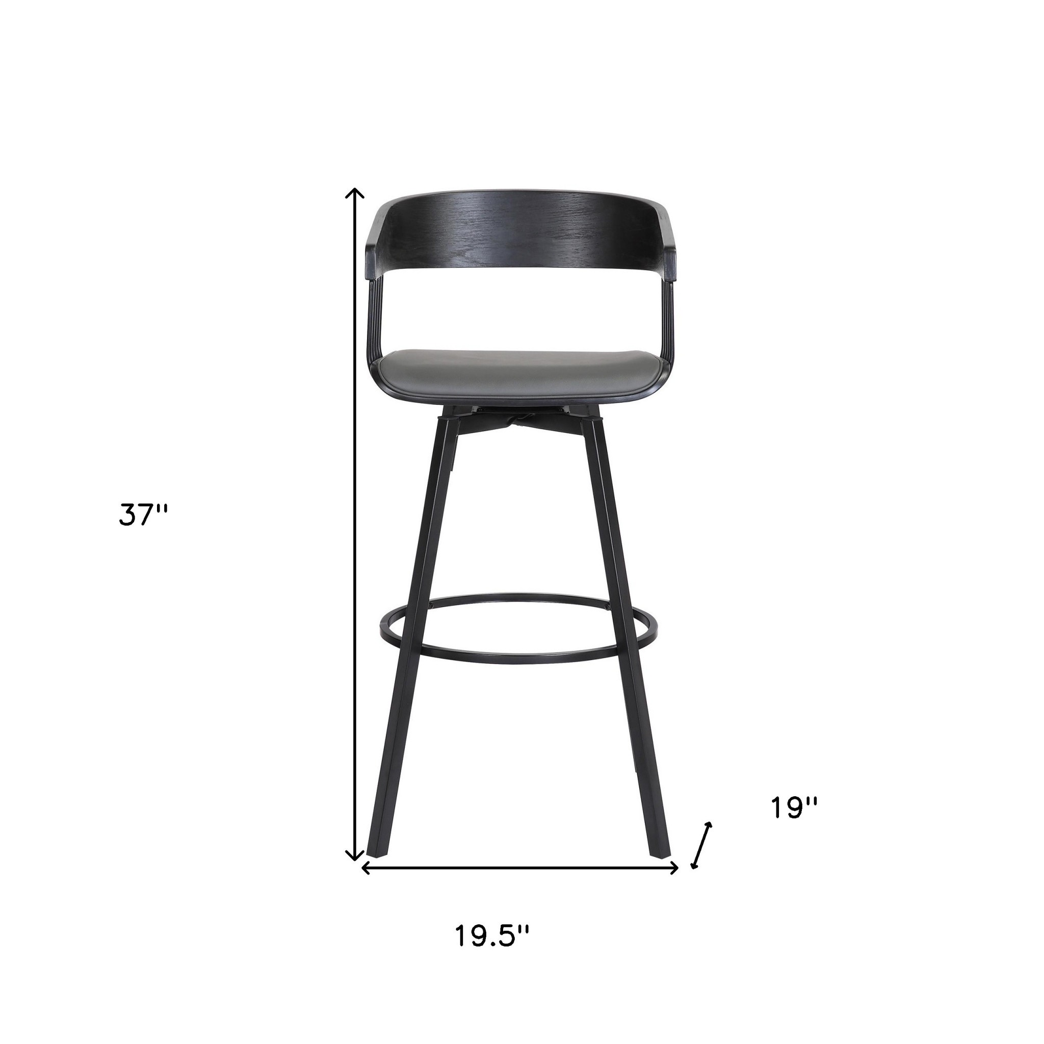 With this 27-inch gray and black faux leather and metal swivel counter height bar chair you can add design and extra seating to your space. The base of this stool is made from metal in a black color that is a nice contrast to the gray faux leather seat. The bucket shape of the seat combines with a full back to give this chair a comfortable and fashionable look. Designed with armrests for your comfort, this chair also features a footrest for comfort and convenience. 37-inch H x 19-inch W x 19.5-inch D