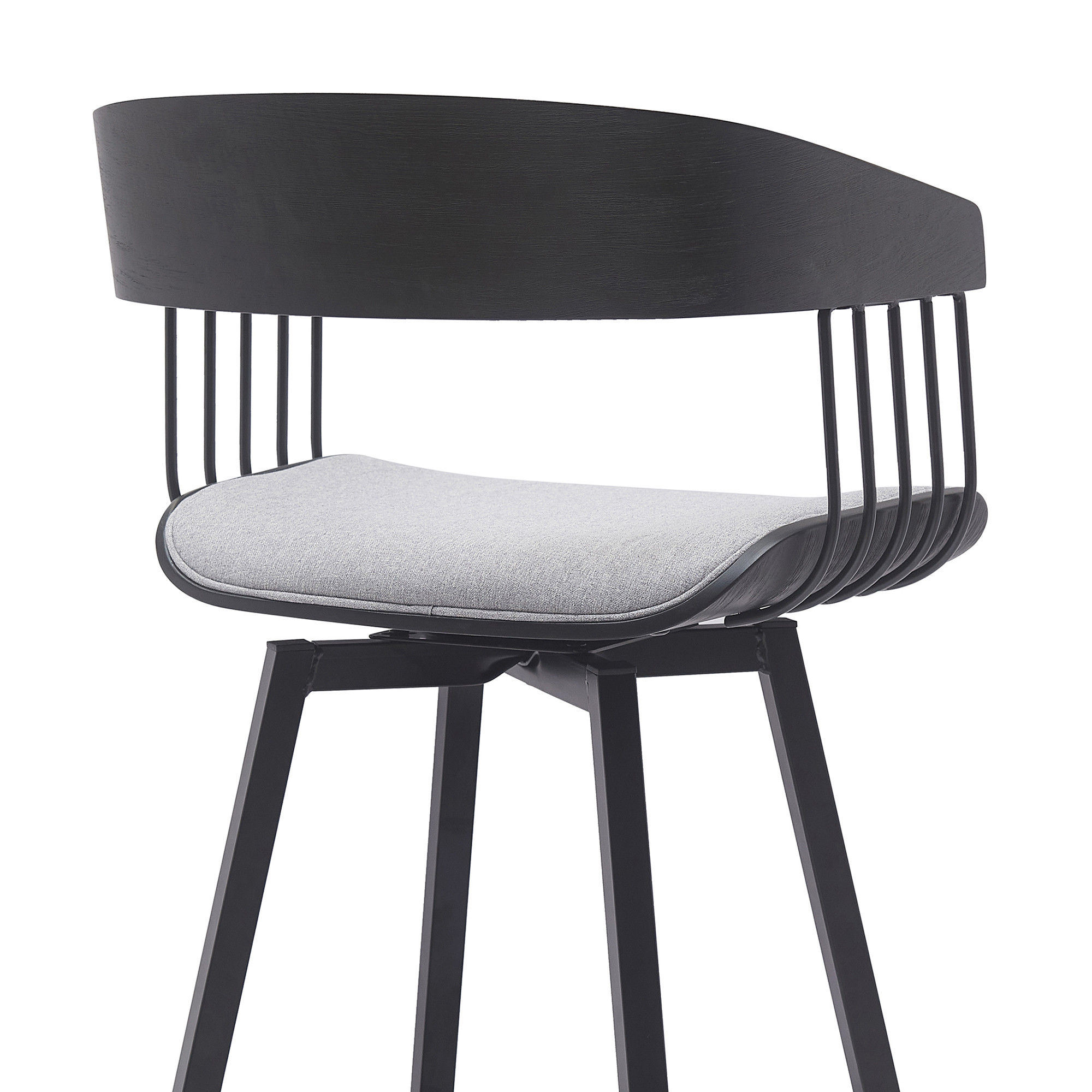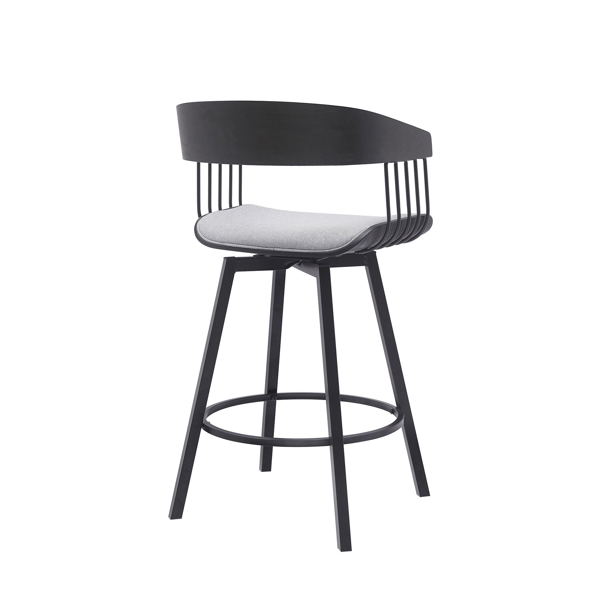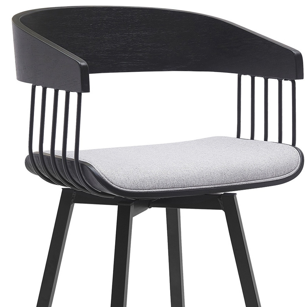 Comfort and design come together nicely in this 27-inch light gray and black fabric and metal swivel counter height bar chair. The base of this stool is made from metal in a black color that is a nice contrast to the light gray fabric seat. A full back mixed with a bucket shaped seat design makes this chair both comfortable and fashionable. Designed with armrests for your comfort, this chair also features a footrest for comfort and convenience. 37-inch H x 19-inch W x 19.5-inch D