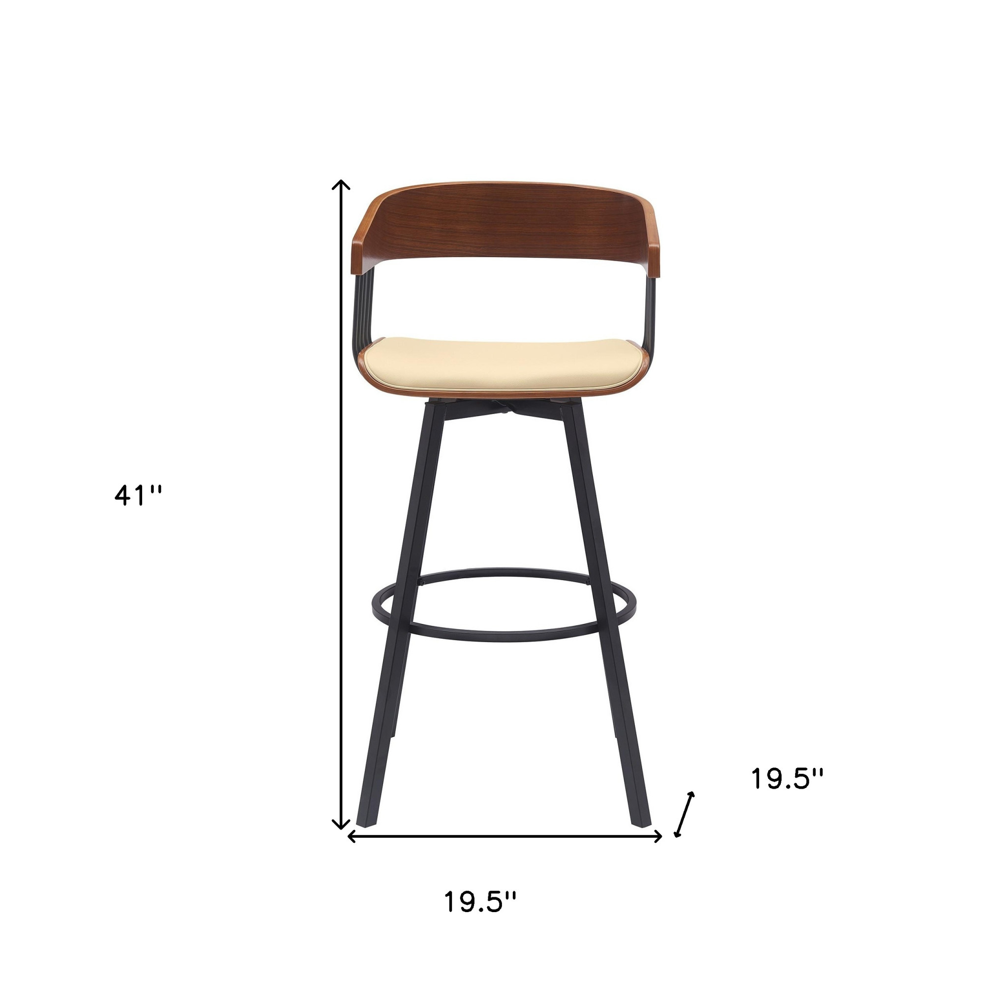 The perfect way to add some extra seating in your home, this 31-inch cream and black faux leather and metal swivel bar height bar chair will elevate the look and vibe of your room. A black metal frame is finished off with a cream faux leather seat that is the epitome of quality construction and design. Not only good looking and stylish, this chair features a bucket shaped seat and a full back for the ultimate in comfort and enjoyment. Designed with armrests for your comfort, this chair also features a footrest for comfort and convenience. 41-inch H x 19.5-inch W x 19.5-inch D
