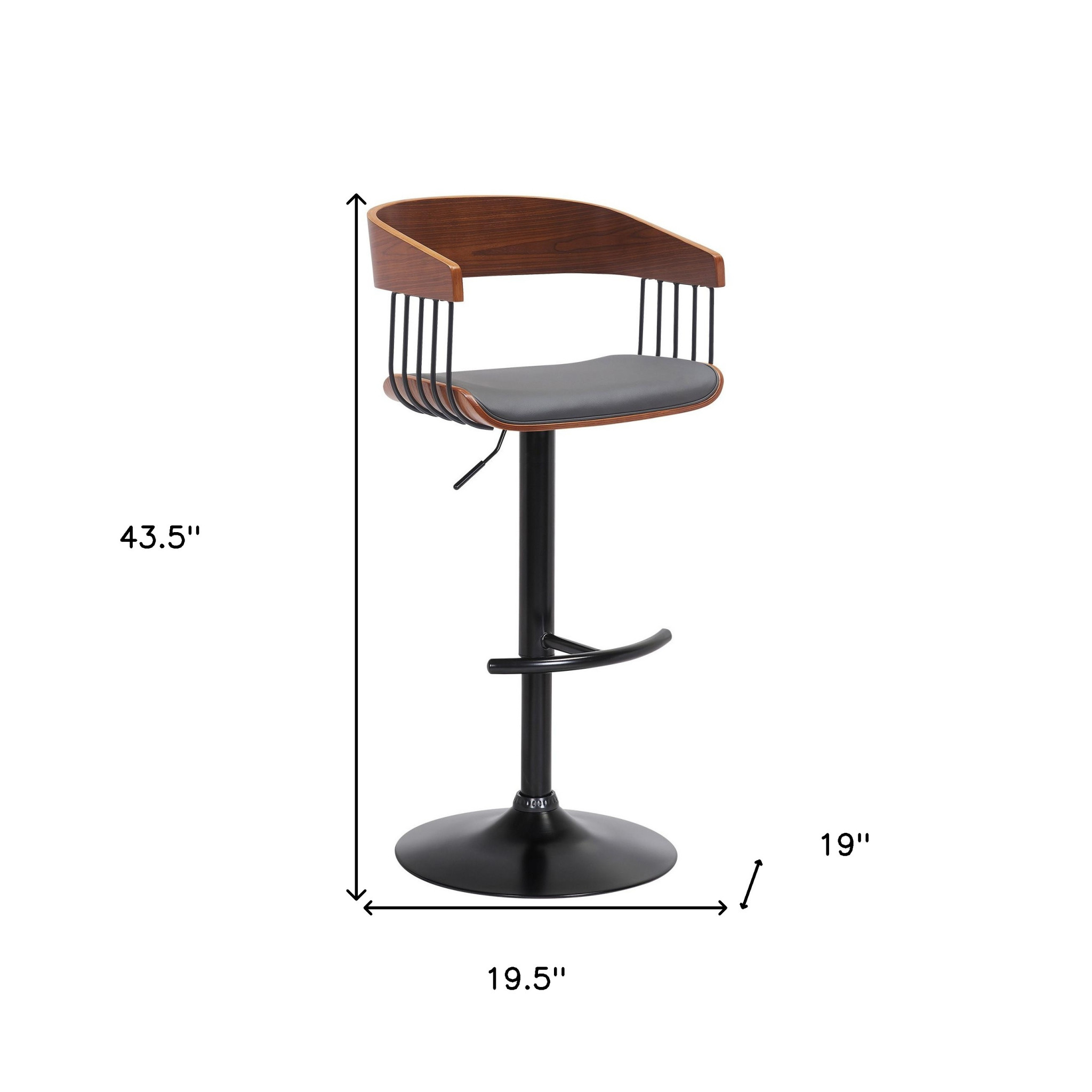 The perfect way to add some extra seating in your home, this gray and black faux leather and metal swivel adjustable height bar chair will elevate the look and vibe of your room. The base of this stool is made from metal in a black color that is a nice contrast to the gray faux leather seat. Not only good looking and stylish, this chair features a bucket shaped seat and a full back for the ultimate in comfort and enjoyment. Designed with armrests for your comfort, this chair also features a footrest for comfort and convenience. 43.5-inch H x 19-inch W x 19.5-inch D