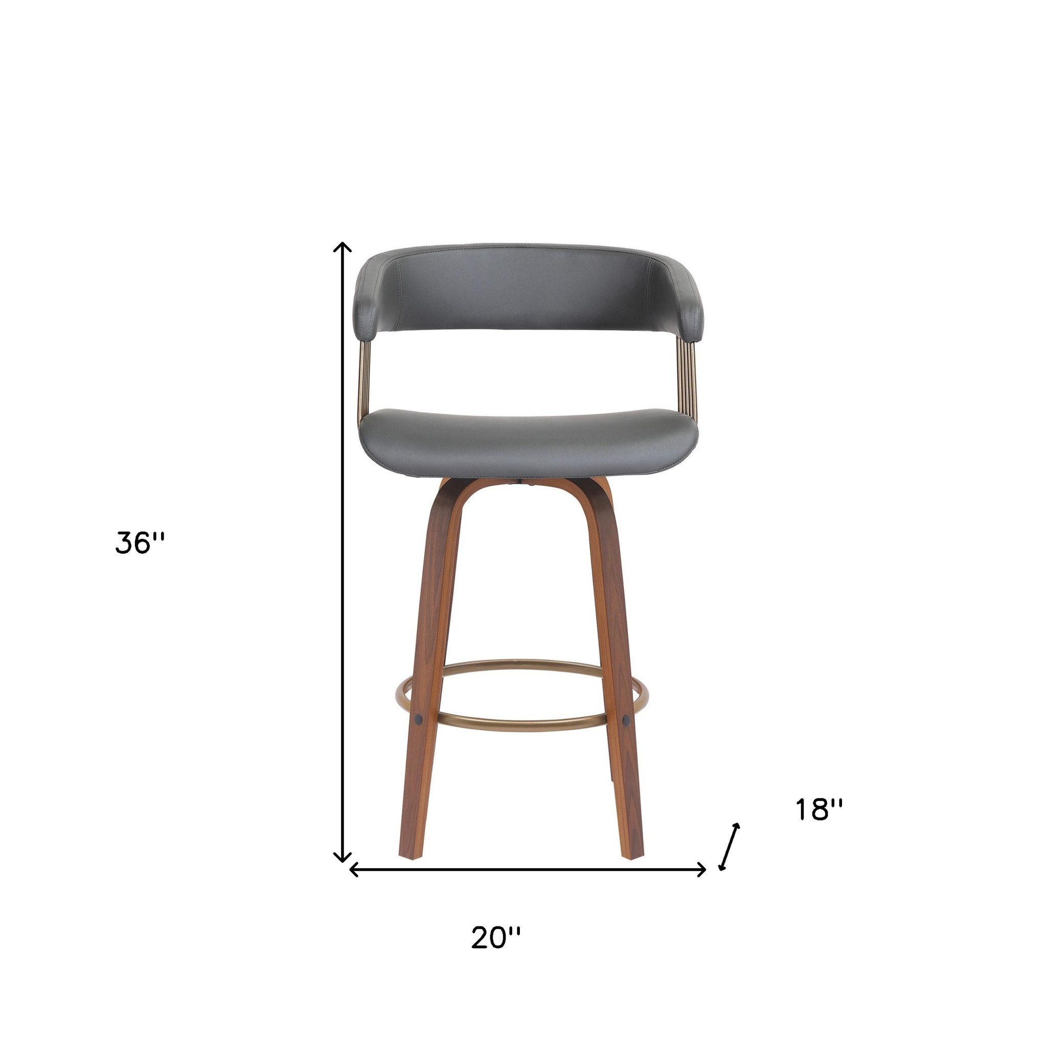The perfect way to add some extra seating in your home, this 26-inch gray and wood brown faux leather swivel counter height bar chair will elevate the look and vibe of your room. A wood brown manufactured wood frame is finished off with a gray faux leather seat that is the epitome of quality construction and design. Not only good looking and stylish, this chair features a bucket shaped seat and a full back for the ultimate in comfort and enjoyment. Designed with armrests for your comfort, this chair also features a footrest for comfort and convenience. 36-inch H x 18-inch W x 20-inch D