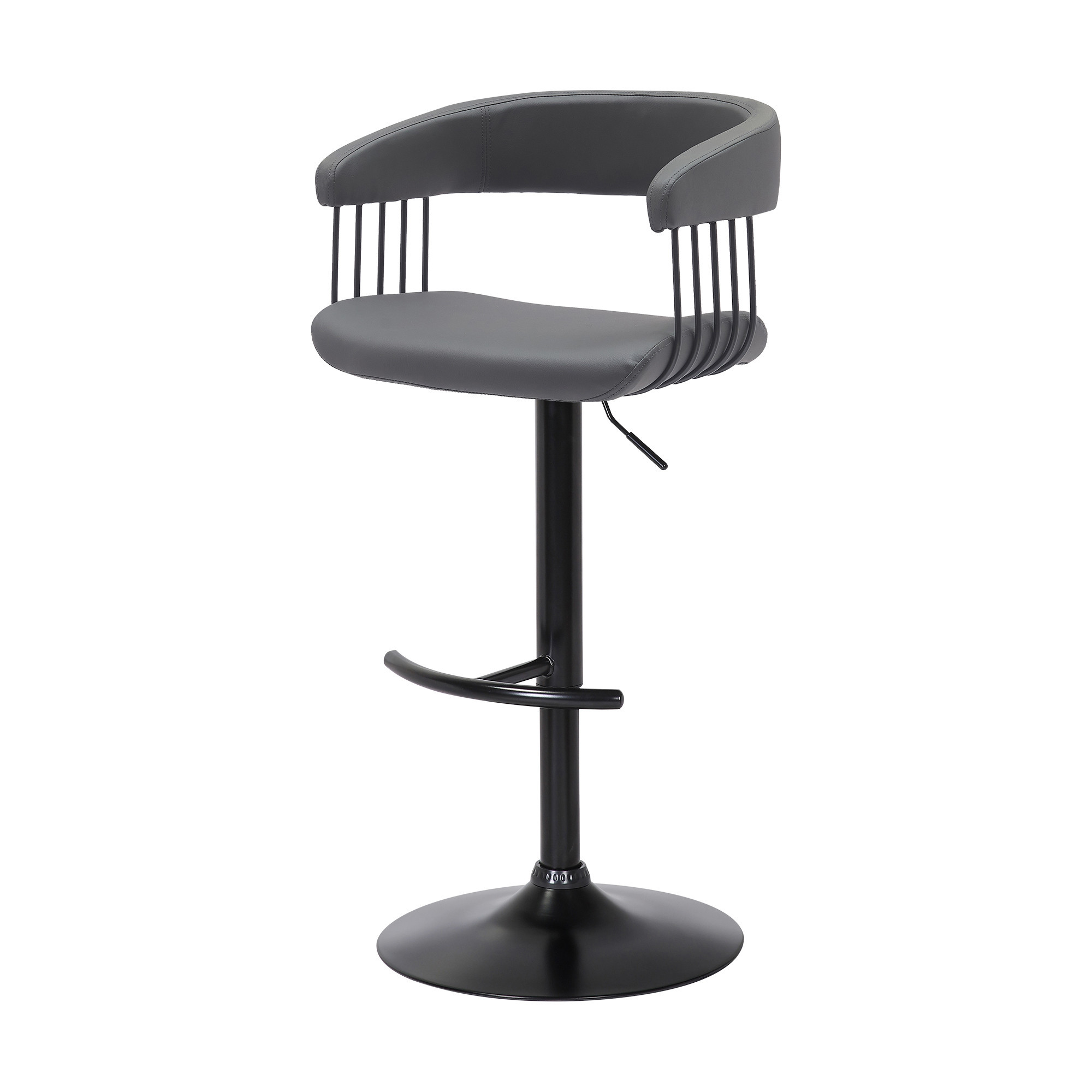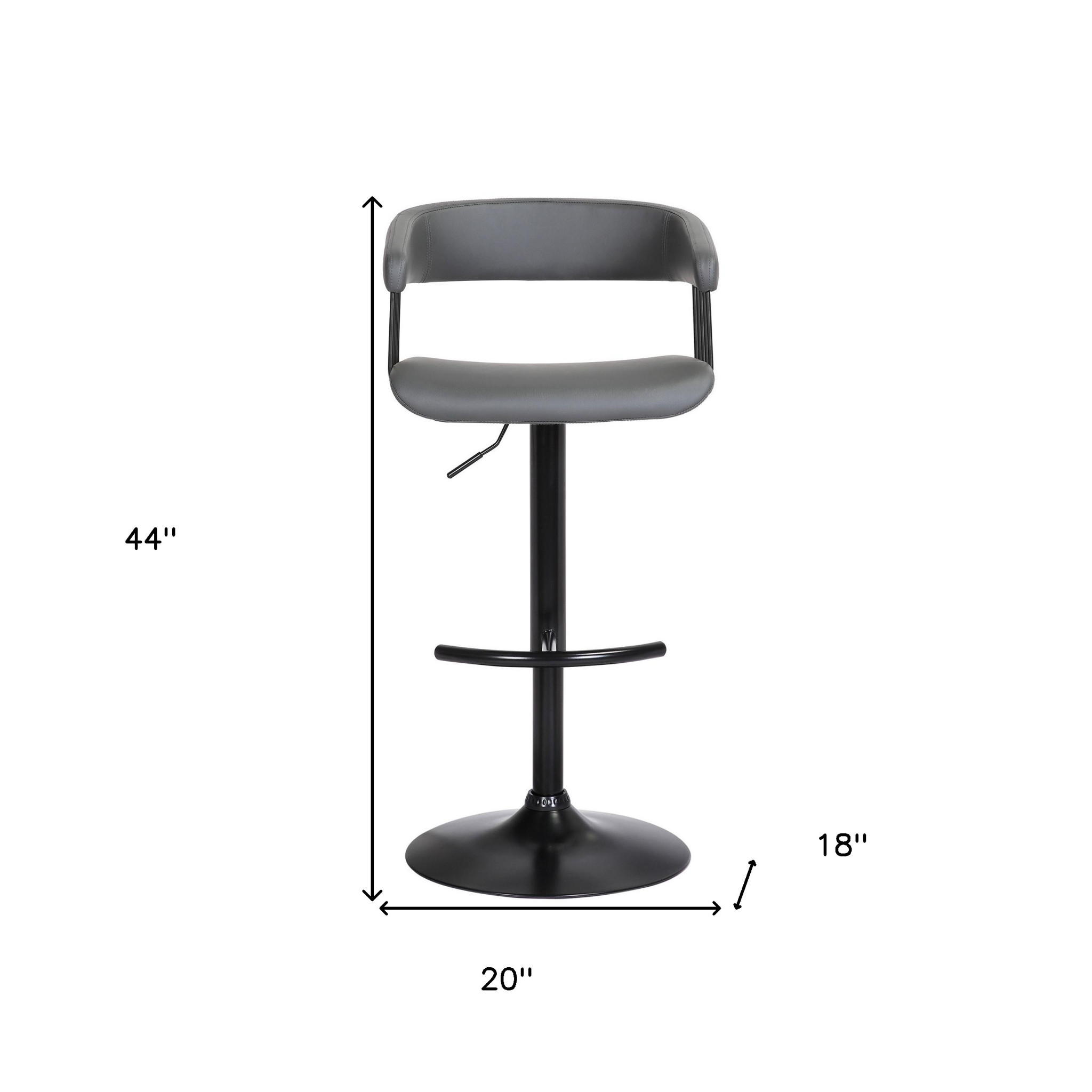 With this gray and black faux leather and metal swivel adjustable height bar chair you can add design and extra seating to your space. The black coloration of the high quality metal base marries nicely with the gray faux leather seat. Not only good looking and stylish, this chair features a bucket shaped seat and a full back for the ultimate in comfort and enjoyment. Designed with armrests for your comfort, this chair also features a footrest for comfort and convenience. 44-inch H x 18-inch W x 20-inch D