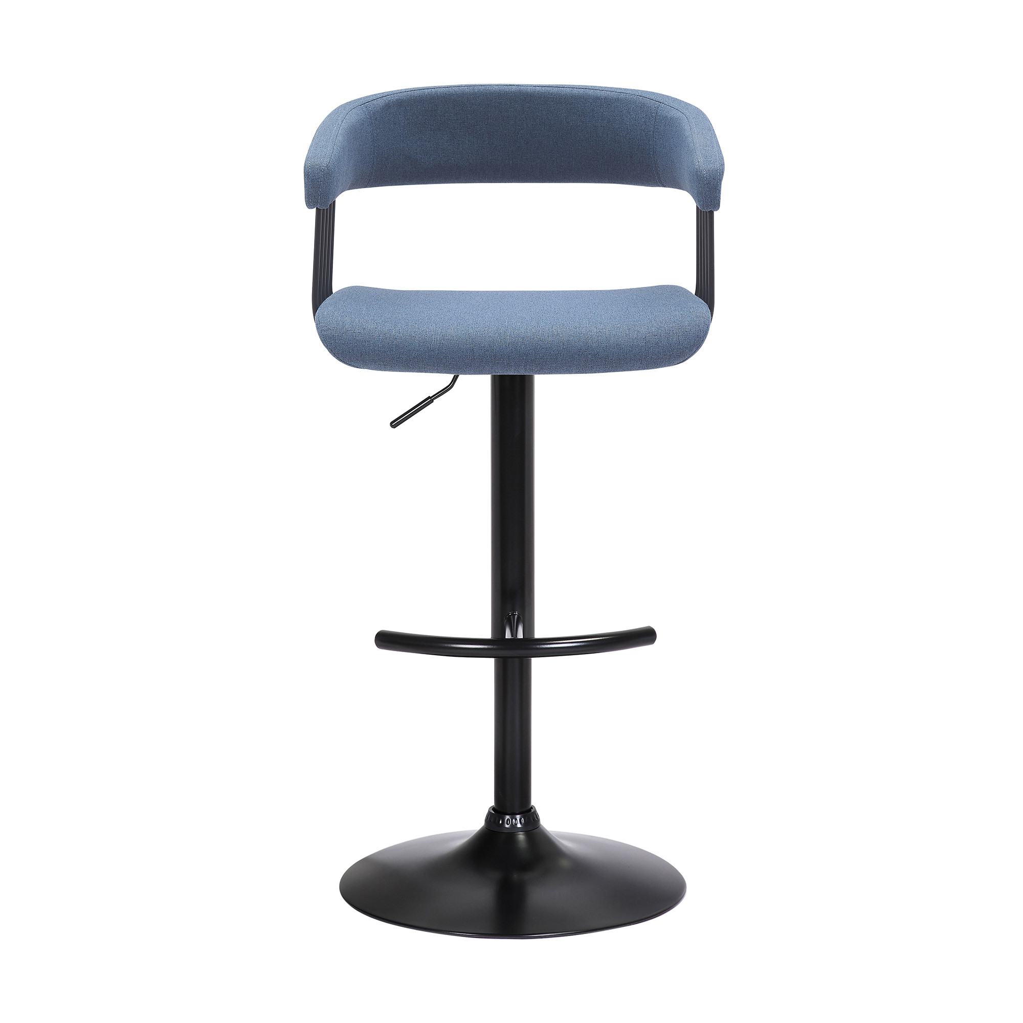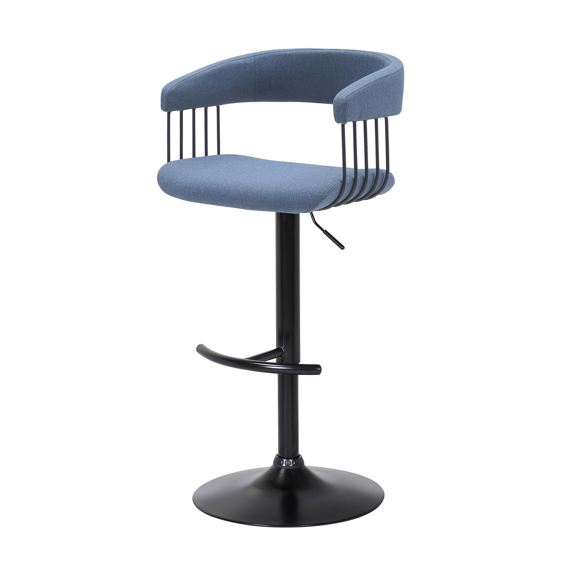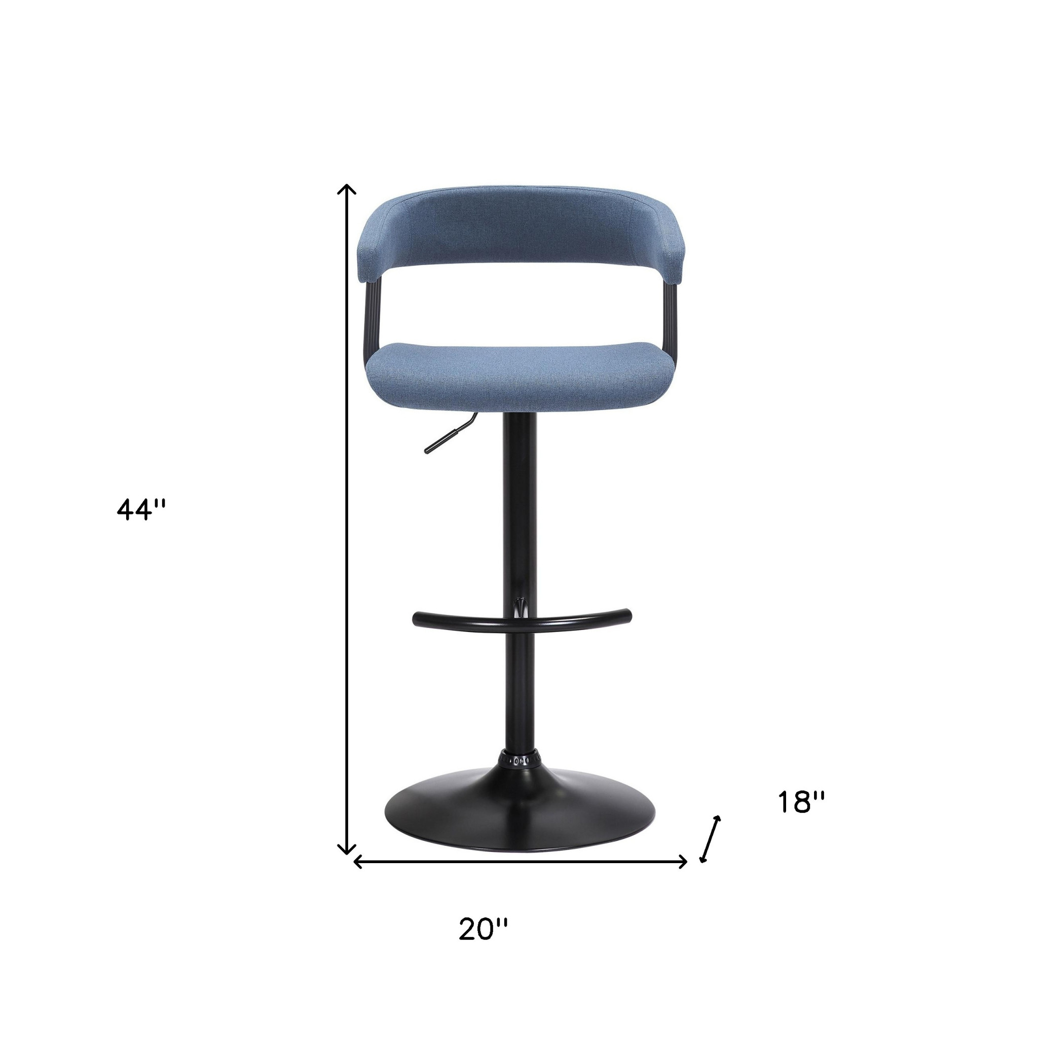 Bring a trendy bar vibe to your space, with this blue and black fabric and metal swivel adjustable height bar chair. Quality construction from black metal combines with blue fabric to give this stool a fresh and updated look. A full back mixed with a bucket shaped seat design makes this chair both comfortable and fashionable. Designed with armrests for your comfort, this chair also features a footrest for comfort and convenience. 44-inch H x 18-inch W x 20-inch D