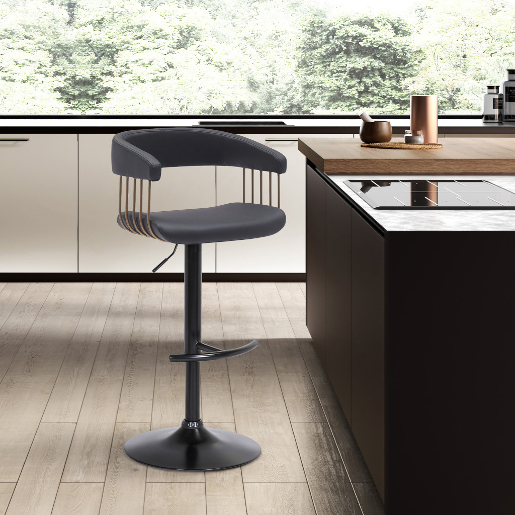 Comfort and design come together nicely in this black faux leather and metal swivel adjustable height bar chair. The base of this stool is made from metal in a black, that matches the faux leather, also in black. A full back mixed with a bucket shaped seat design makes this chair both comfortable and fashionable. Designed with armrests for your comfort, this chair also features a footrest for comfort and convenience. 44-inch H x 18-inch W x 20-inch D