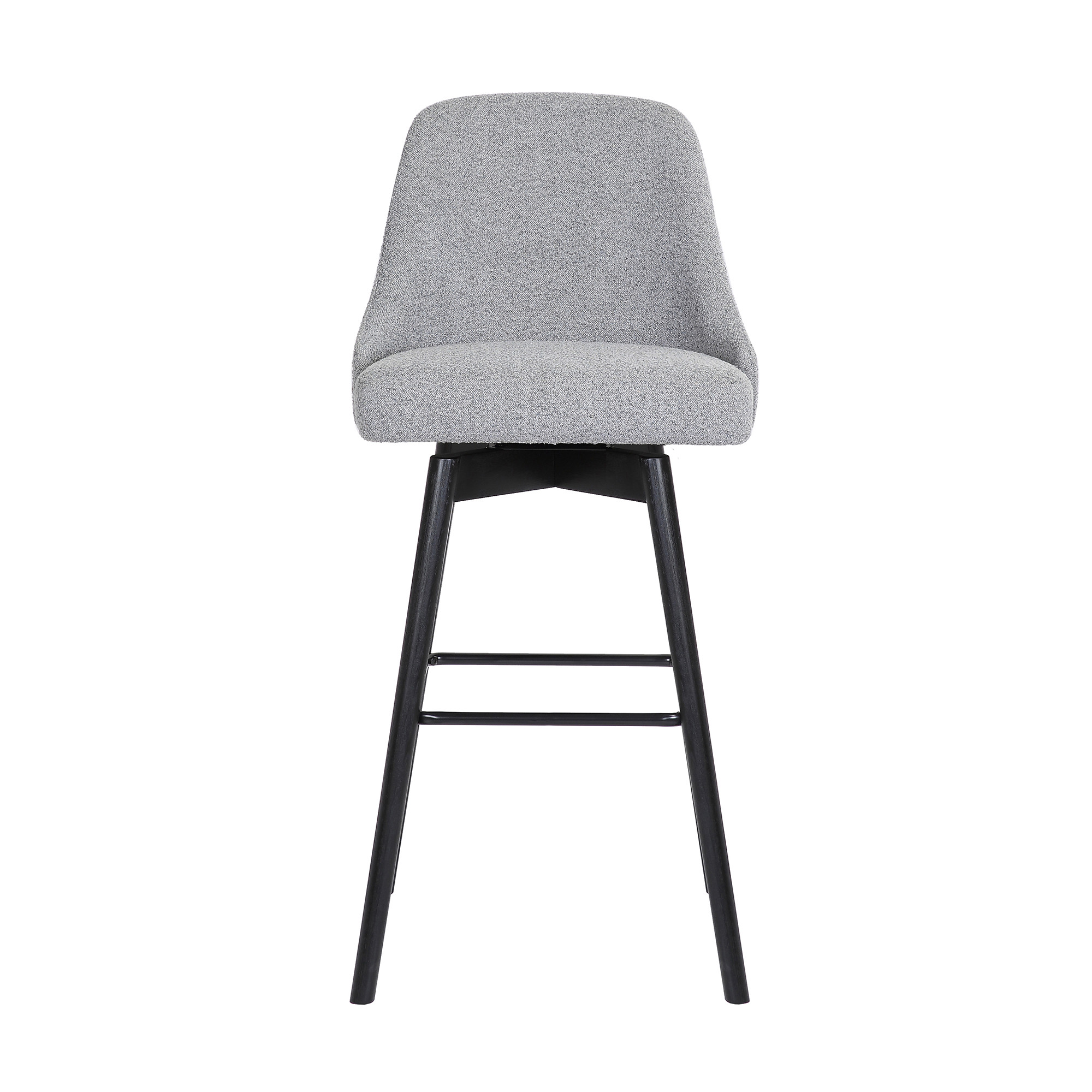 With this 26-inch light gray and black fabric and solid wood swivel counter height bar chair you can add design and extra seating to your space. The light gray fabric seat of this stool is a nice contrast to the high quality, black solid wood of the base. The bucket shape of the seat combines with a full back to give this chair a comfortable and fashionable look. Designed with a footrest for comfort and convenience. 37.5-inch H x 20.5-inch W x 19-inch D