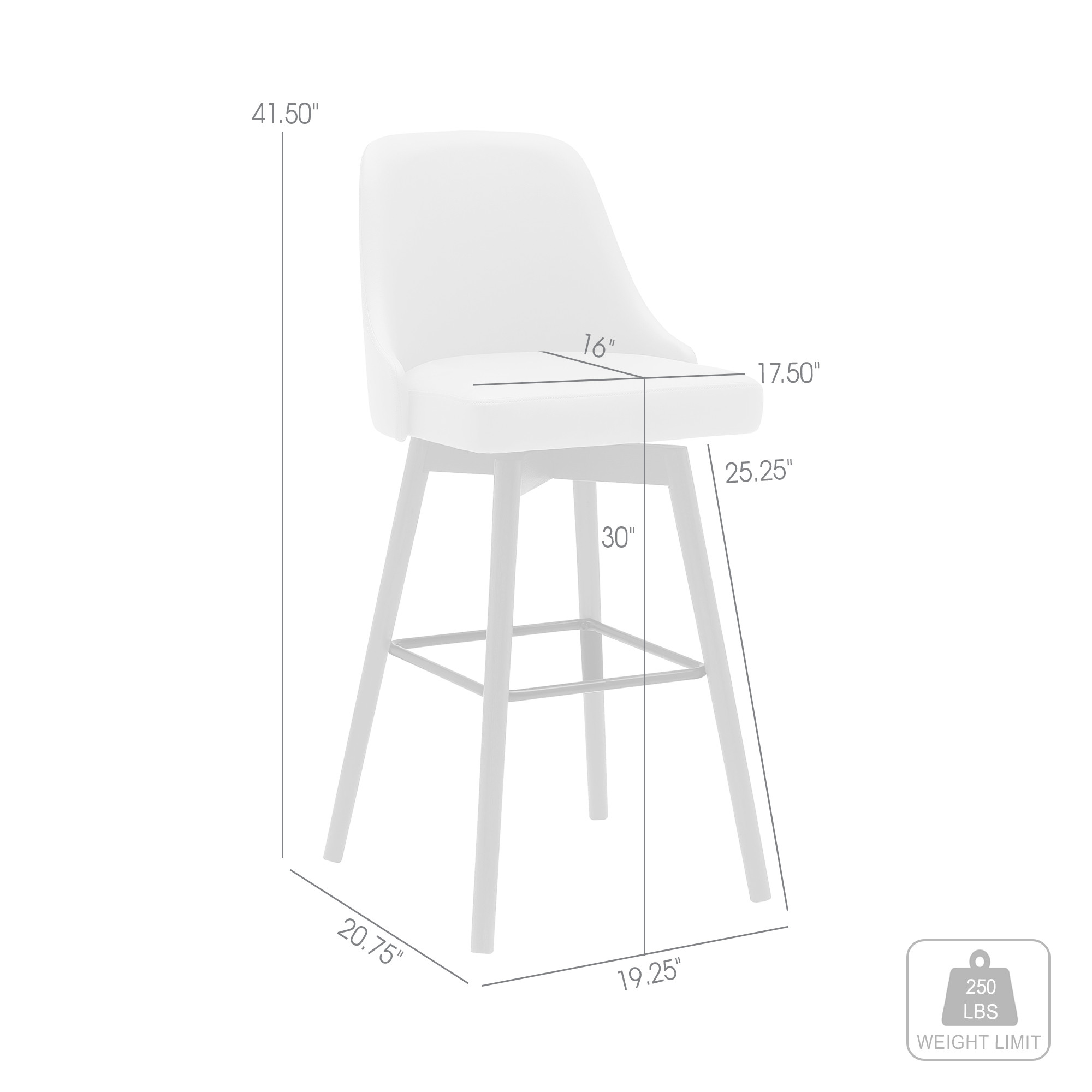The perfect way to add some extra seating in your home, this 30-inch cream and wood brown faux leather and solid wood swivel bar height bar chair will elevate the look and vibe of your room. A wood brown solid wood frame is finished off with a cream faux leather seat that is the epitome of quality construction and design. Not only good looking and stylish, this chair features a bucket shaped seat and a full back for the ultimate in comfort and enjoyment. Designed with a footrest for comfort and convenience. 41.5-inch H x 21-inch W x 19-inch D
