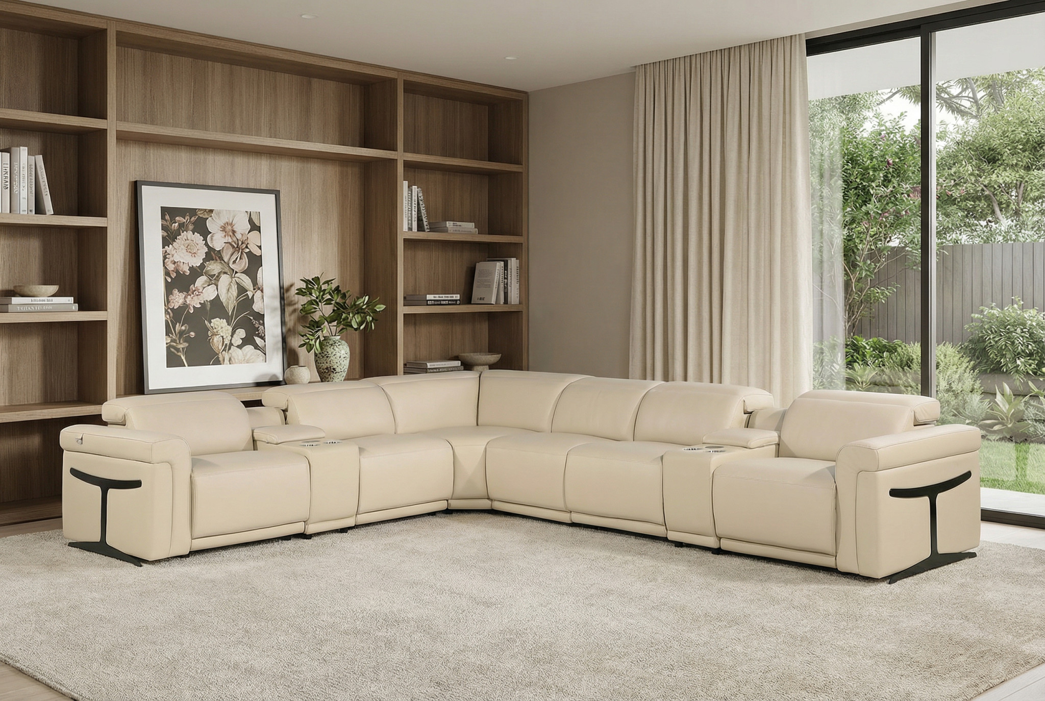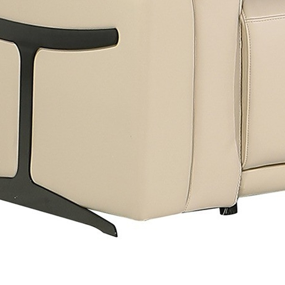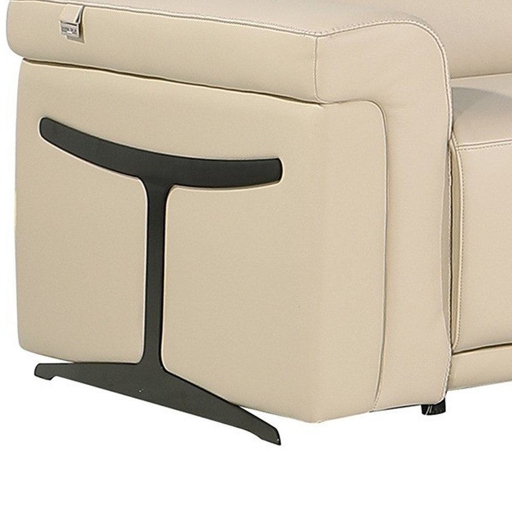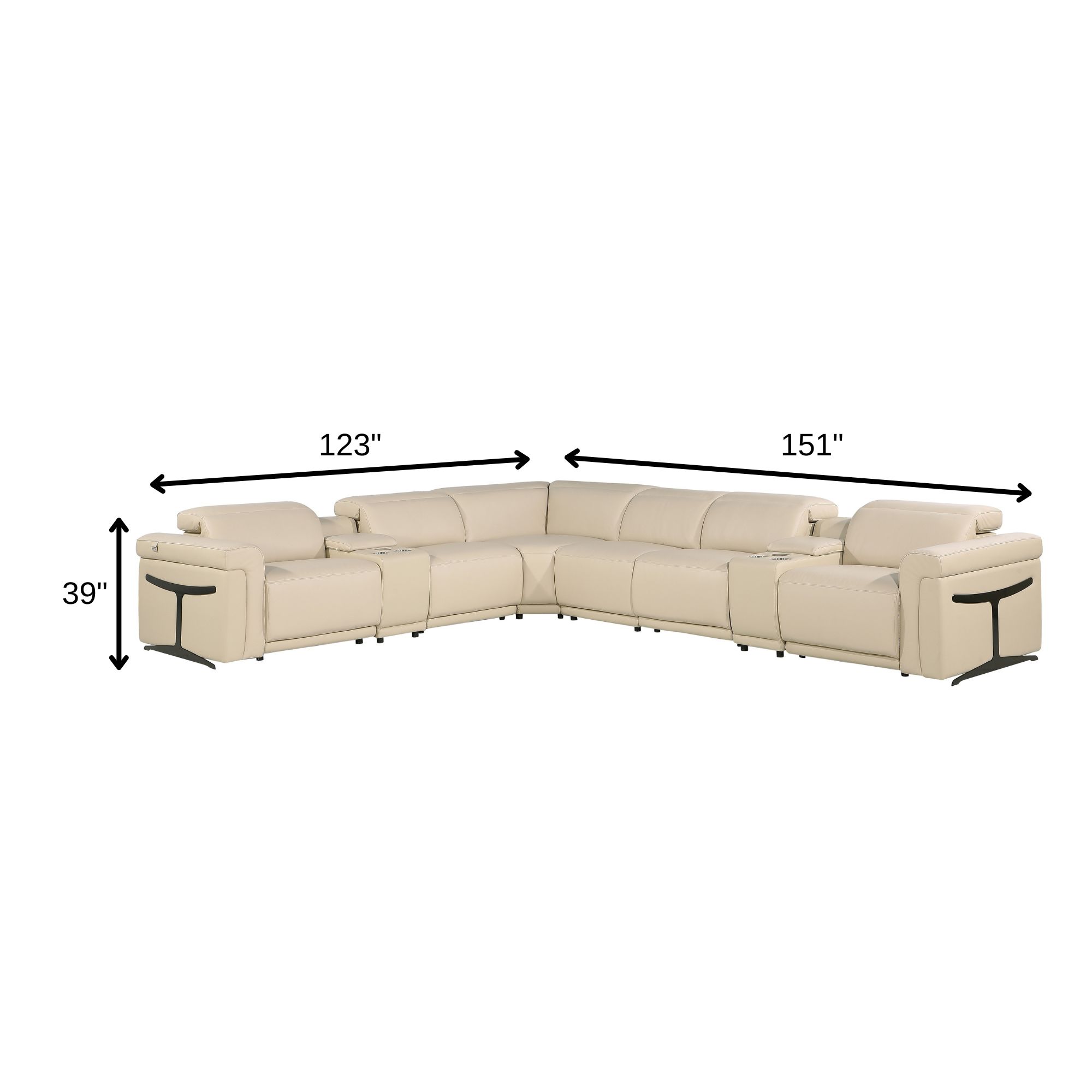 Superior construction from fabulously soft and high-grade leather gives this beige italian leather modular l shaped eight piece corner sectional with console a leg up on the competition. The premium leather used makes your lounging luxuriously comfortable and adds an elegant appeal to your space. Solid colors give you lots of decorative options and are easy to work into your decor scheme. Flared_arms offer a comfy place to rest. For the ultimate in relaxation, this sectional includes power - push button recline that turns it into a comfy lounge for sleeping or resting. Add versatility to your room as this sectional opens up into a n/a sleeper bed. Silver metal legs effortlessly elevate the room and add a touch of contemporary design. A great showpiece for your room, this sectional is a must have. 39-inch h x 151-inch w x 123-inch d.
