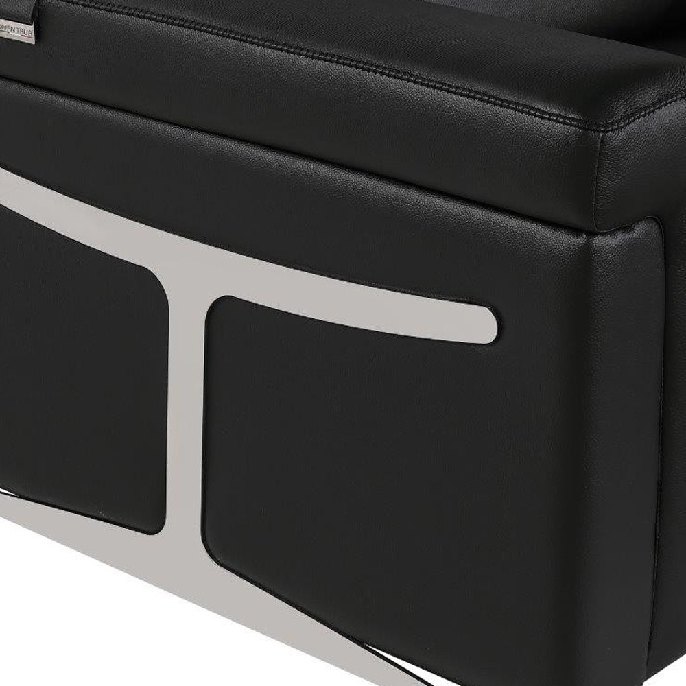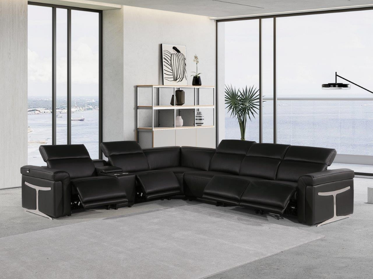 The black italian leather modular curved seven piece corner sectional with console is spacious design meticulously crafted with extraordinary cushion comfort and ultimate durability so everyone in your home can have the best seat in the house. The high-end premium leather used makes your lounging luxuriously comfortable and adds an elegant appeal to your space. Solid colors give you lots of decorative options and are easy to work into your decor scheme. Flared_arms offer a comfy place to rest. Power - push button recline allows you to truly rest, lounge and even sleep comfortably. Add sleeping options to your space as this fabulous sectional opens to a n/a sleeper. Silver metal legs effortlessly elevate the room and add a touch of contemporary design. Curved sectionals are a great way to maximize seating space without someone getting stuck in the uncomfortable corner seat. Great for everyday lounging and for entertaining, sectionals are an ideal way to seat multiple people. 39-inch h x 138-inch w x 123-inch d.