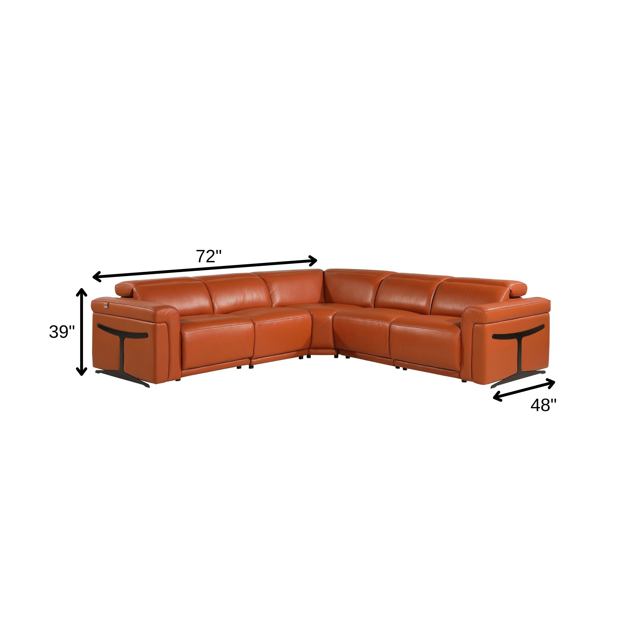 Superior construction from fabulously soft and high-grade leather gives this camel italian leather modular l shaped five piece corner sectional a leg up on the competition. The premium leather used makes your lounging luxuriously comfortable and adds an elegant appeal to your space. Solid colors give you lots of decorative options and are easy to work into your decor scheme. Flared_arms offer a comfy place to rest. For the ultimate in relaxation, this sectional includes power - push button recline that turns it into a comfy lounge for sleeping or resting. Add versatility to your room as this sectional opens up into a n/a sleeper bed. Silver metal legs effortlessly elevate the room and add a touch of contemporary design. A great showpiece for your room, this sectional is a must have. 39-inch h x 72-inch w x 48-inch d.