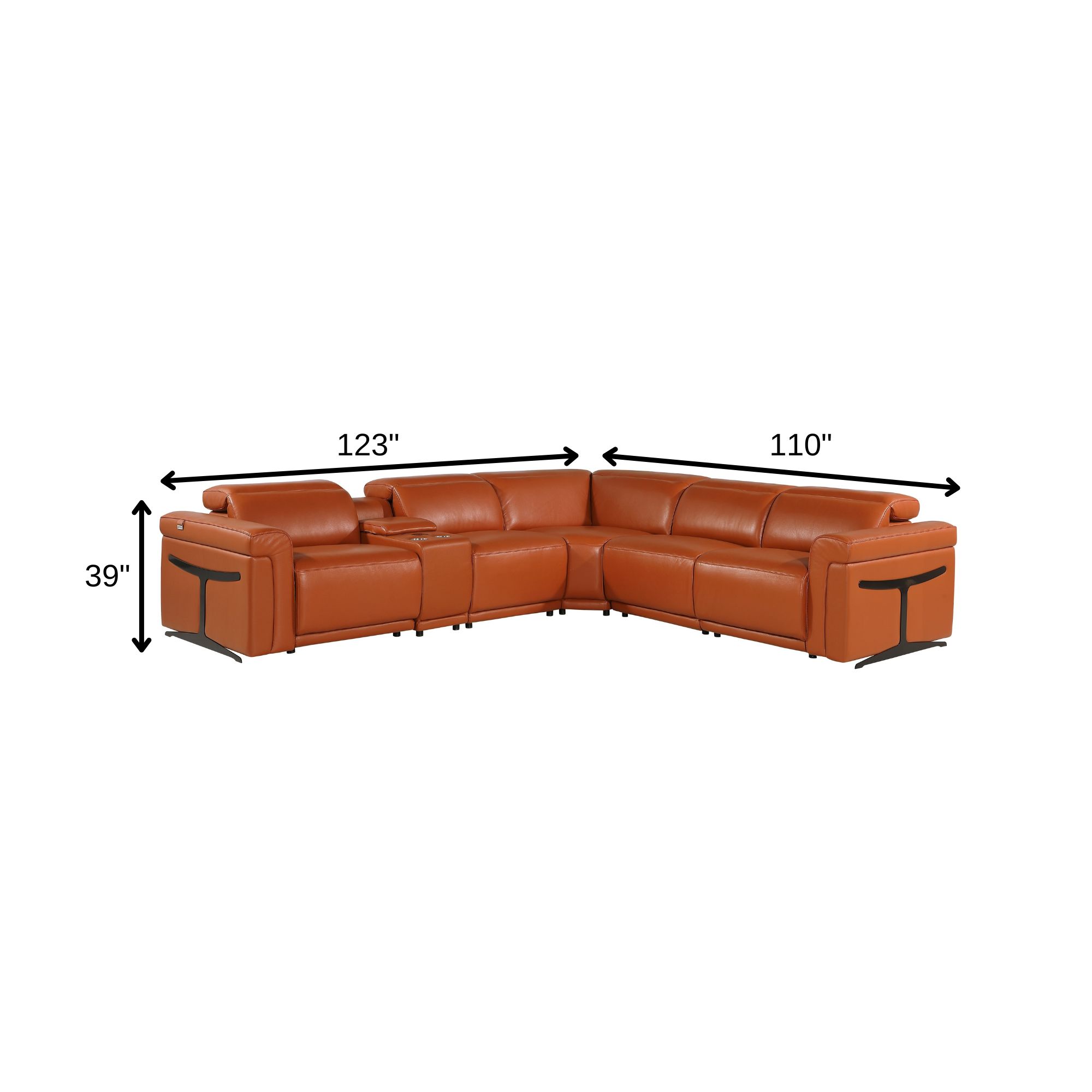 Take your relaxation to the next level with this super soft and comfortable camel italian leather modular l shaped six piece corner sectional with console. The high-end premium leather used makes your lounging luxuriously comfortable and adds an elegant appeal to your space. Solid colors give you lots of decorative options and are easy to work into your decor scheme. Flared_arms offer a comfy place to rest. For the ultimate in relaxation, this sectional includes power - push button recline that turns it into a comfy lounge for sleeping or resting. Add sleeping options to your space as this fabulous sectional opens to a n/a sleeper. Silver metal legs effortlessly elevate the room and add a touch of contemporary design. Great for everyday lounging and for entertaining, sectionals are an ideal way to seat multiple people. 39-inch h x 110-inch w x 123-inch d.