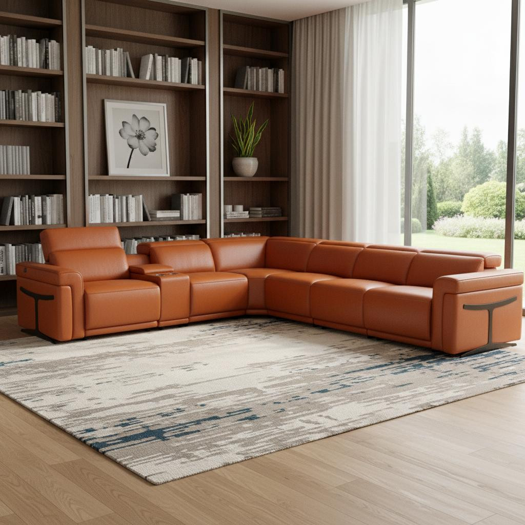 Superior construction from fabulously soft and high-grade leather gives this camel italian leather modular l shaped seven piece corner sectional with console a leg up on the competition. The premium leather used makes your lounging luxuriously comfortable and adds an elegant appeal to your space. Solid colors give you lots of decorative options and are easy to work into your decor scheme. Flared_arms offer a comfy place to rest. Power - push button recline allows you to truly rest, lounge and even sleep comfortably. Add versatility to your room as this sectional opens up into a n/a sleeper bed. Silver metal legs effortlessly elevate the room and add a touch of contemporary design. Great for everyday lounging and for entertaining, sectionals are an ideal way to seat multiple people. 39-inch h x 138-inch w x 123-inch d.