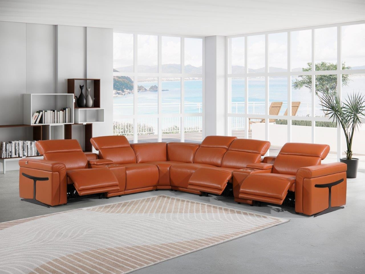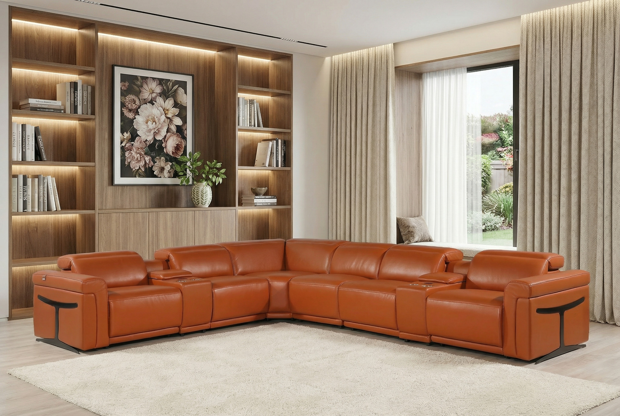 Take your relaxation to the next level with this super soft and comfortable camel italian leather modular l shaped eight piece corner sectional with console. The high-end premium leather used makes your lounging luxuriously comfortable and adds an elegant appeal to your space. Solid colors give you lots of decorative options and are easy to work into your decor scheme. Flared_arms offer a comfy place to rest. Power - push button recline allows you to truly rest, lounge and even sleep comfortably. Add versatility to your room as this sectional opens up into a n/a sleeper bed. Silver metal legs effortlessly elevate the room and add a touch of contemporary design. A great showpiece for your room, this sectional is a must have. 39-inch h x 151-inch w x 123-inch d.