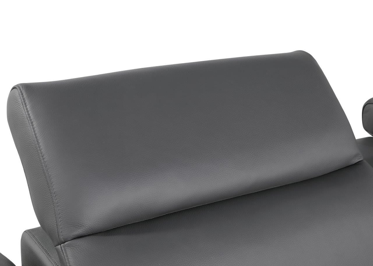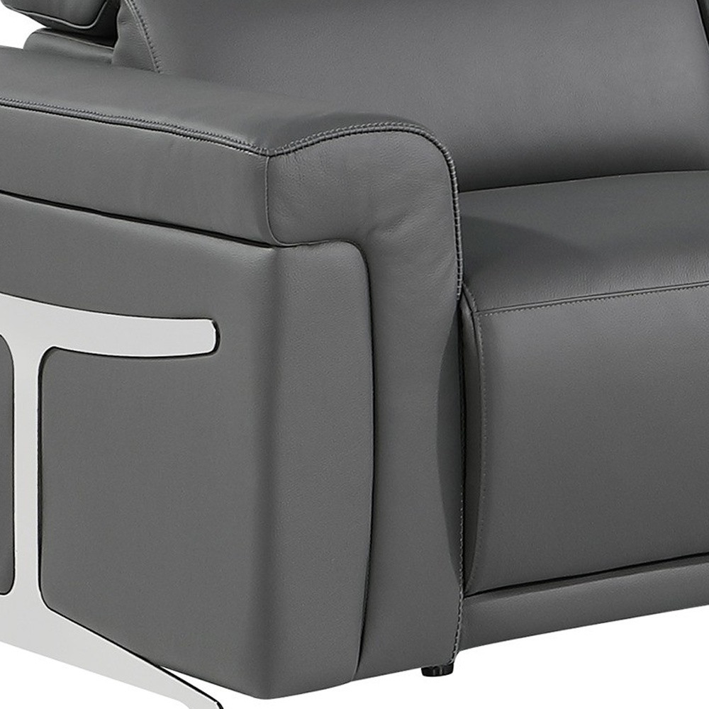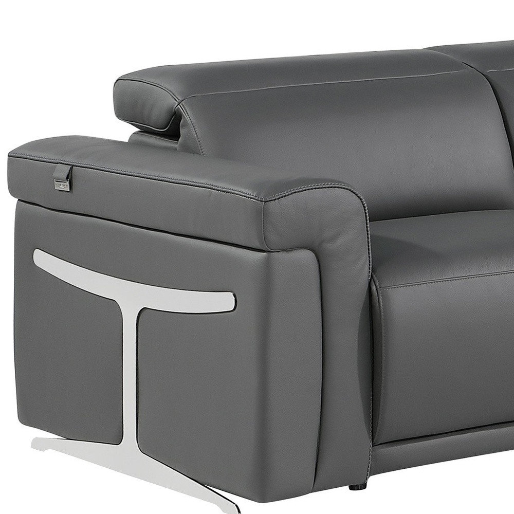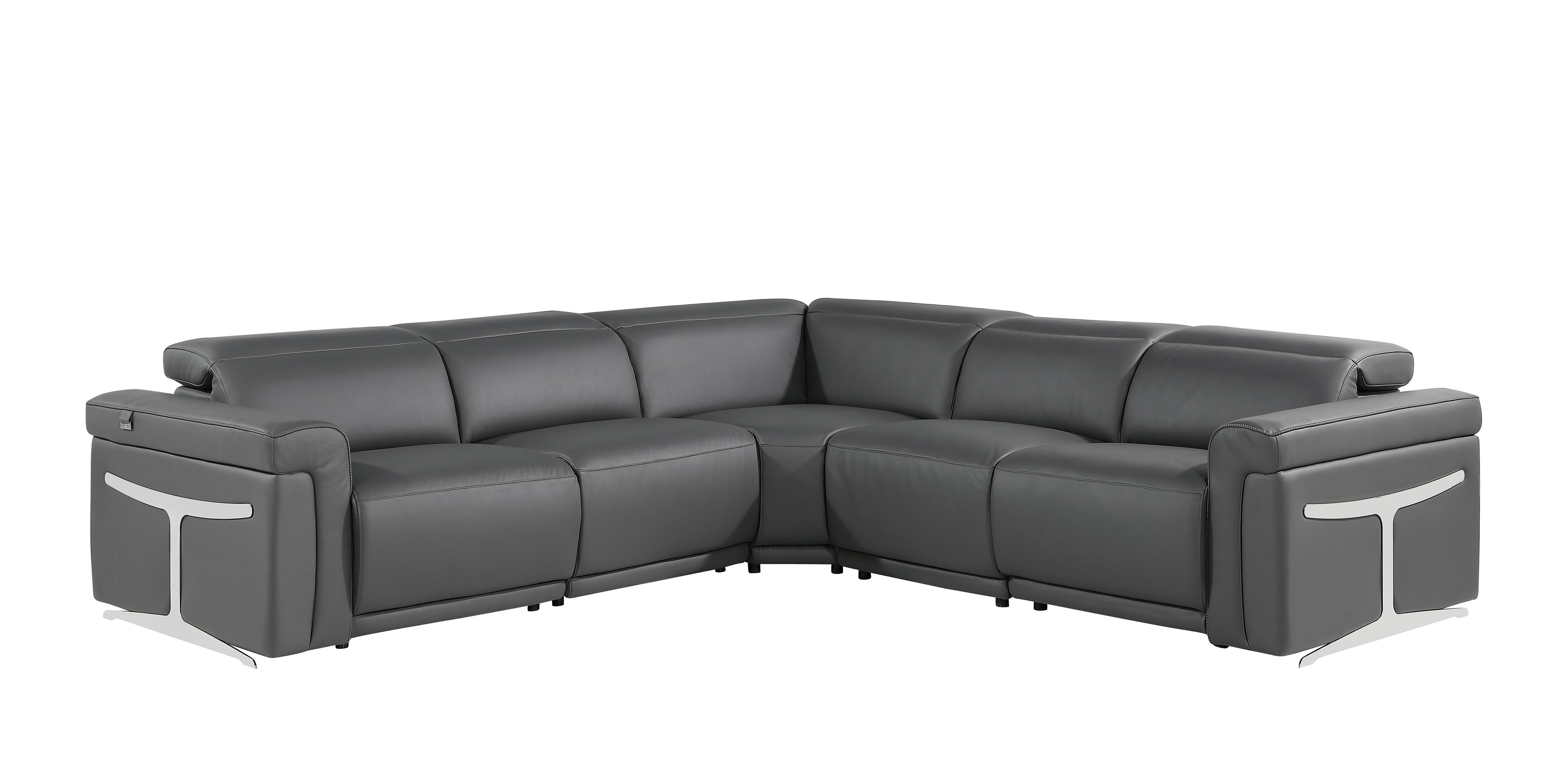 Made of the highest quality, supple leather, this gray Italian leather modular l shaped five piece corner sectional will be the star of your space. The high-grade premium leather used makes your lounging luxuriously comfortable and adds an elegant appeal to your space. Solid colors give you lots of decorative options and are easy to work into your decor scheme. Flared arms offer a comfy place to rest. Power - push button recline allows you to truly rest, lounge and even sleep comfortably. Add versatility to your room as this sectional opens up into a n/a sleeper bed. Silver metal legs effortlessly elevate the room and add a touch of contemporary design. A great showpiece for your room, this sectional is a must have. 39-inch h x 72-inch w x 48-inch d.