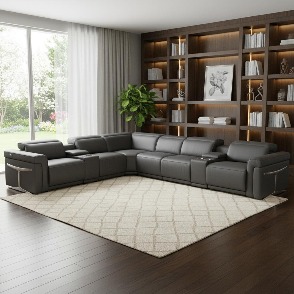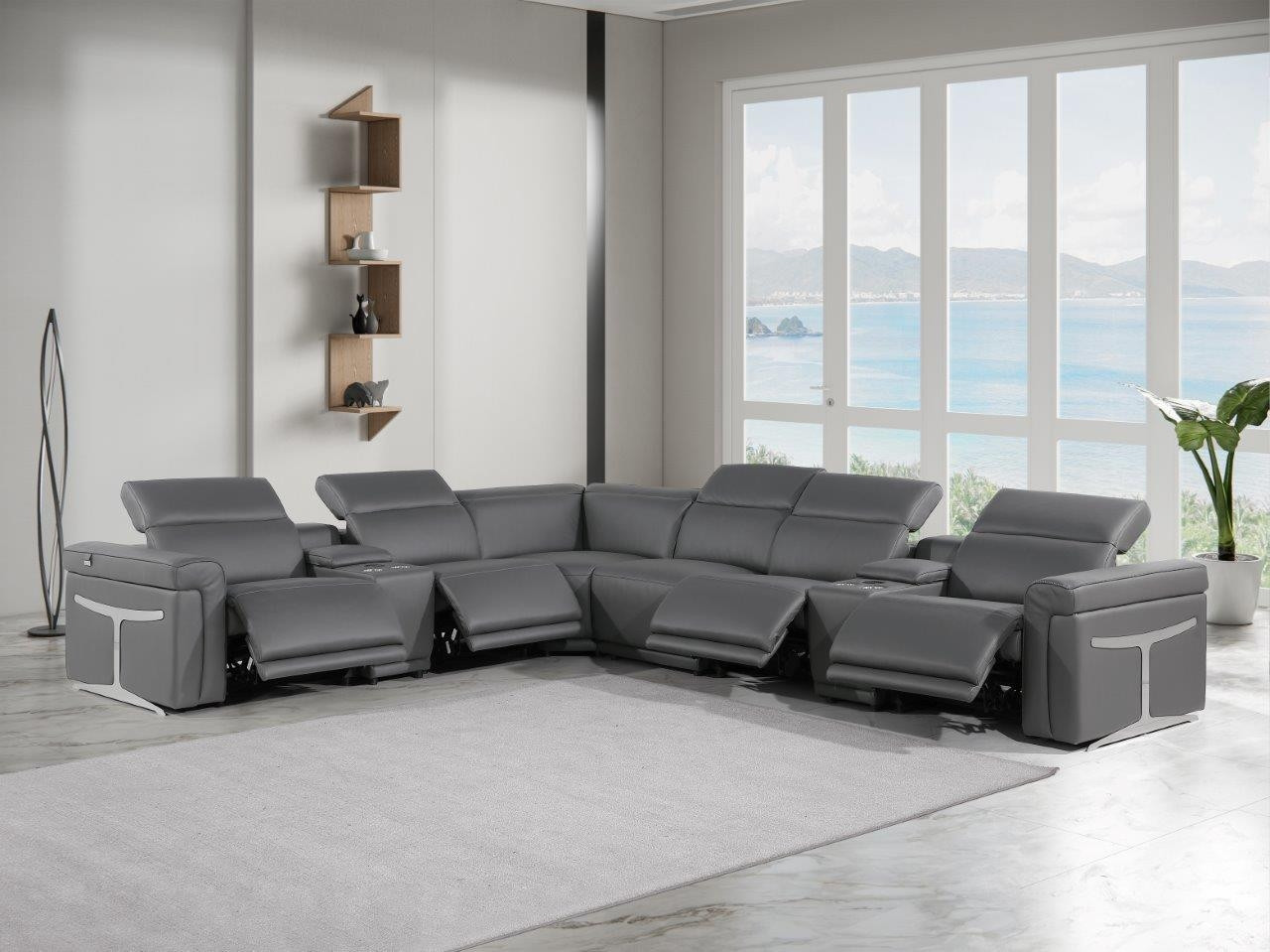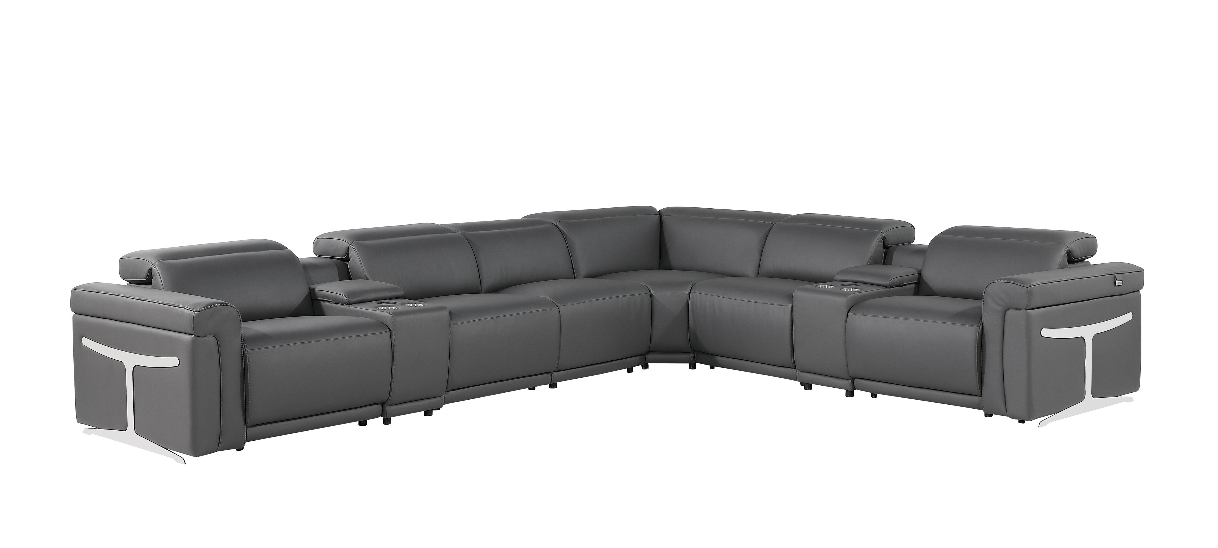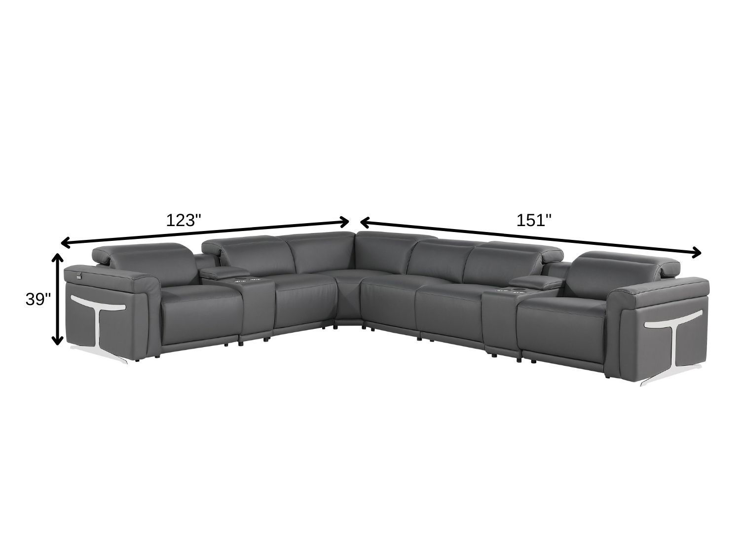 The gray italian leather modular l shaped eight piece corner sectional with console is spacious design meticulously crafted with extraordinary cushion comfort and ultimate durability so everyone in your home can have the best seat in the house. The high-end premium leather used makes your lounging luxuriously comfortable and adds an elegant appeal to your space. Solid colors give you lots of decorative options and are easy to work into your decor scheme. Flared_arms offer a comfy place to rest. For the ultimate in relaxation, this sectional includes power - push button recline that turns it into a comfy lounge for sleeping or resting. Add sleeping options to your space as this fabulous sectional opens to a n/a sleeper. Silver metal legs effortlessly elevate the room and add a touch of contemporary design. A great showpiece for your room, this sectional is a must have. 39-inch h x 151-inch w x 123-inch d.