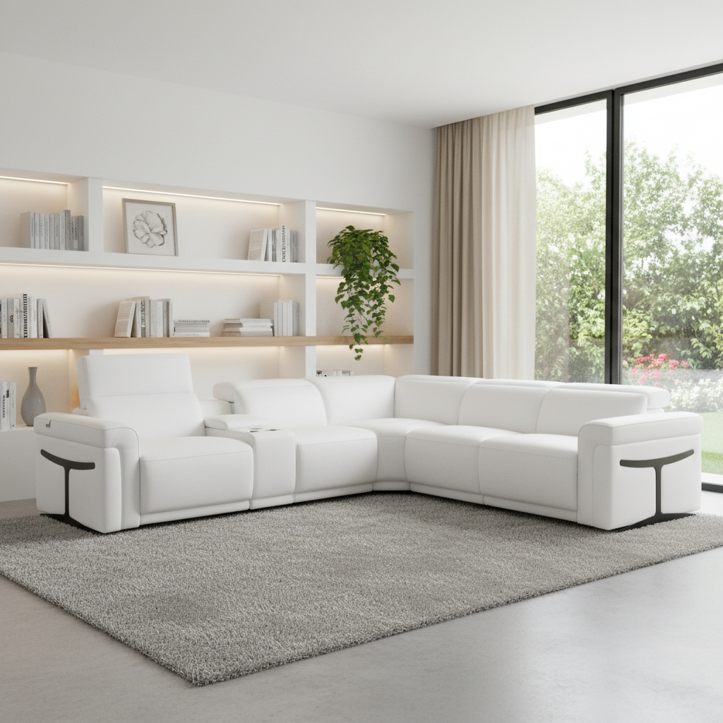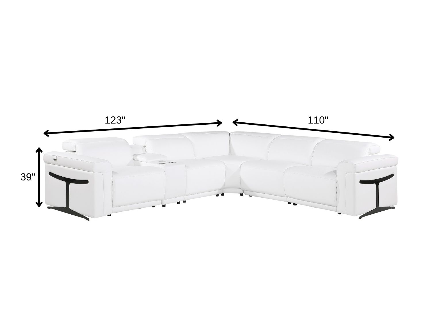 Take your relaxation to the next level with this super soft and comfortable white italian leather modular l shaped six piece corner sectional with console. The high-end premium leather used makes your lounging luxuriously comfortable and adds an elegant appeal to your space. Solid colors give you lots of decorative options and are easy to work into your decor scheme. Flared_arms offer a comfy place to rest. Power - push button recline allows you to truly rest, lounge and even sleep comfortably. Add sleeping options to your space as this fabulous sectional opens to a n/a sleeper. Silver metal legs effortlessly elevate the room and add a touch of contemporary design. Great for everyday lounging and for entertaining, sectionals are an ideal way to seat multiple people. 39-inch h x 110-inch w x 123-inch d.