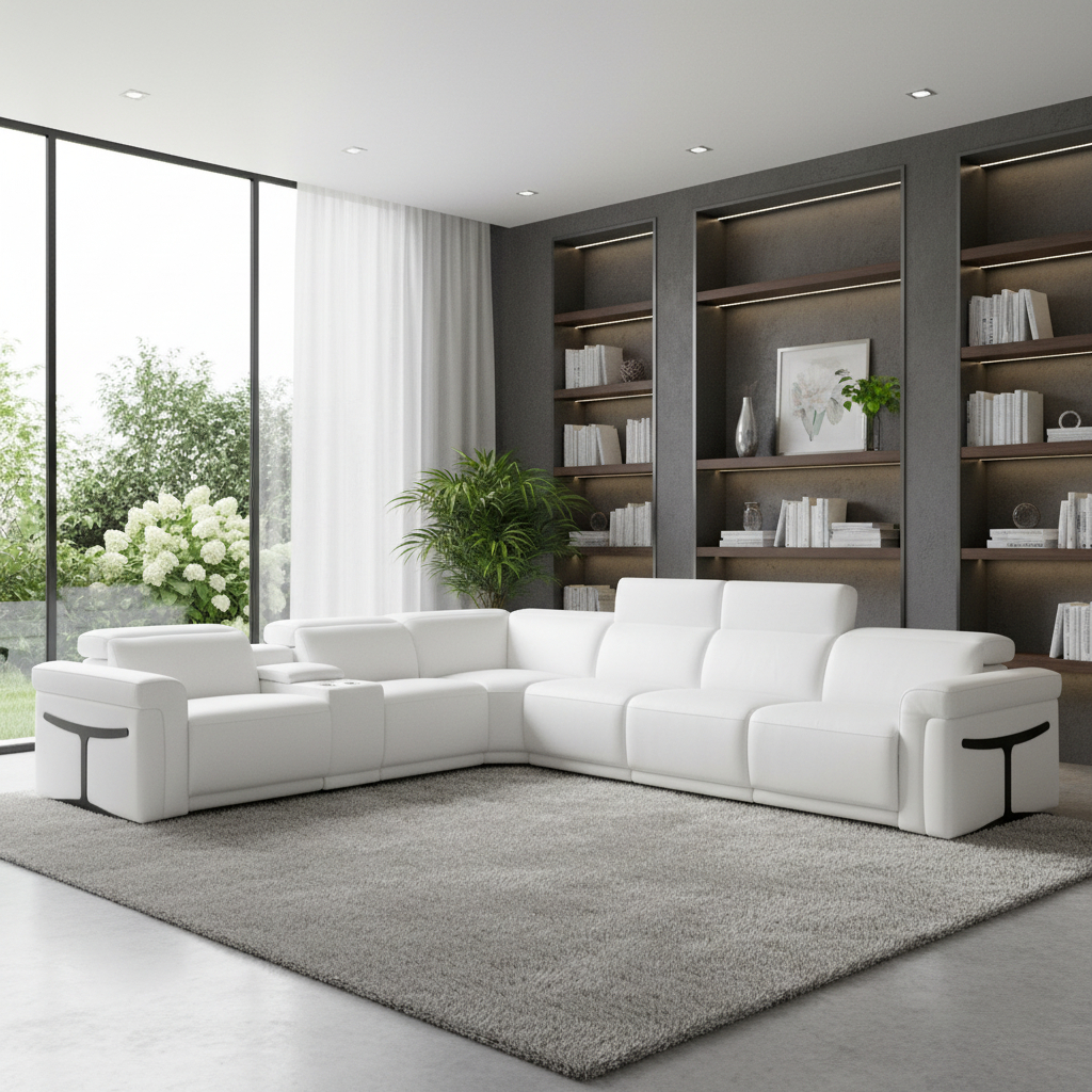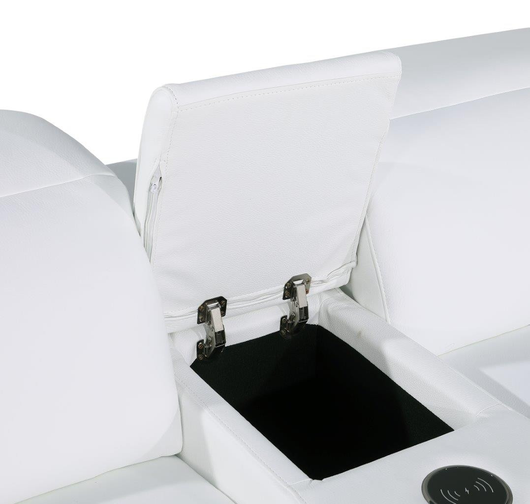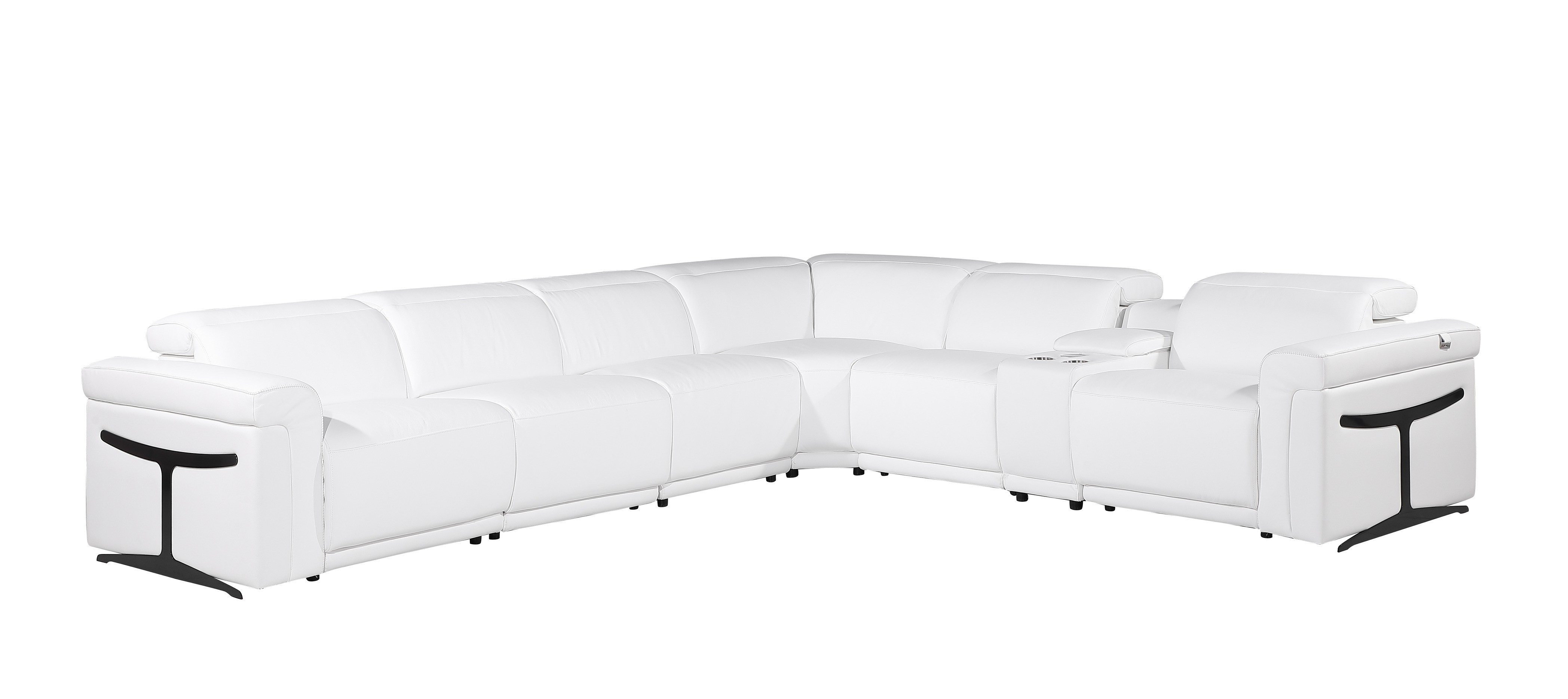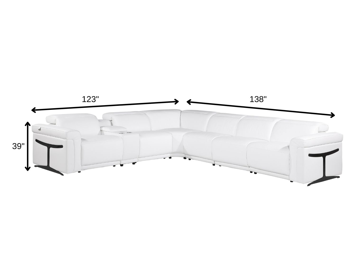 Superior construction from fabulously soft and high-grade leather gives this white italian leather modular l shaped seven piece corner sectional with console a leg up on the competition. The premium leather used makes your lounging luxuriously comfortable and adds an elegant appeal to your space. Solid colors give you lots of decorative options and are easy to work into your decor scheme. Flared_arms offer a comfy place to rest. For the ultimate in relaxation, this sectional includes power - push button recline that turns it into a comfy lounge for sleeping or resting. Add versatility to your room as this sectional opens up into a n/a sleeper bed. Silver metal legs effortlessly elevate the room and add a touch of contemporary design. Great for everyday lounging and for entertaining, sectionals are an ideal way to seat multiple people. 39-inch h x 138-inch w x 123-inch d.