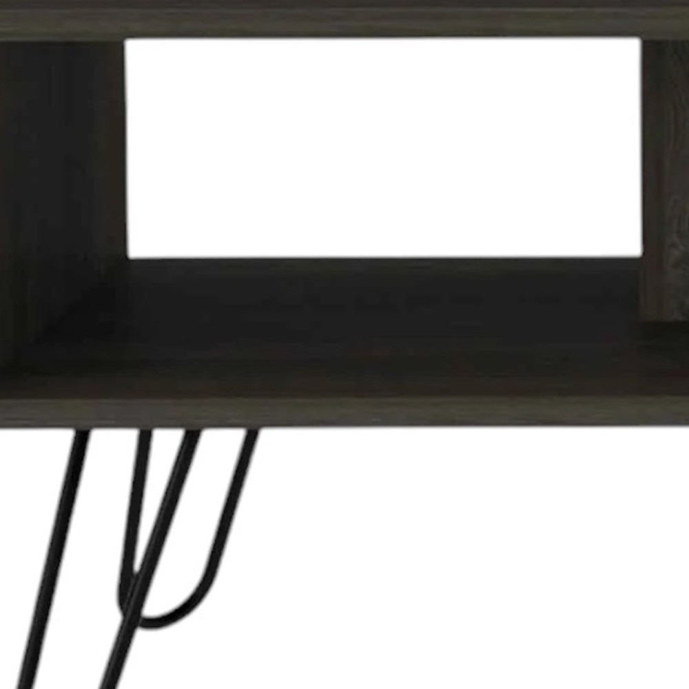Give your living room, family room, or office the perfect anchor piece with this 40-inch espresso and black wood and metal coffee table with shelf. A black metal frame is finished off with a espresso manufactured wood top that is the epitome of quality construction and design. Includes a single shelf for handy storage or display space. This rectangular table is an classic yet updated way to accent your room. If you're looking for something that can fit into a living area, bedroom, or office, this coffee table is for you. This coffee table is the sturdy, reliable and stylish answer to your living room needs. 15.7-inch H x 39.8-inch W x 17.7-inch D