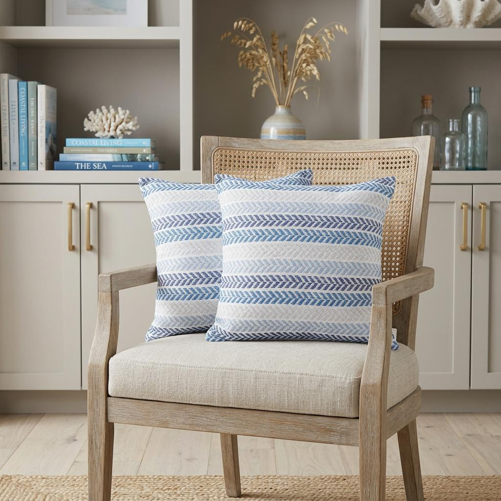 This set of two 18-inch x 18-inch blue beach chevron cotton zippered pillow will add a beautiful decorative accent to your decor. The blue coloring of these soft and long lasting 100% cotton pillows will add dimension and texture to your space. This soft polyfill pillow not only is decorative but made to be comfy and cozy all day long. Great to use on its own or mix with other decorations for the perfect look. A great decorative accessory for your favorite chair, to accent your sofa, or to use as part of your bed ensemble. 18-inch H x 18-inch W x 4-inch D