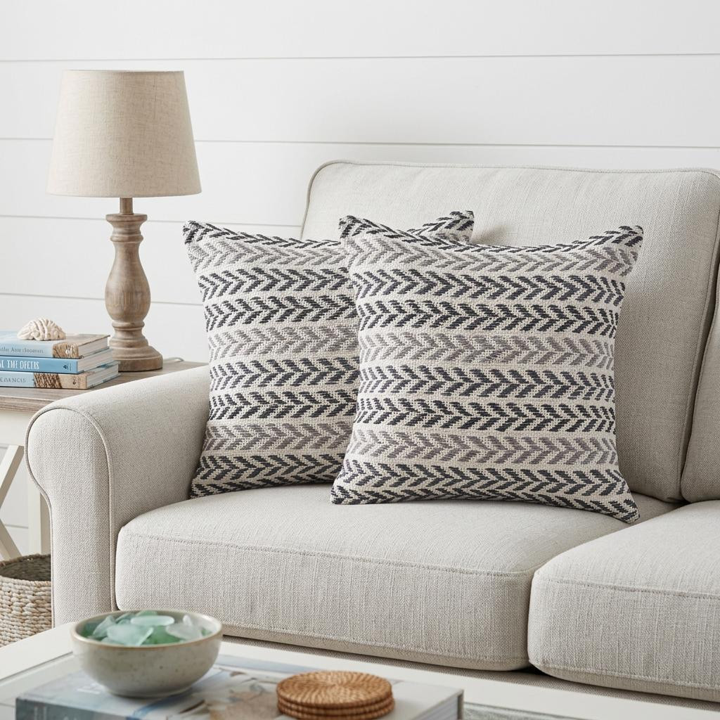 Bring a bit of fashion and zip to your space with this eye-catching and comfy set of two 18-inch x 18-inch black beach chevron cotton zippered pillow. These black hued pillows represent quality construction, expertly made from high grade 100% cotton that is not only long lasting but super soft to the touch as well. This soft polyfill pillow not only is decorative but made to be comfy and cozy all day long. Great to use on its own or mix with other decorations for the perfect look. A great decorative accessory for your favorite chair, to accent your sofa, or to use as part of your bed ensemble. 18-inch H x 18-inch W x 4-inch D