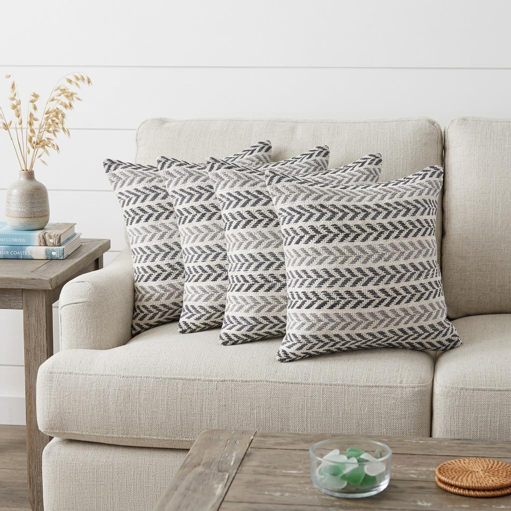 The perfect complement to your sofa, favorite chair, or bed, this set of four 18-inch x 18-inch black beach chevron cotton zippered pillow is a great decorative accent. These black hued pillows represent quality construction, expertly made from high grade 100% cotton that is not only long lasting but super soft to the touch as well. This soft polyfill pillow not only is decorative but made to be comfy and cozy all day long. Decorative throw pillows not only add color and dimension to your space but can be comfy and supportive when you are lounging and cuddling as well. Decorative pillows are a great way to change up the look and feel of your space easily and quickly. 18-inch H x 18-inch W x 4-inch D