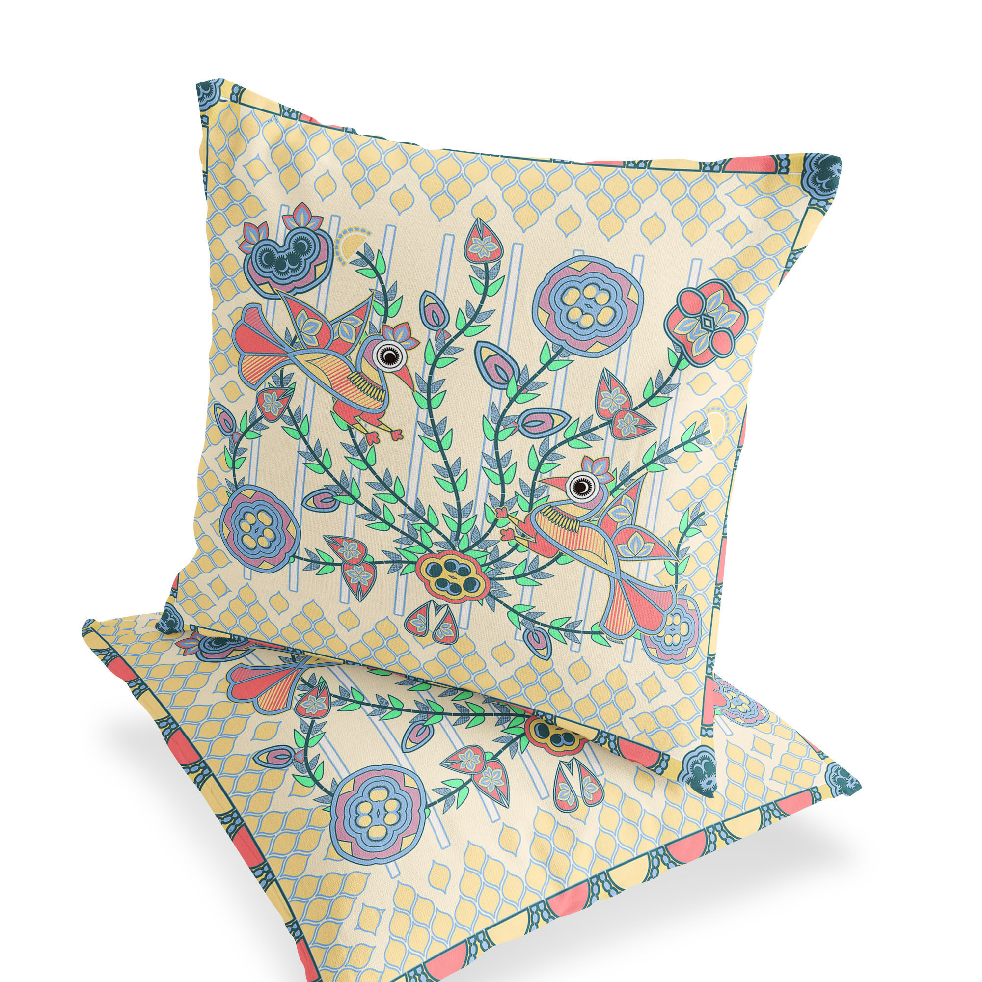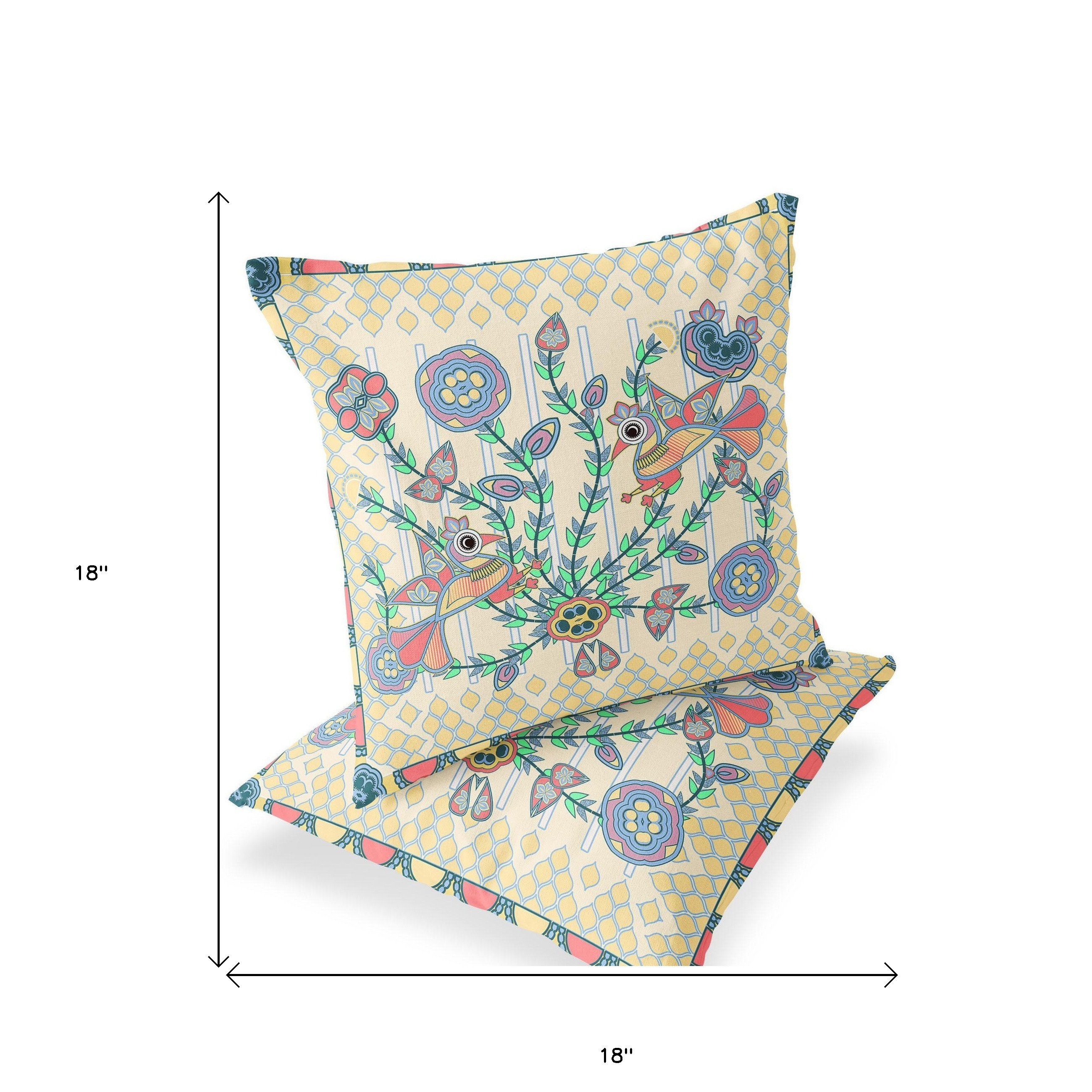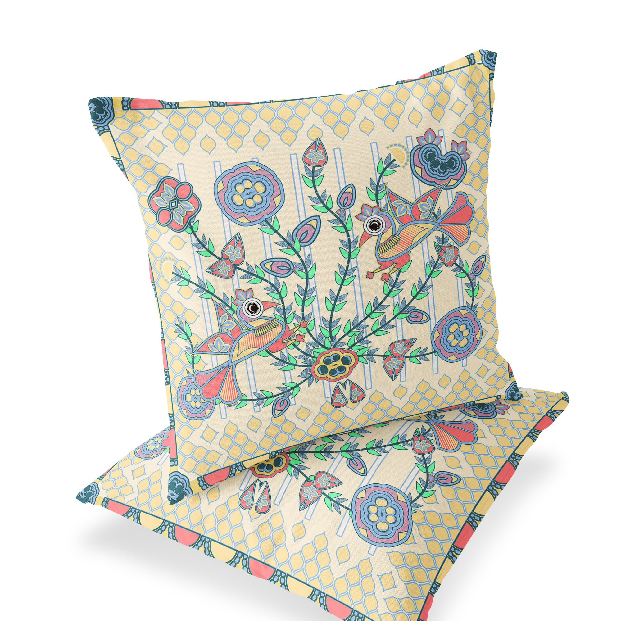 Set of Two Yellow Peacock Indoor Outdoor Throw Pillow