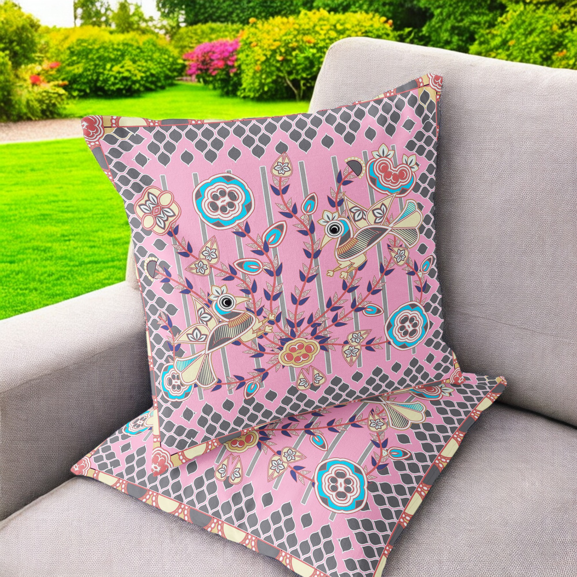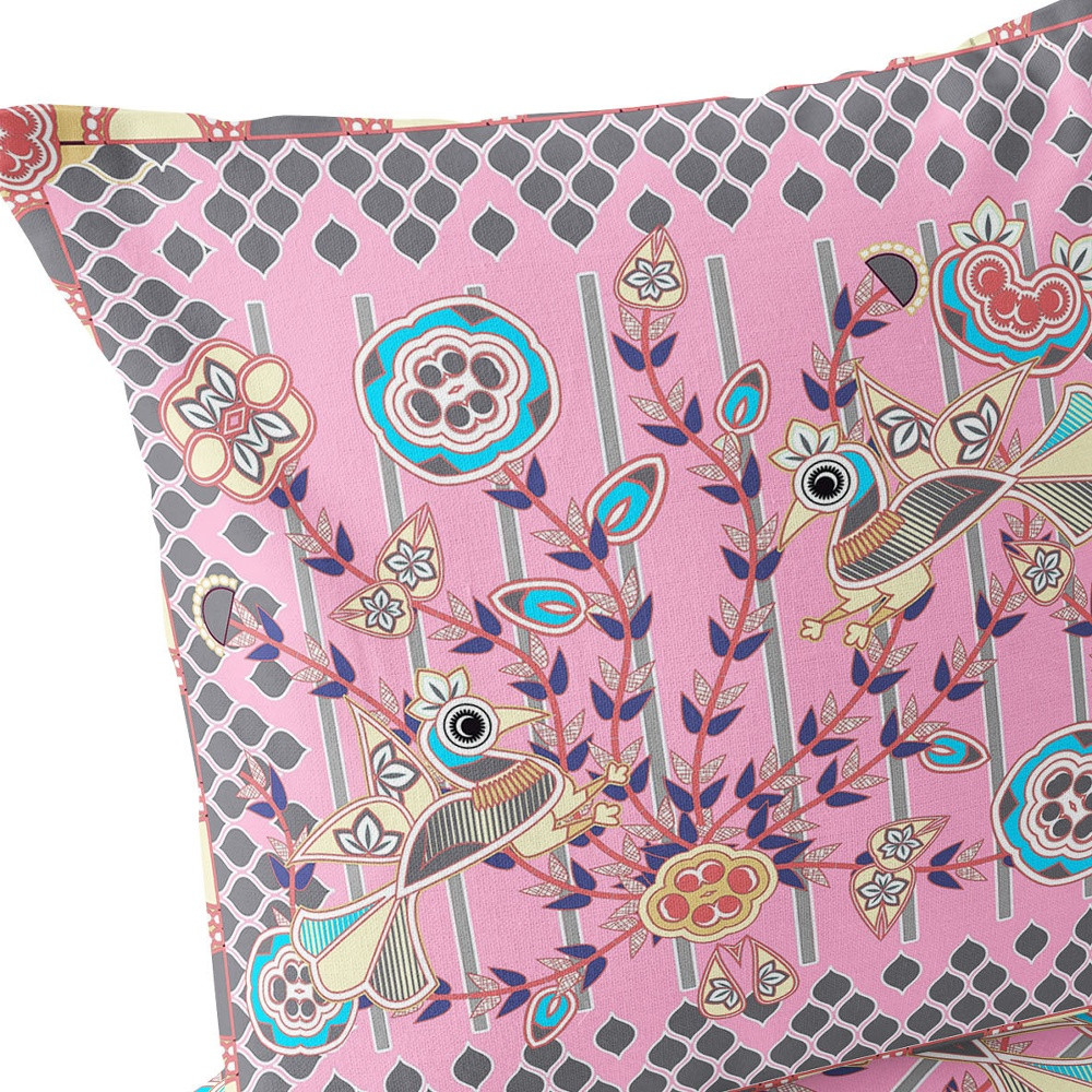 Pond Peacock Indoor/Outdoor Set of 2 Pillows in Pink Gray Sky Blue Cream