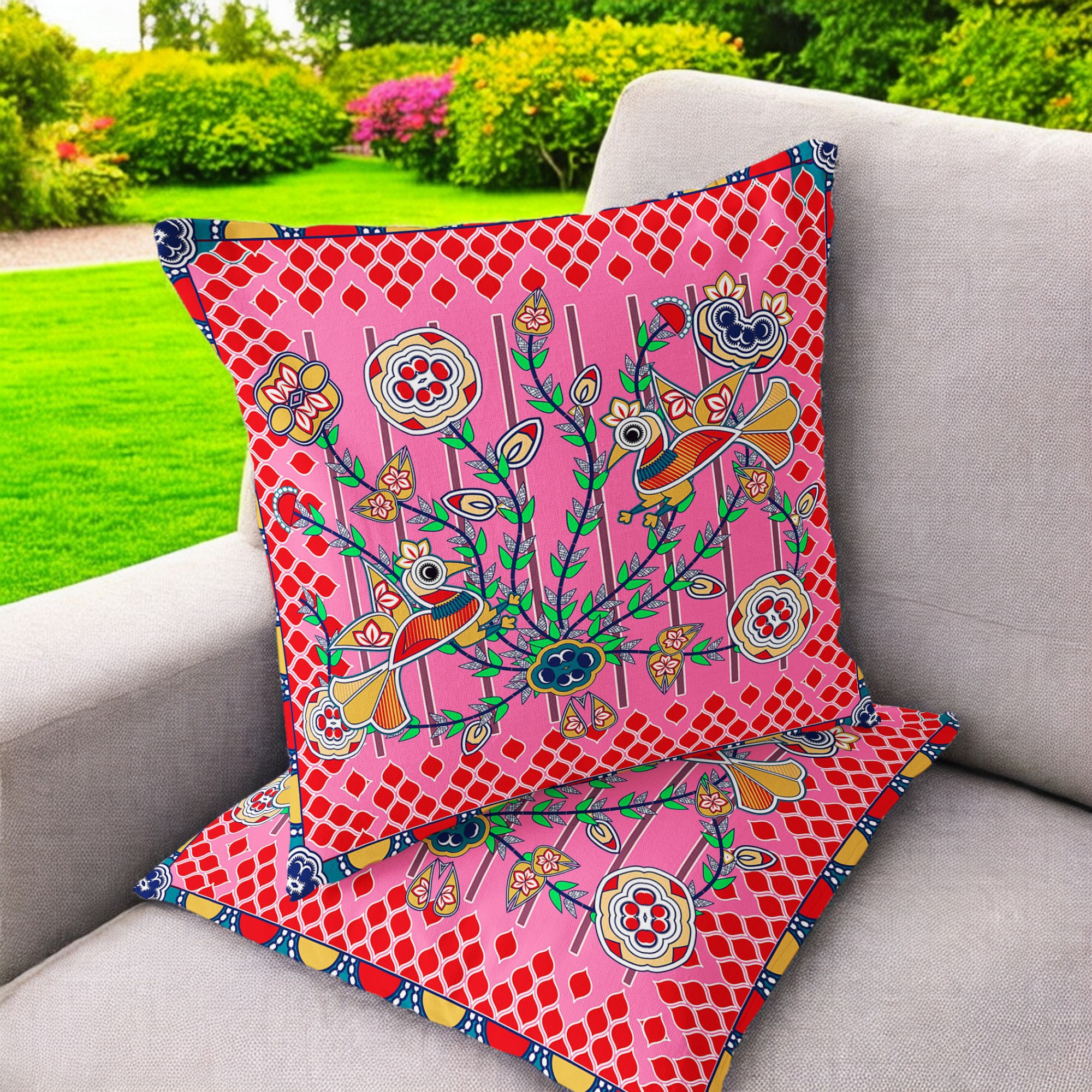 Pond Peacock Indoor/Outdoor Set of 2 Pillows in Pink Red
