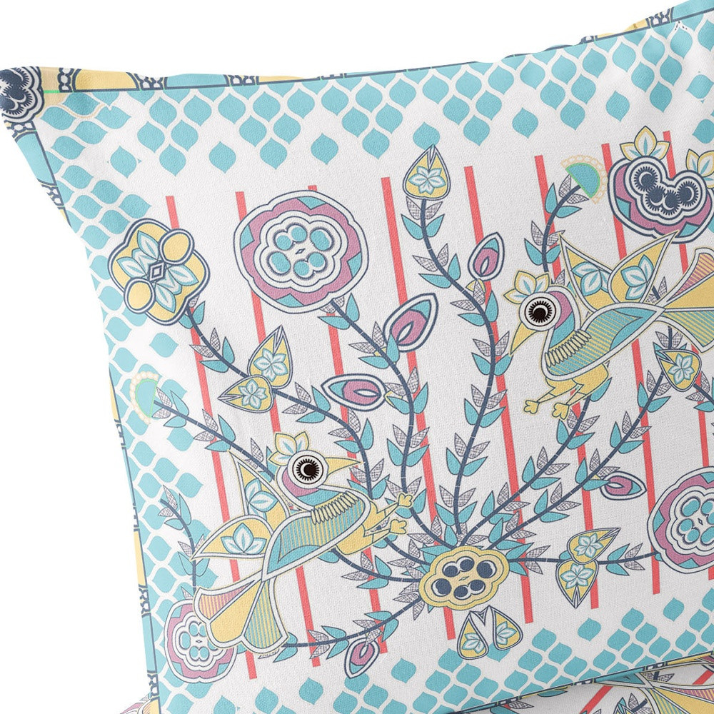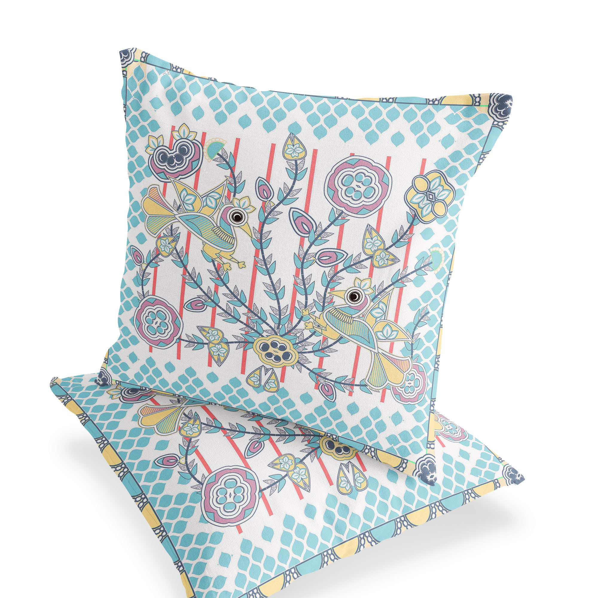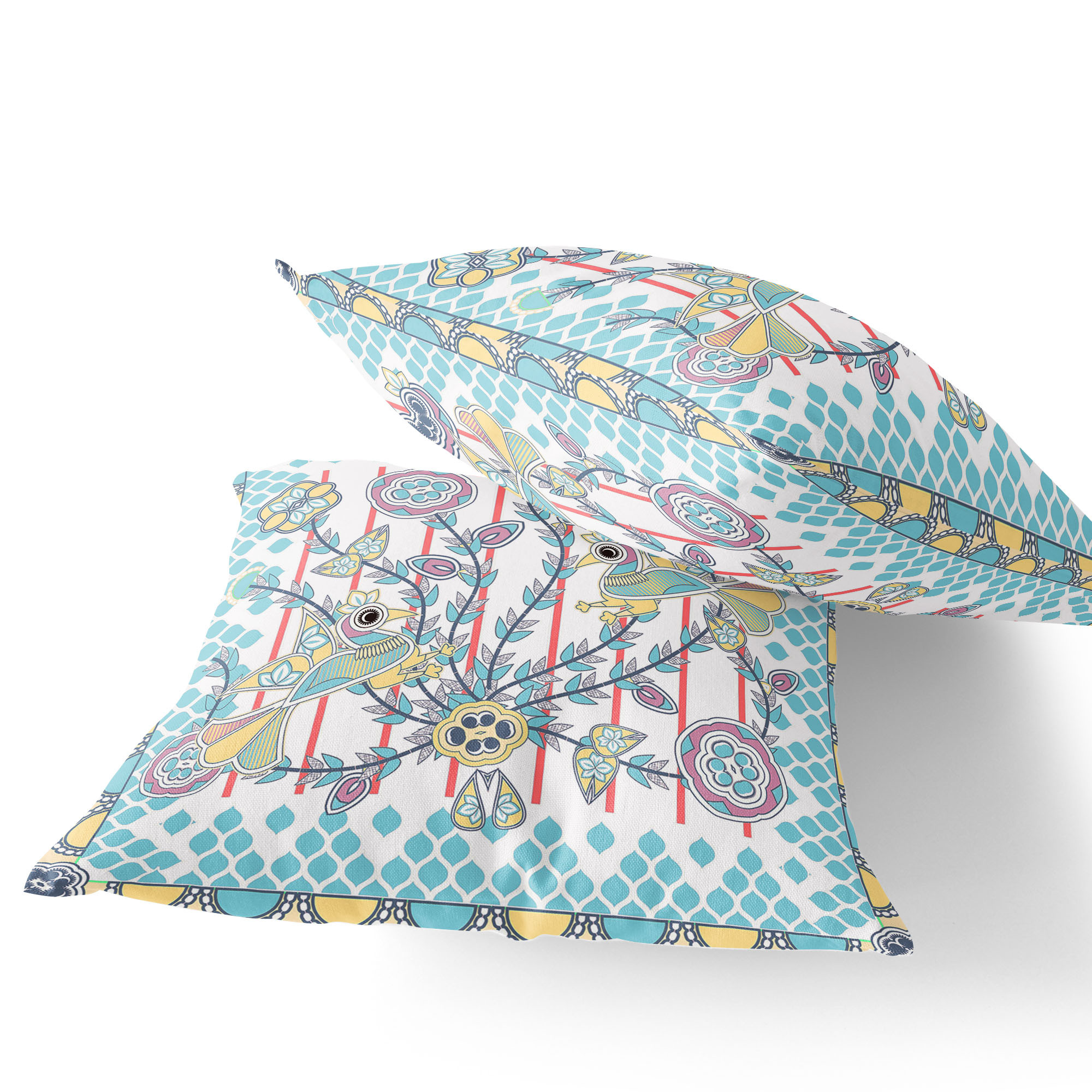 Pond Peacock Indoor/Outdoor Set of 2 Pillows in White Light Blue Muted Yellow
