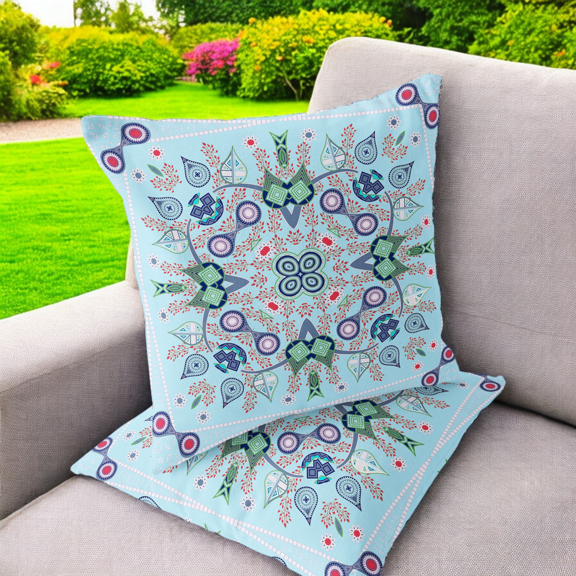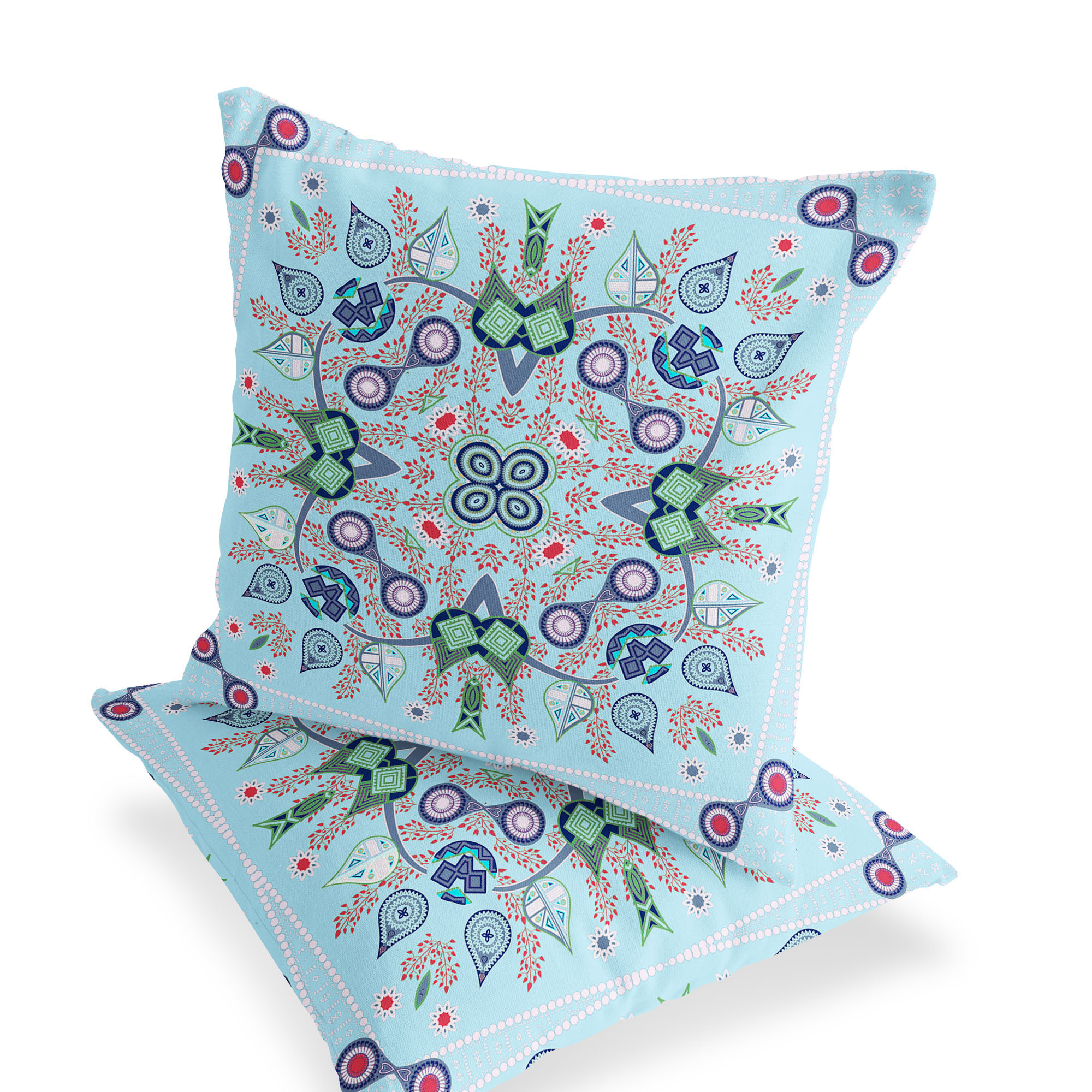 Paisley Leaf Geo Indoor/Outdoor Set of 2 Pillows in Light Blue Green Red