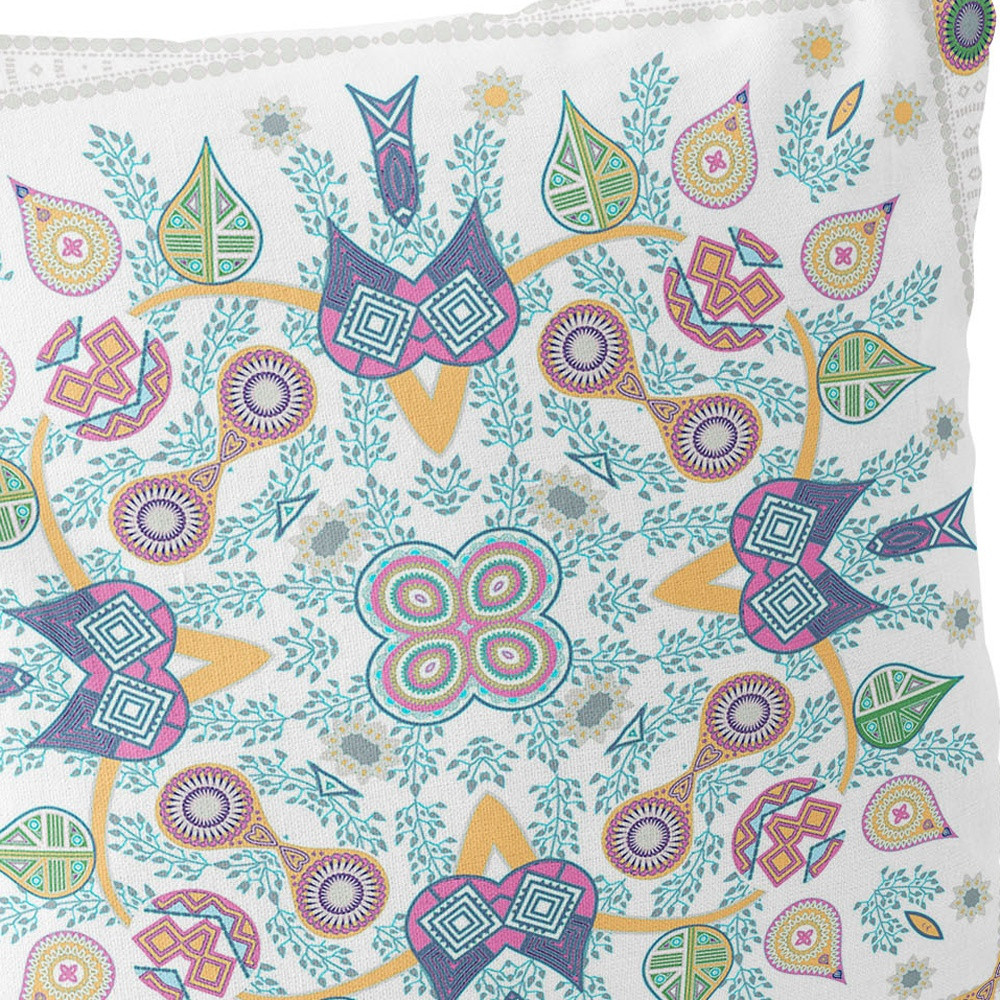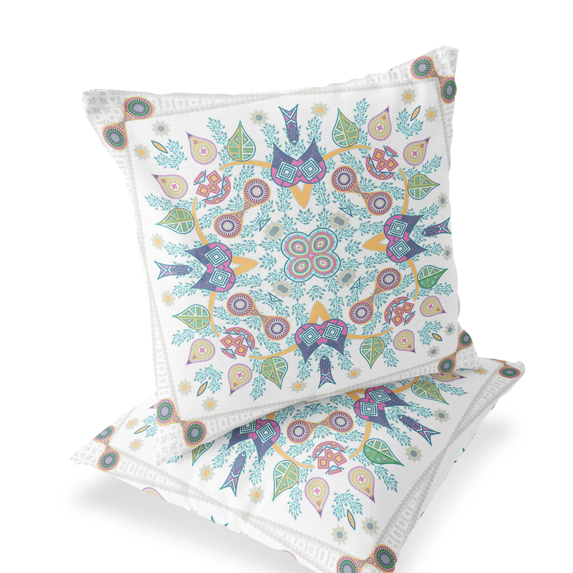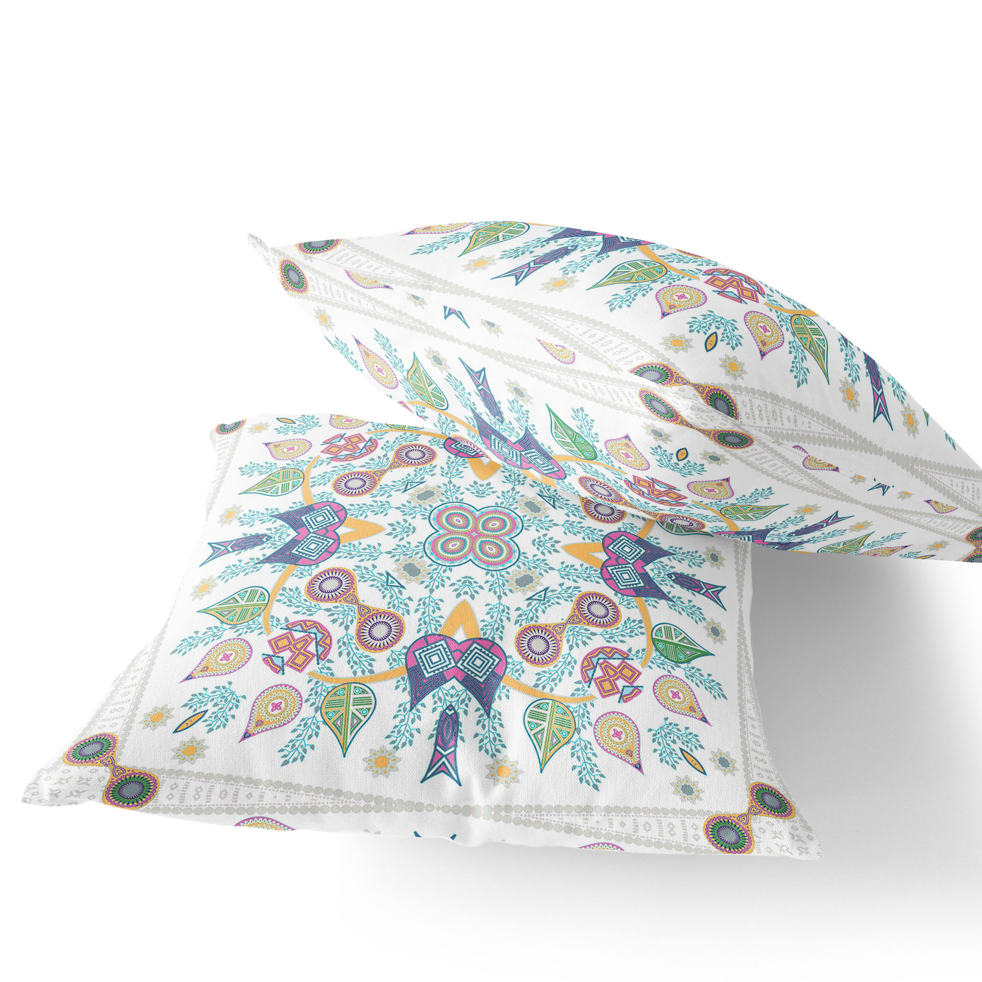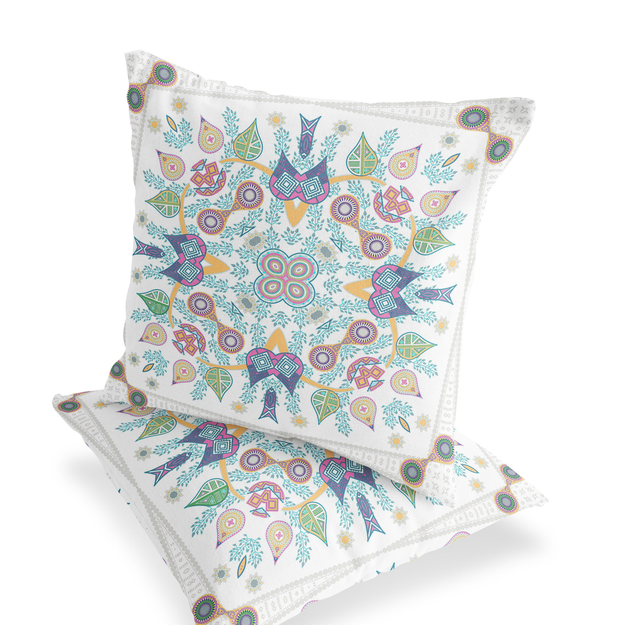 Paisley Leaf Geo Indoor/Outdoor Set of 2 Pillows in White Pink Yellow Light Green