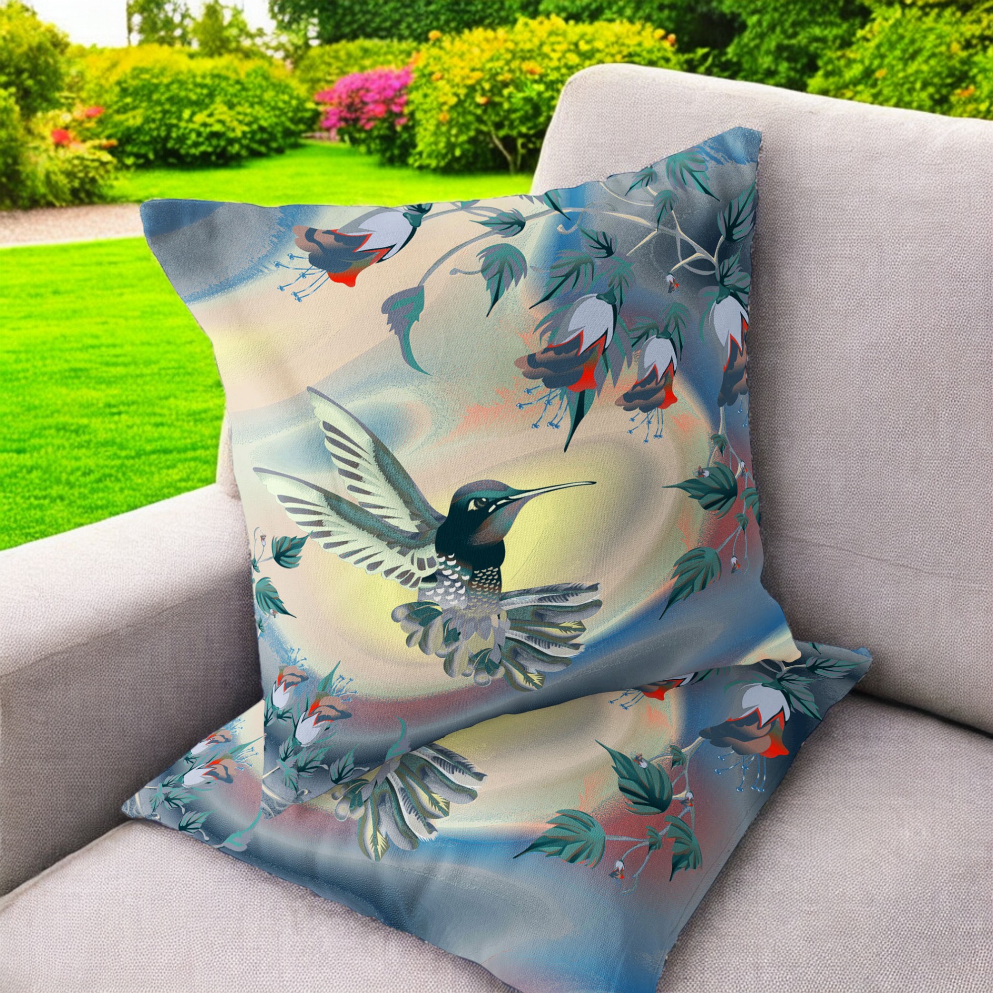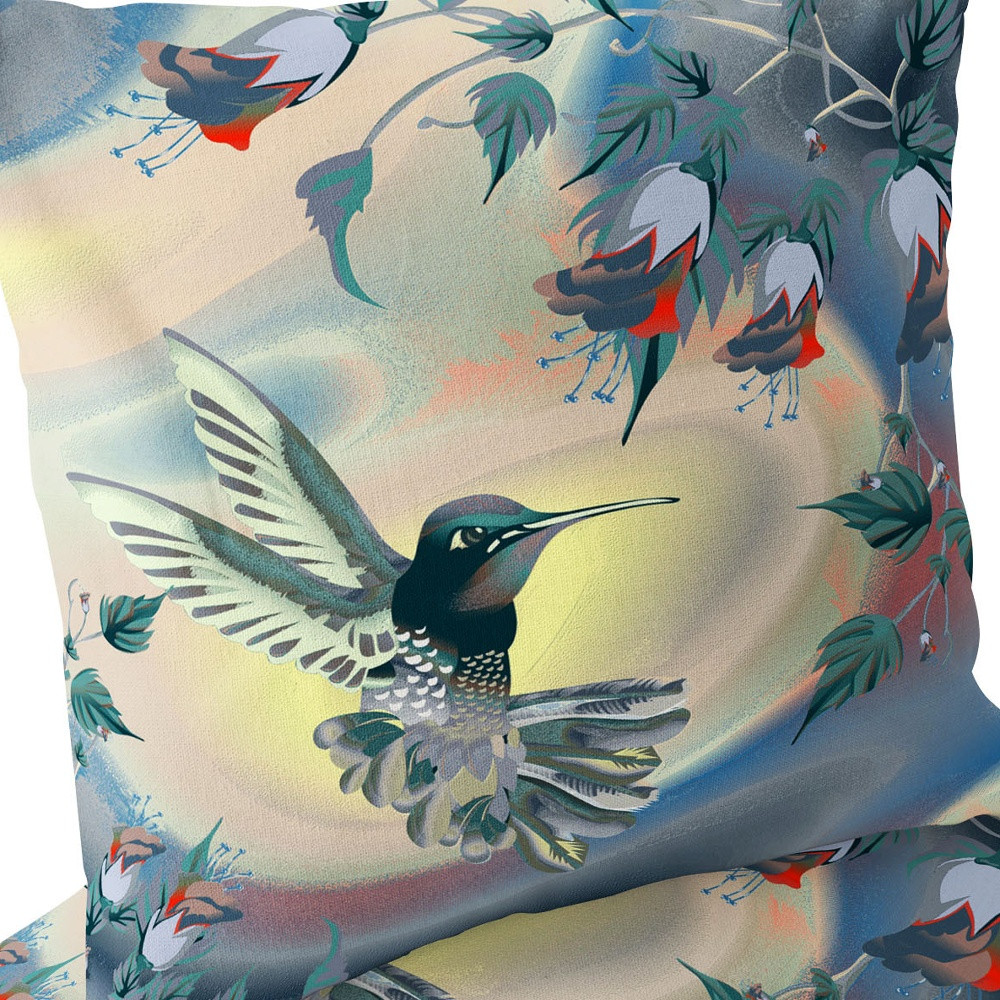Curious Humming Bird Indoor/Outdoor Set of 2 Pillows in Yellow Green Blue