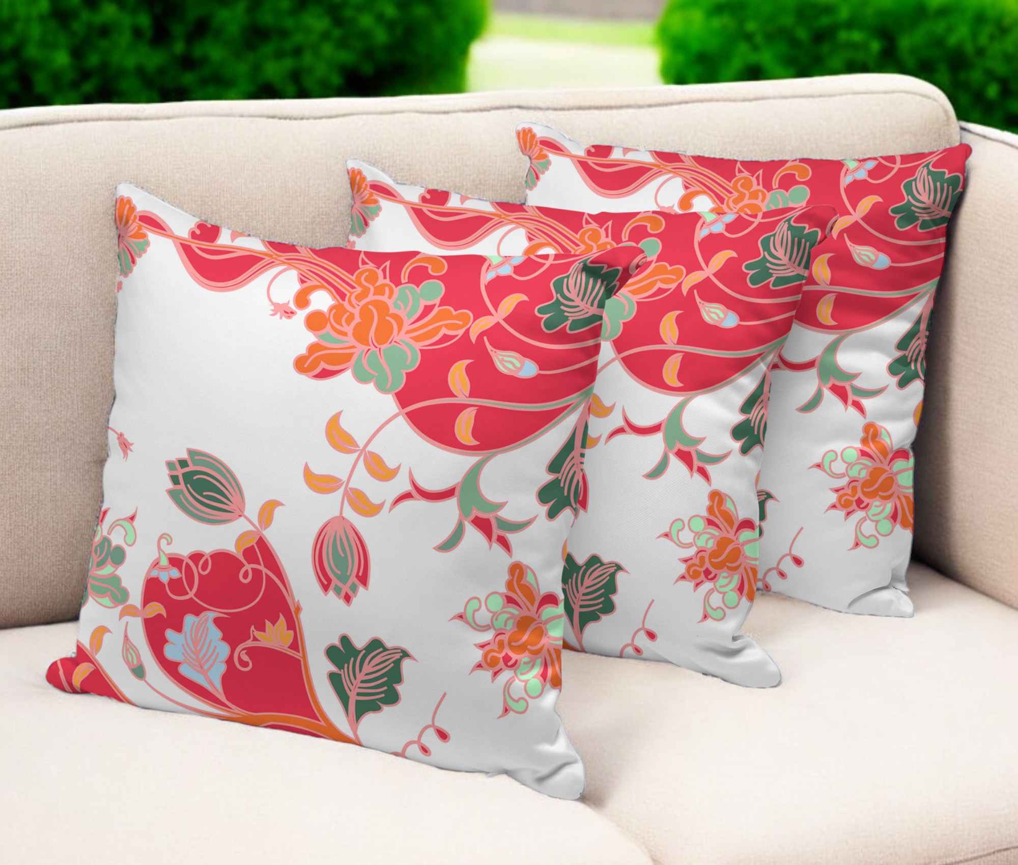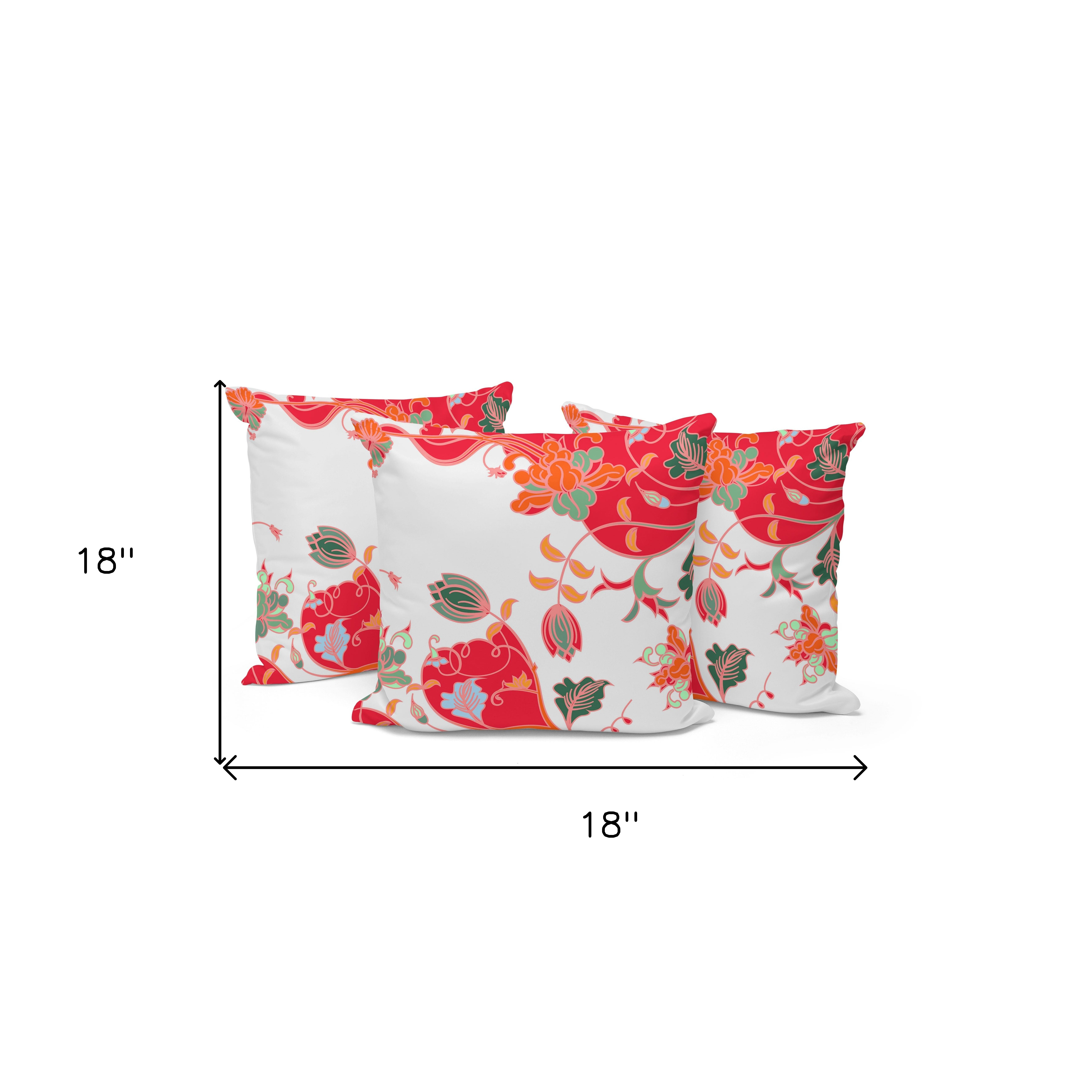 Set of Three Red Botanical Indoor Outdoor Throw Pillow