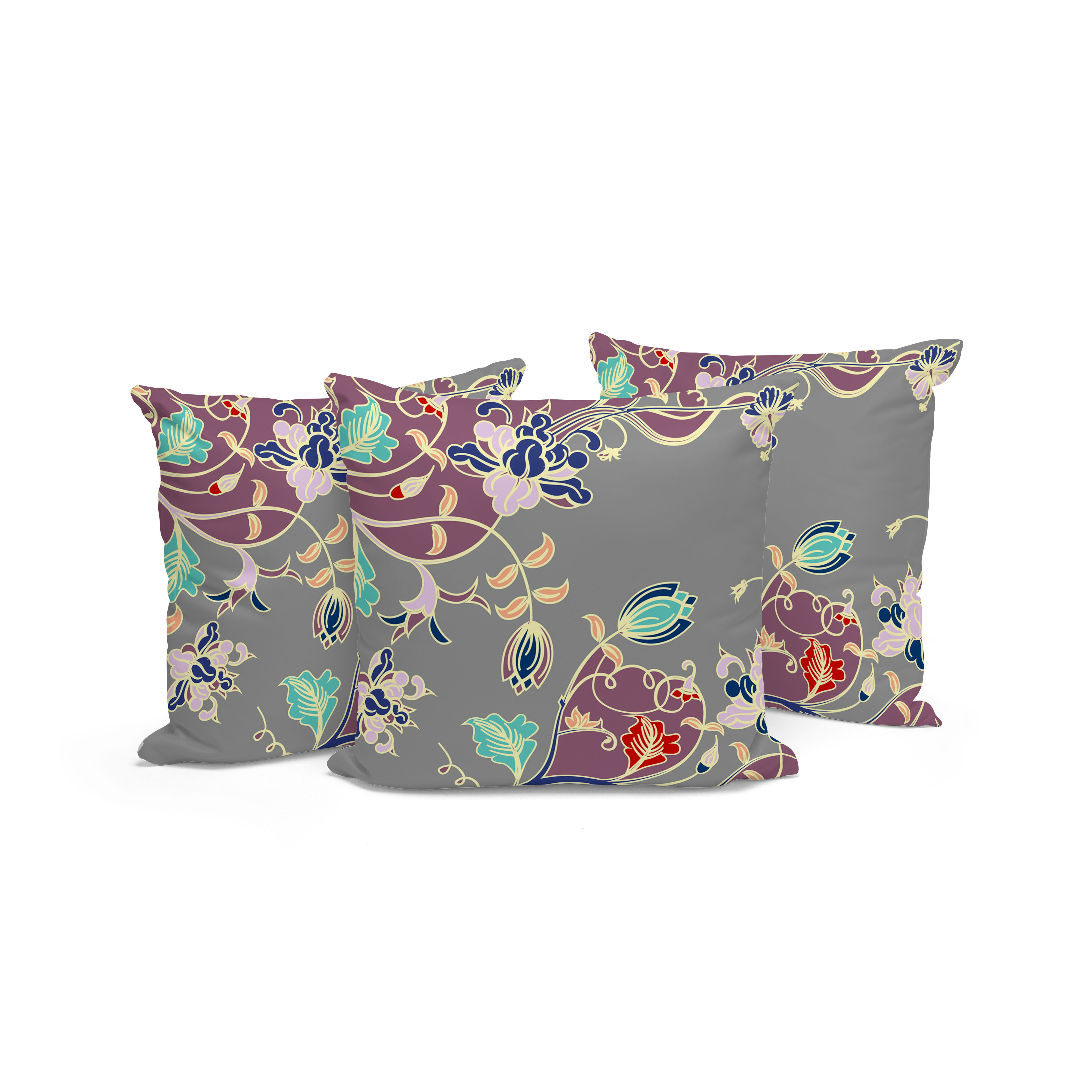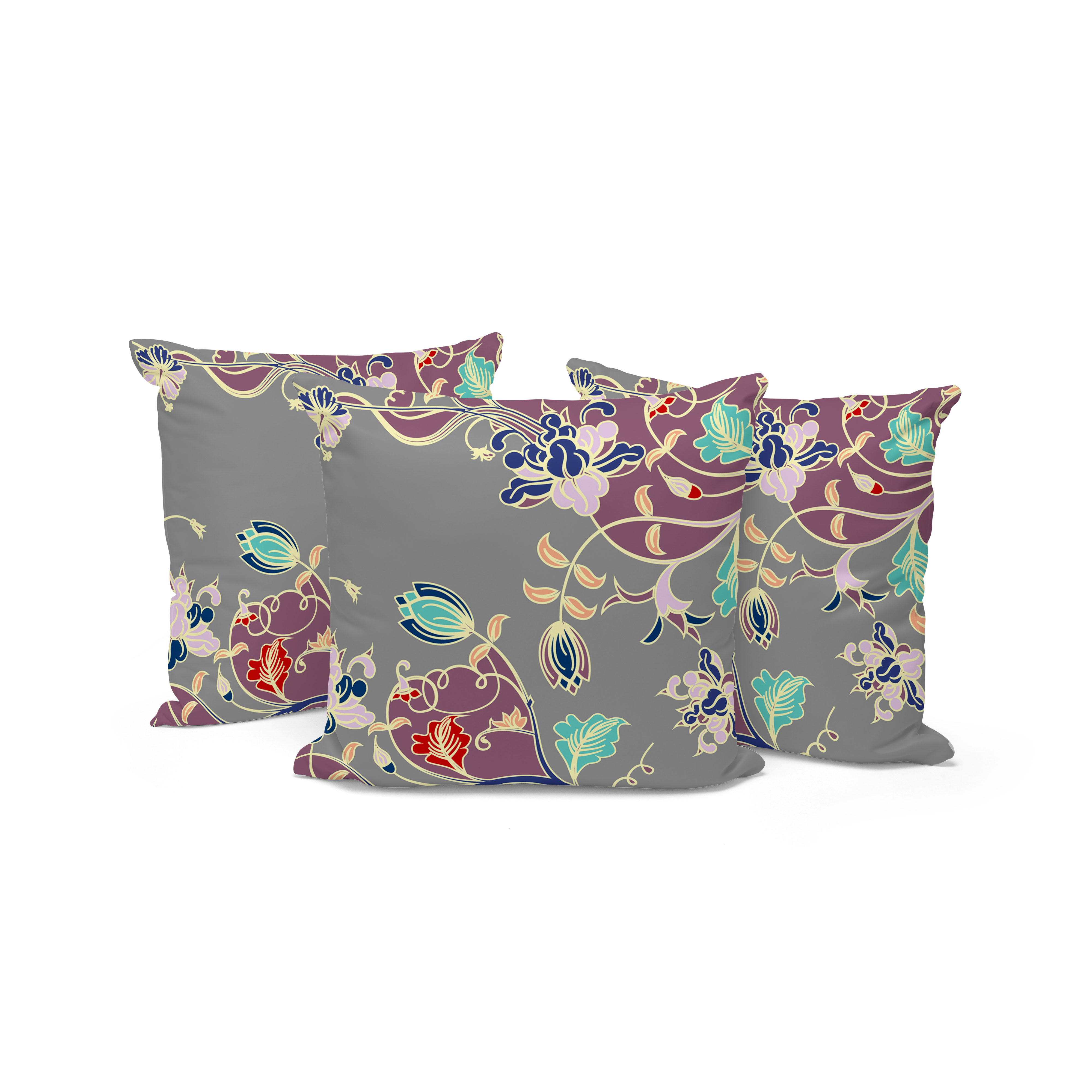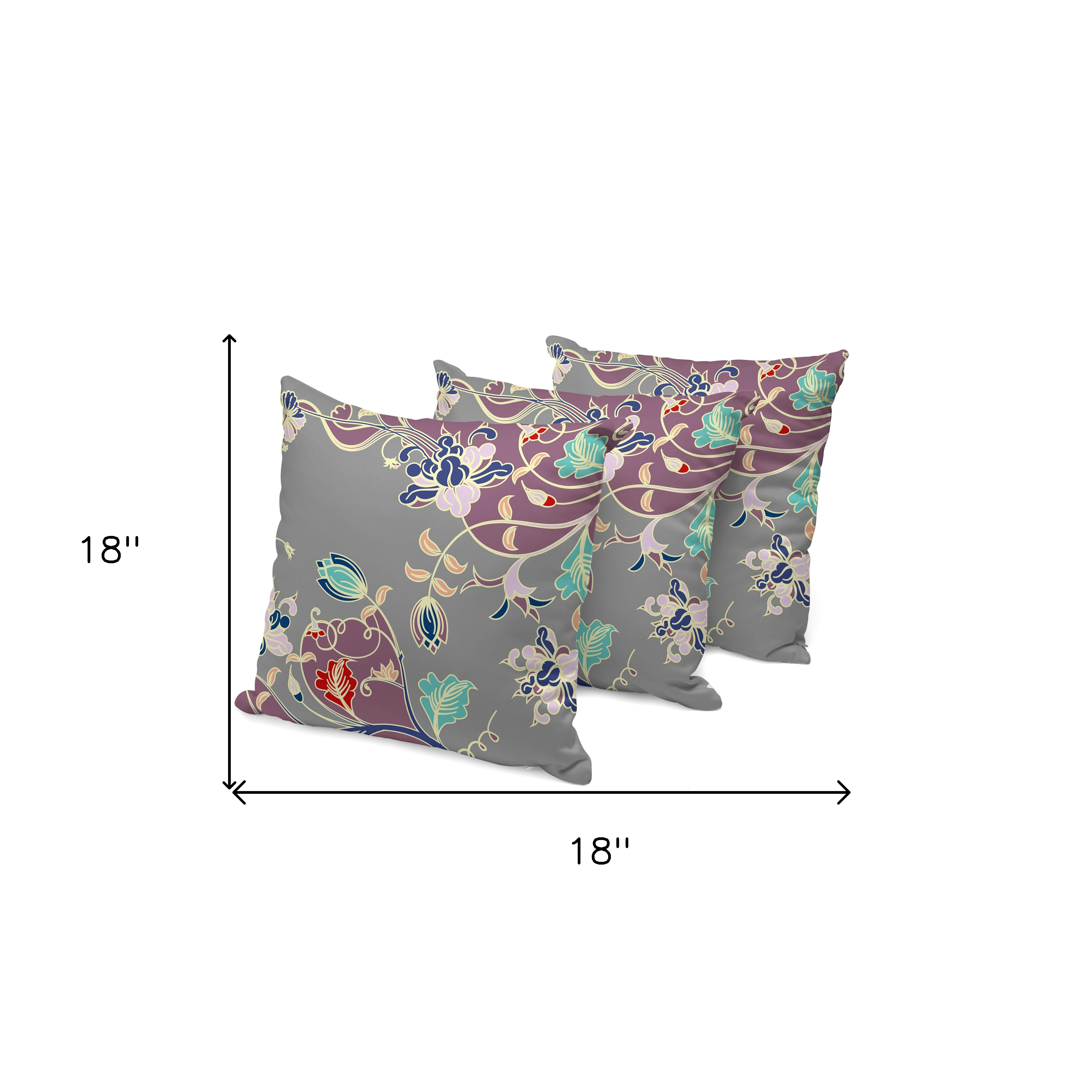 Carnation Vines Indoor/Outdoor Set of 3 Pillows in Purple On Gray