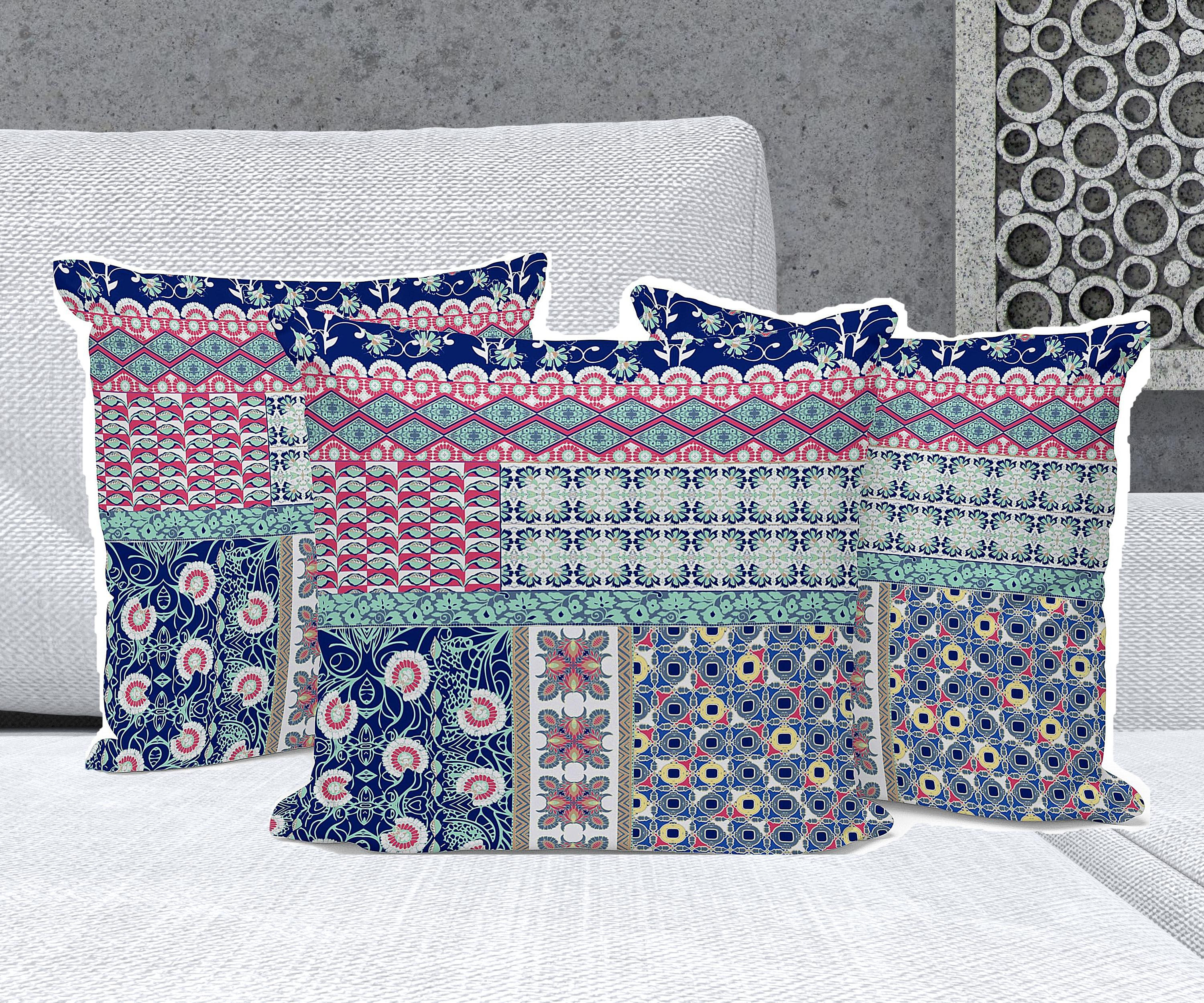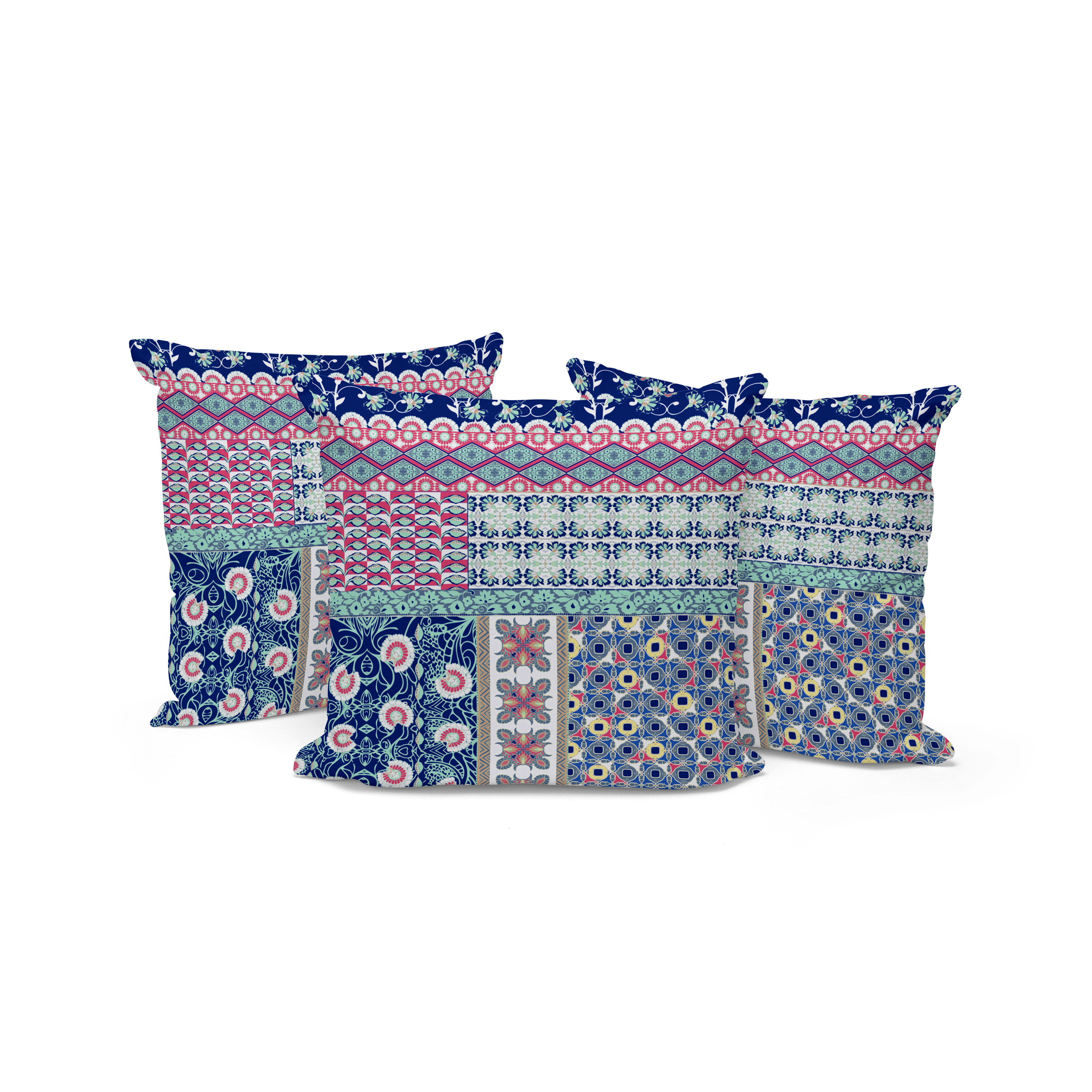 Flower Castle Patchwork Indoor/Outdoor Set of 3 Pillows in Blue Pink