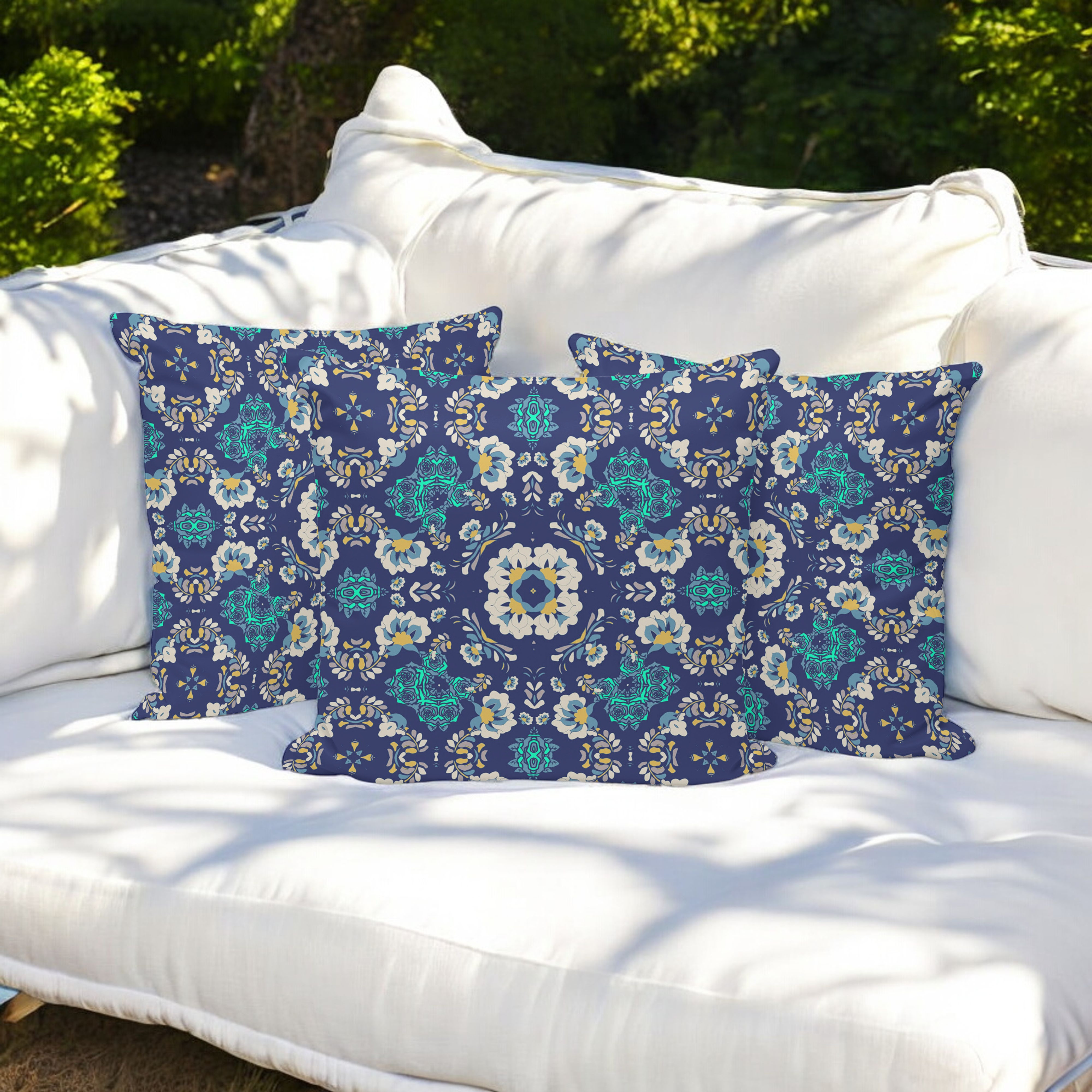 Set of Three Blue Botanical Indoor Outdoor Throw Pillow