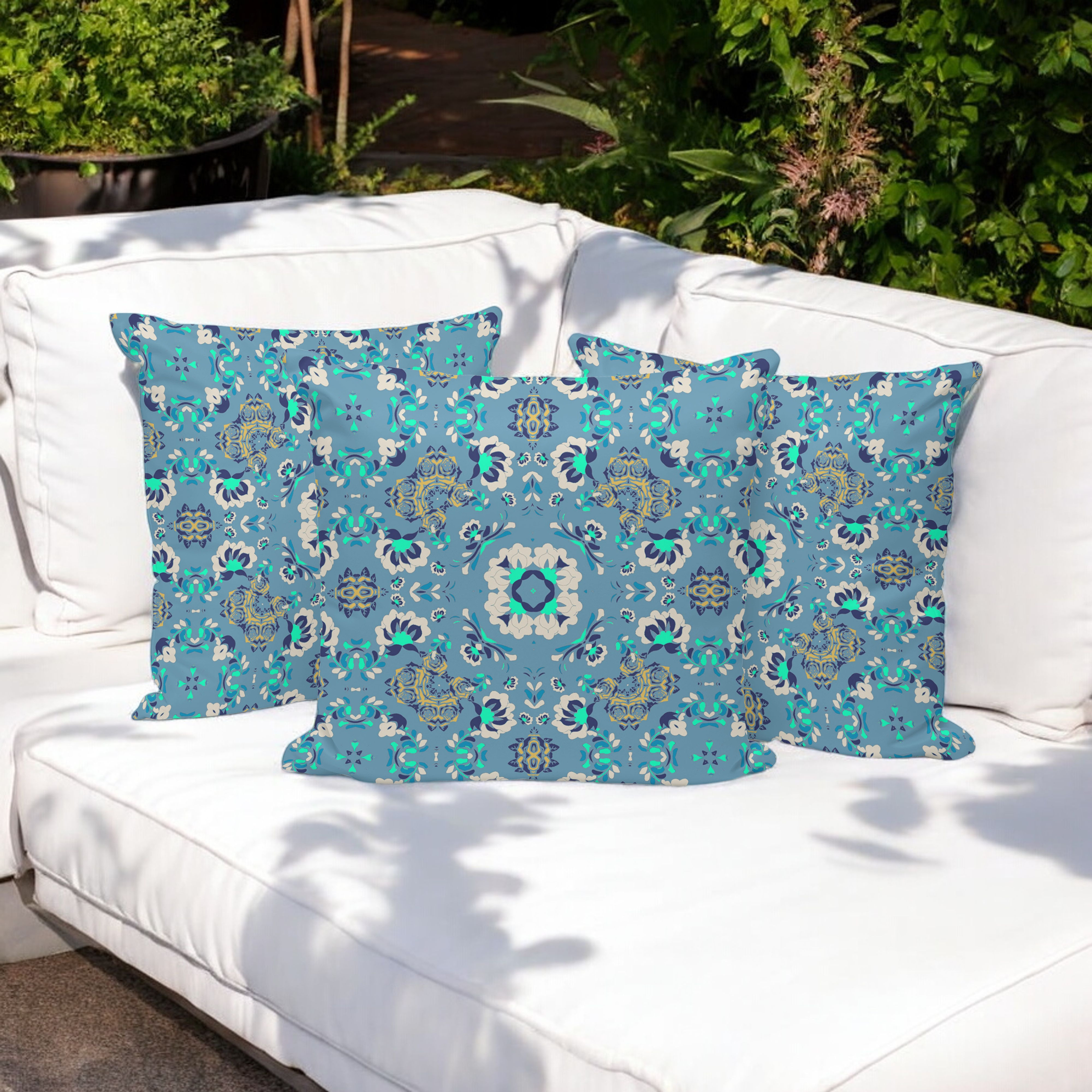 Set of Three Blue Botanical Indoor Outdoor Throw Pillow