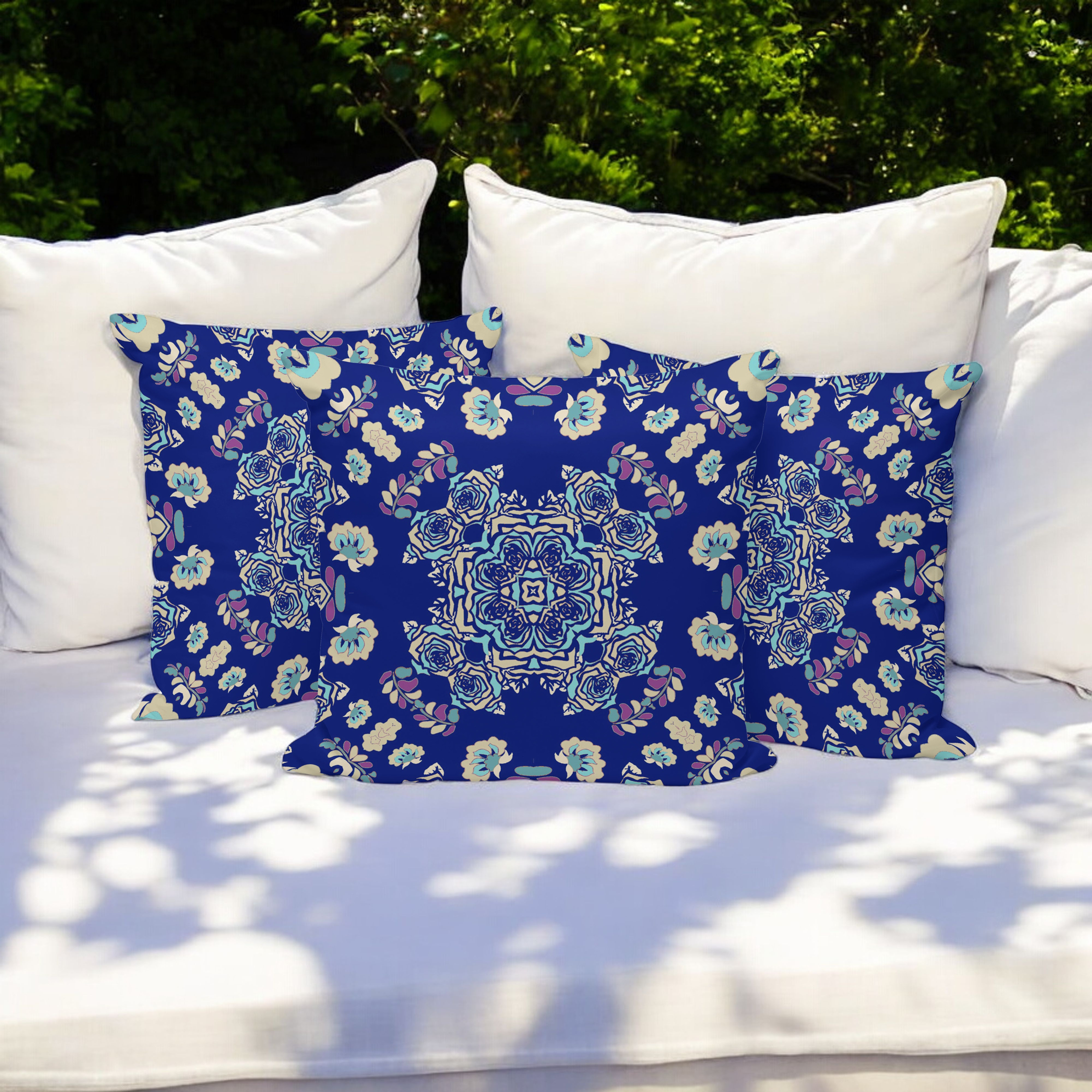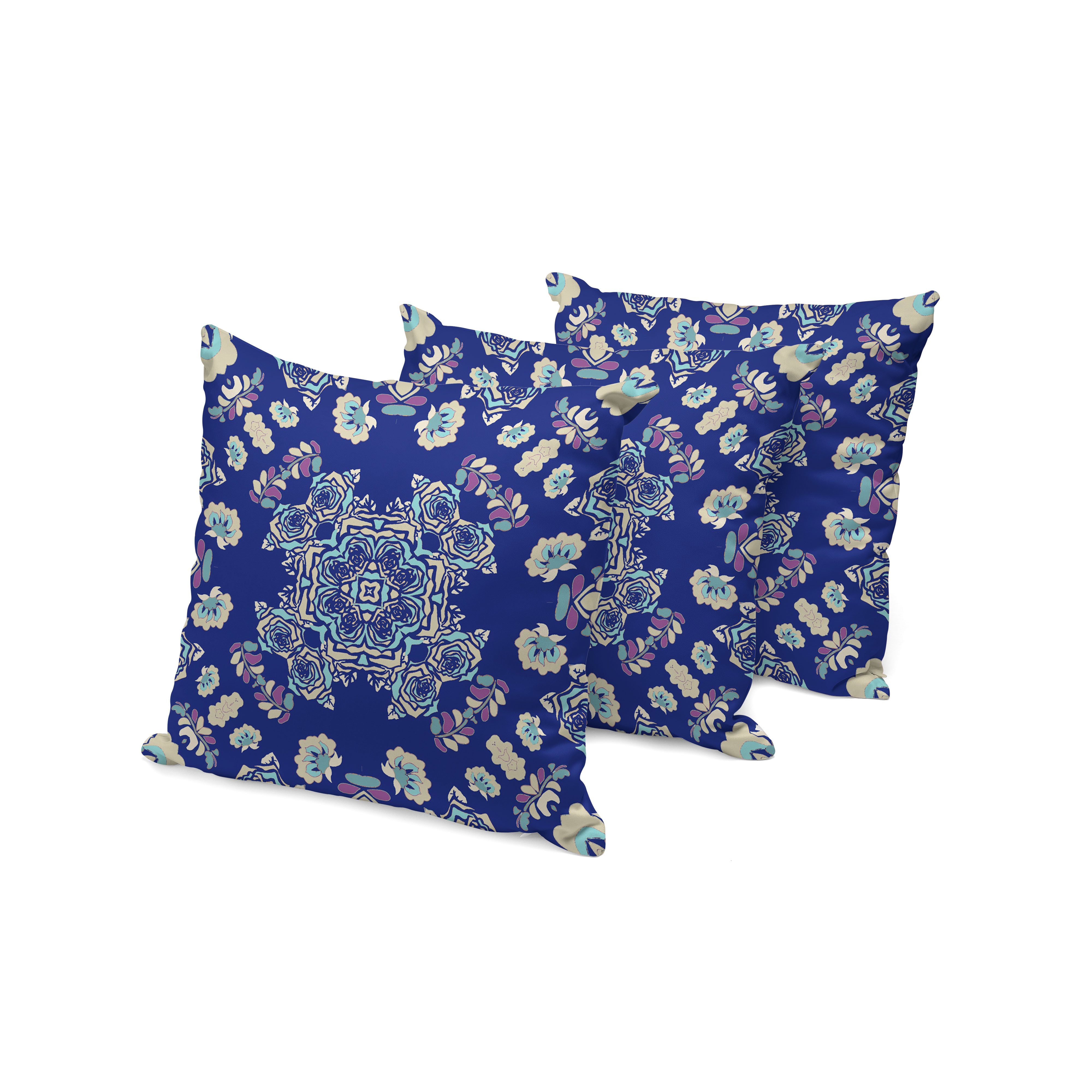 Set of Three Blue Botanical Indoor Outdoor Throw Pillow