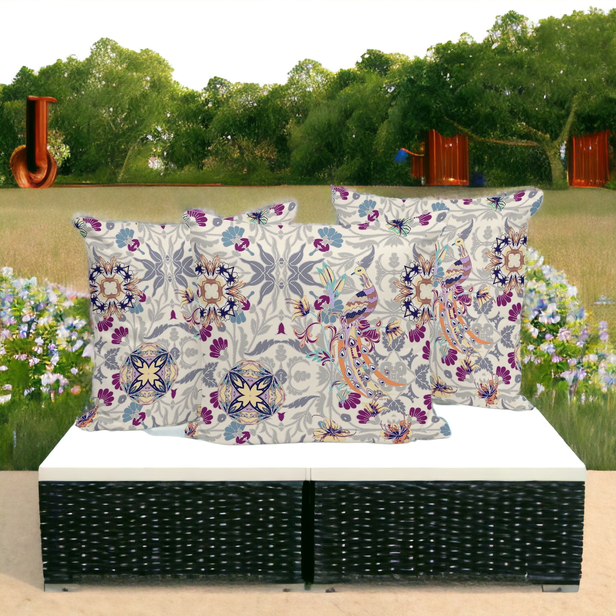 Set of Three Off White Peacock Abstract Indoor Outdoor Throw Pillow